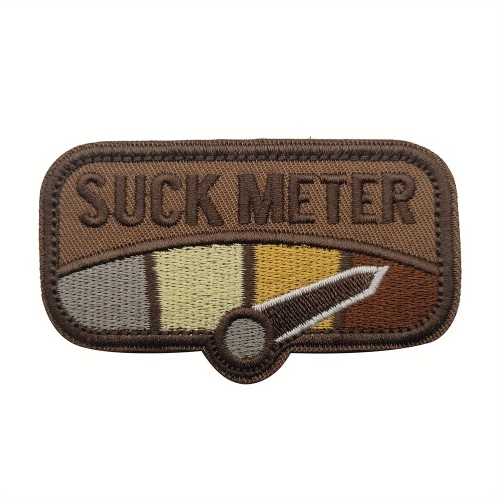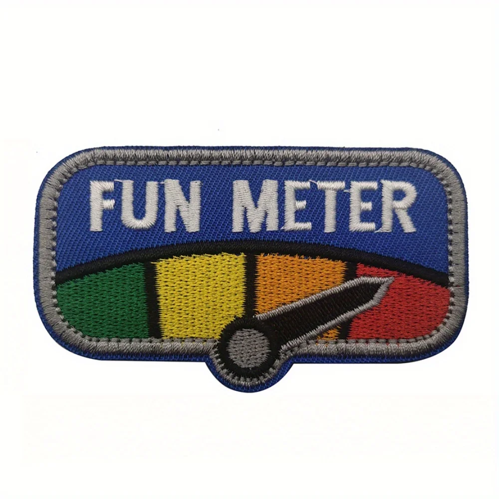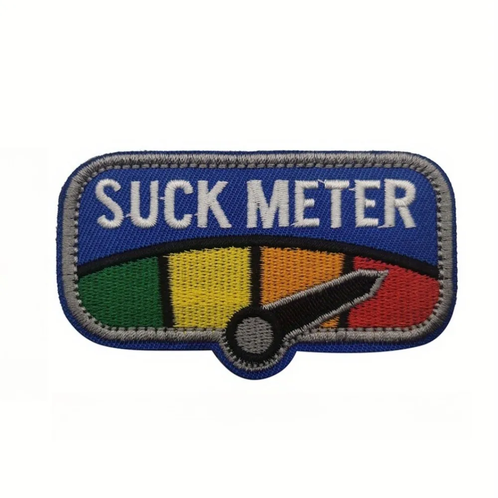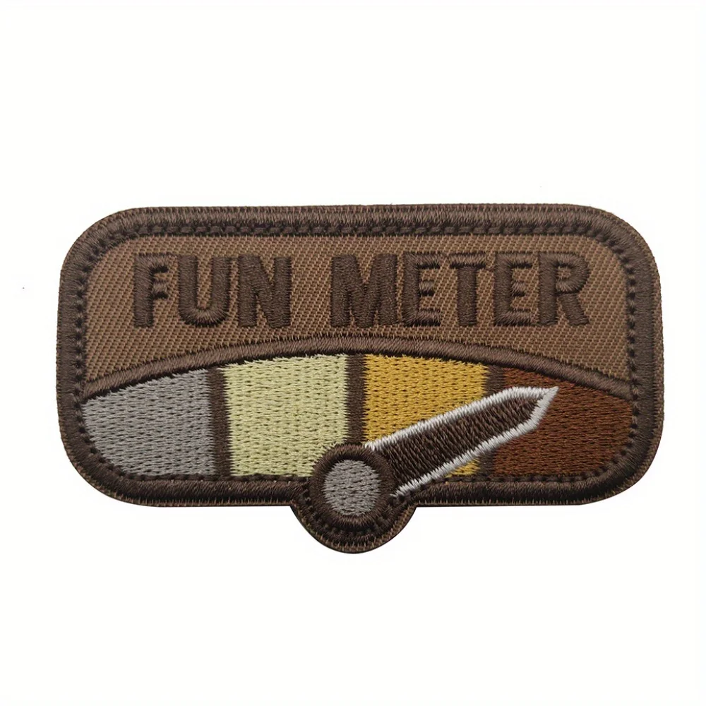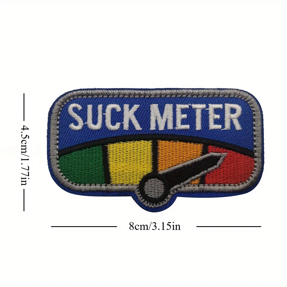 - Displays clear, capitalized text (“FUN METER” or “SUCK METER”) at the top, combined with a meticulously embroidered gauge graphic, adding a bold visual statement.