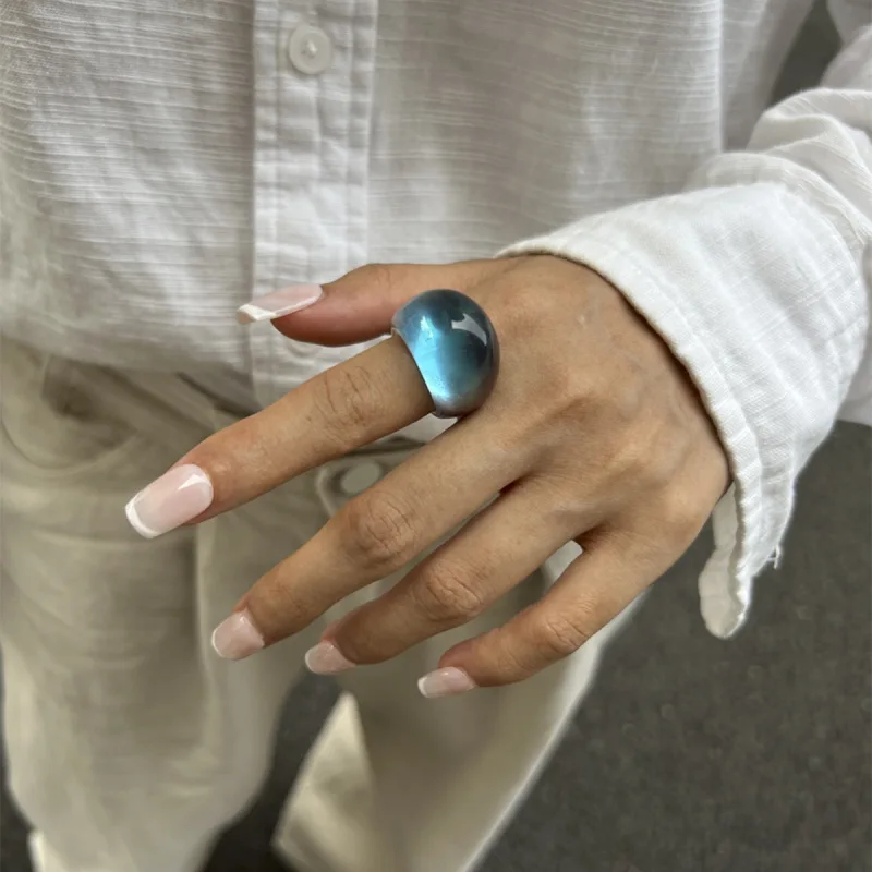 This trendy women’s wide ring, model R982, features a bold geometric design crafted from colorful resin, available in styles 1 through 15 with distinct color patterns including vibrant yellow, pastel blue, smoky gray, and lime green. The glossy, smooth finish enhances its chunky, oversized silhouette, making it a statement piece for casual, fashion-forward, and punk or gothic-inspired styles. Perfect for various occasions such as parties, anniversaries, or as a gift for loved ones, this versatile accessory is universally compatible and designed to add a playful, youthful touch to your daily wardrobe.