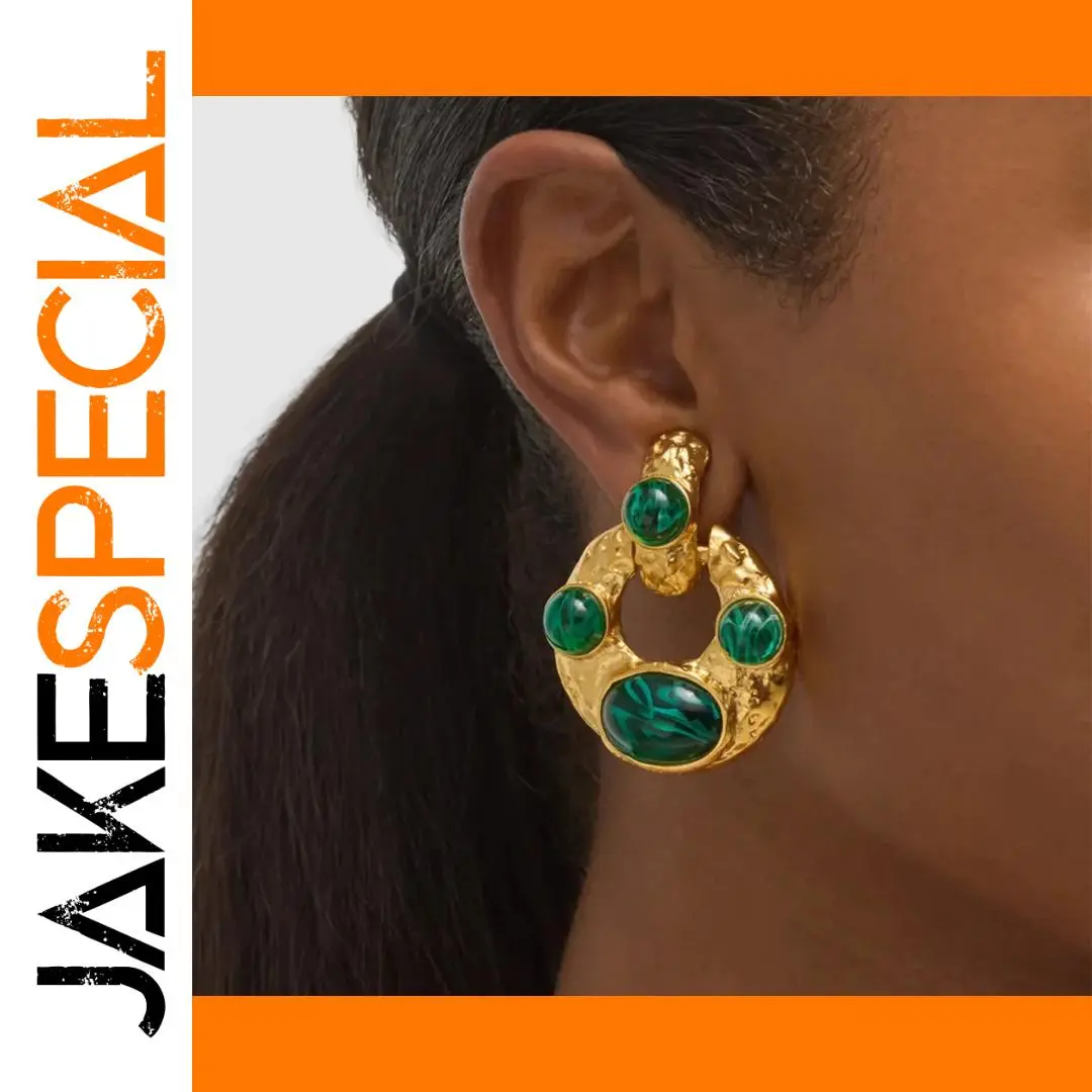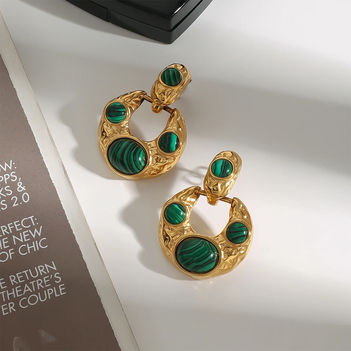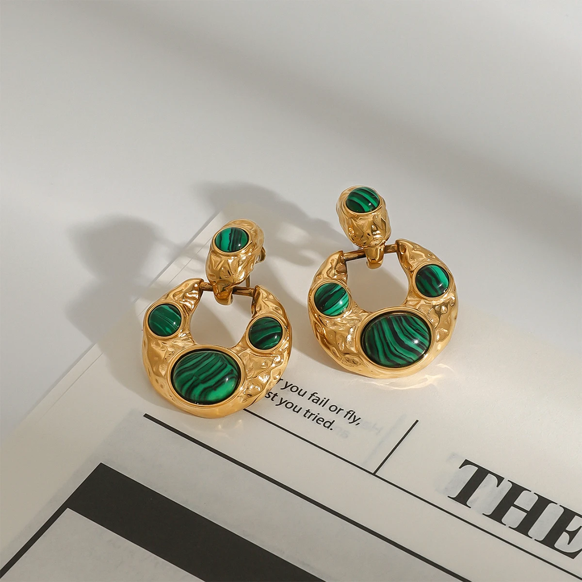 Experience the allure of these retro geometric elliptical earrings, designed to elevate your fashion statement. Crafted from stainless steel with a durable PVD gold finish, these earrings showcase a textured, irregular surface that captures attention. The semi-circular shape with an open center offers a contemporary aesthetic, combining luxury and modernity. Adorned with four marbled green stones resembling malachite, strategically placed for visual balance, they add vibrant contrast to the rich gold tone. Weighing 15 grams, they are substantial yet comfortable for all-day wear. Perfect for women seeking a statement accessory, these earrings celebrate bold, trendsetting style while offering long-lasting durability and waterproof resistance.
