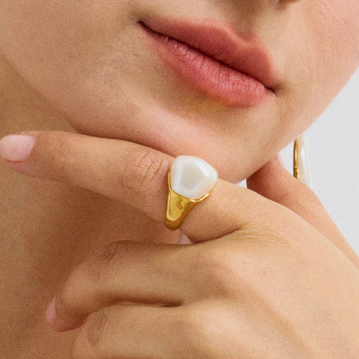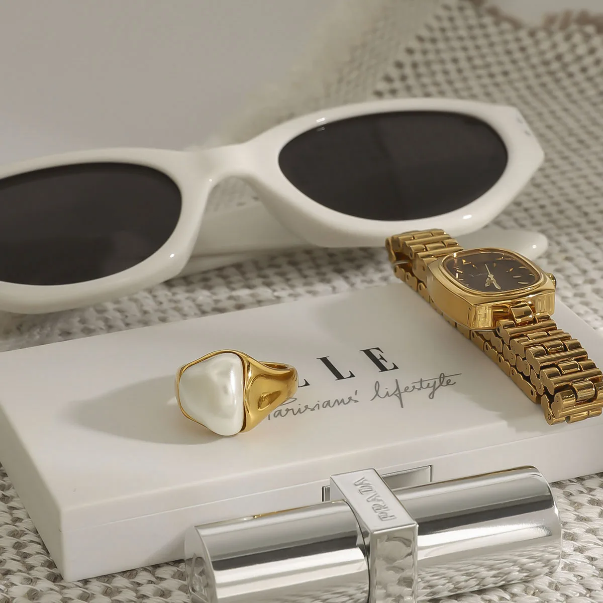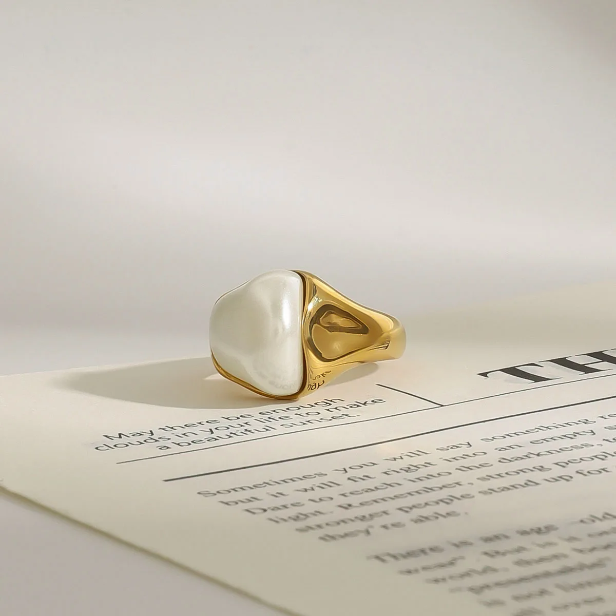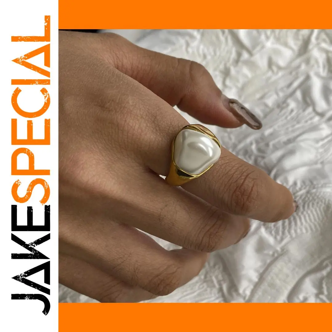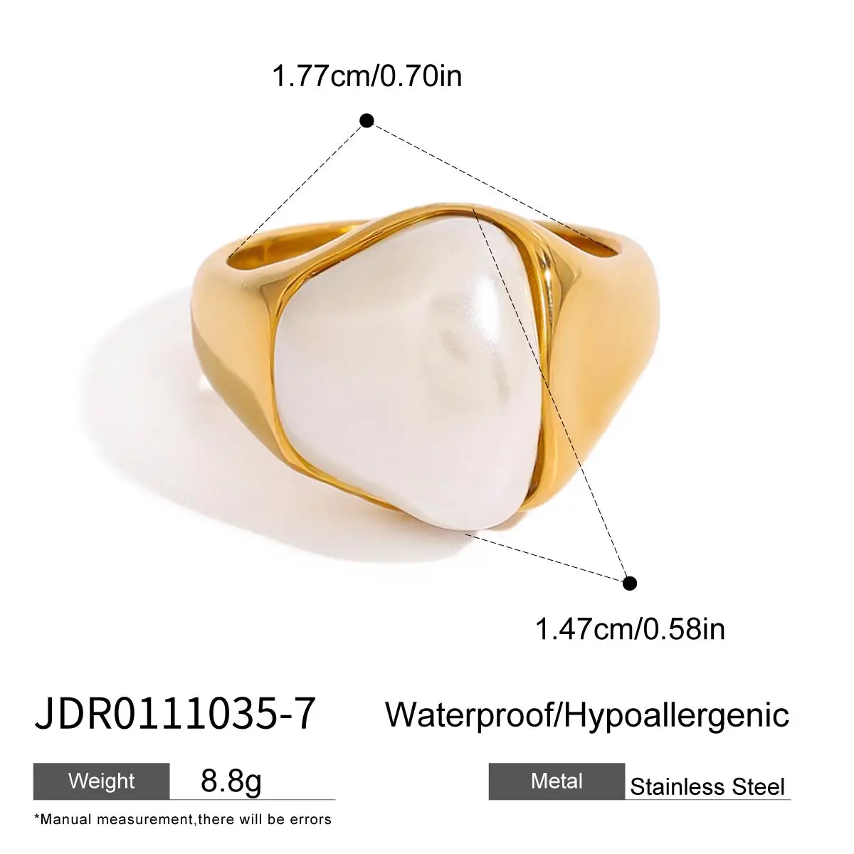 Elevate your style with this trendy women’s stackable ring, crafted from stainless steel with PVD gold for long-lasting color, anti-scratch durability, and water resistance. Featuring a striking geometric irregular pearl centerpiece with a lustrous white surface and a surface width of 2mm, it is securely set with a tension setting. The ring, size 7 and weighing approximately 15 grams, offers a bold yet sophisticated look perfect for parties or fashionable occasions. Its sleek, polished finish and modern design make it a versatile addition to any jewelry collection, allowing you to effortlessly express elegance and confidence in every wear.