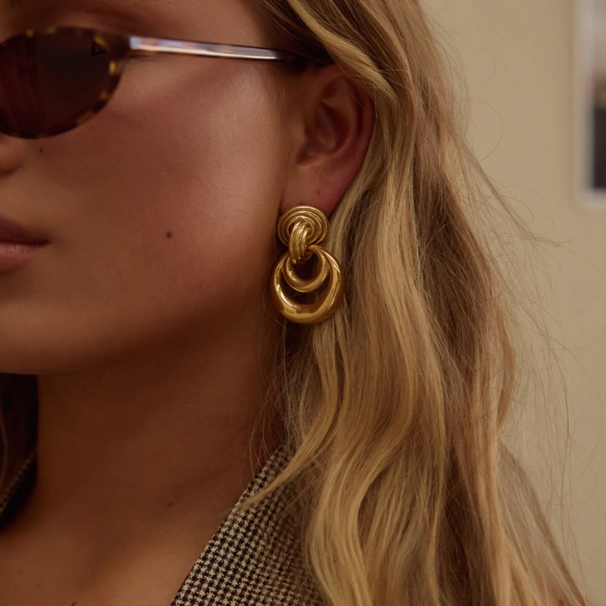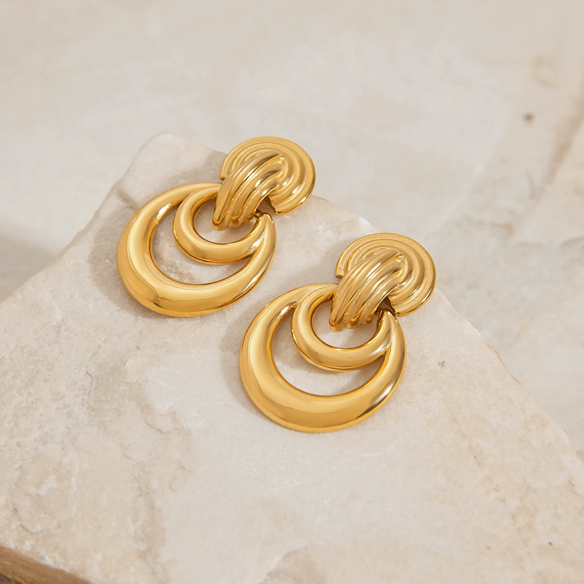 Elevate your style with these stunning statement earrings crafted from durable stainless steel with a PVD gold finish. Their large, hollow geometric drop shape creates a modern, eye-catching silhouette that effortlessly combines trendiness with sophistication. The layered circular design adds depth and movement, making them perfect for both casual outings and special occasions. With a weight of approximately 15 grams, these earrings provide a comfortable yet impactful wearing experience. Their polished, smooth surface reflects light beautifully, enhancing their luxurious appearance. Made from waterproof, allergen-free stainless steel, they are built to last and maintain their vibrant gold color for years. Whether you're dressing up or adding a bold touch to your everyday look, these earrings are an excellent choice to express your unique style.