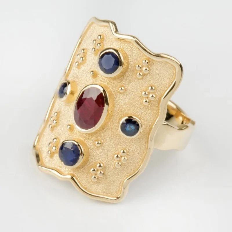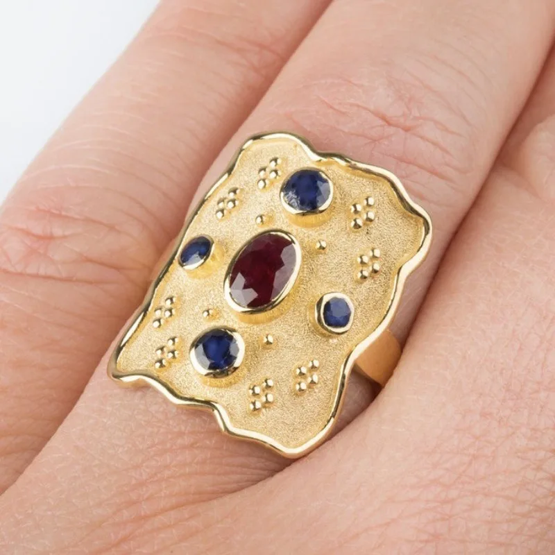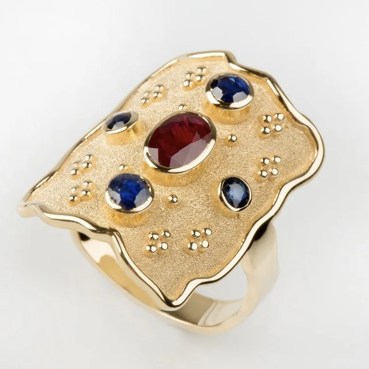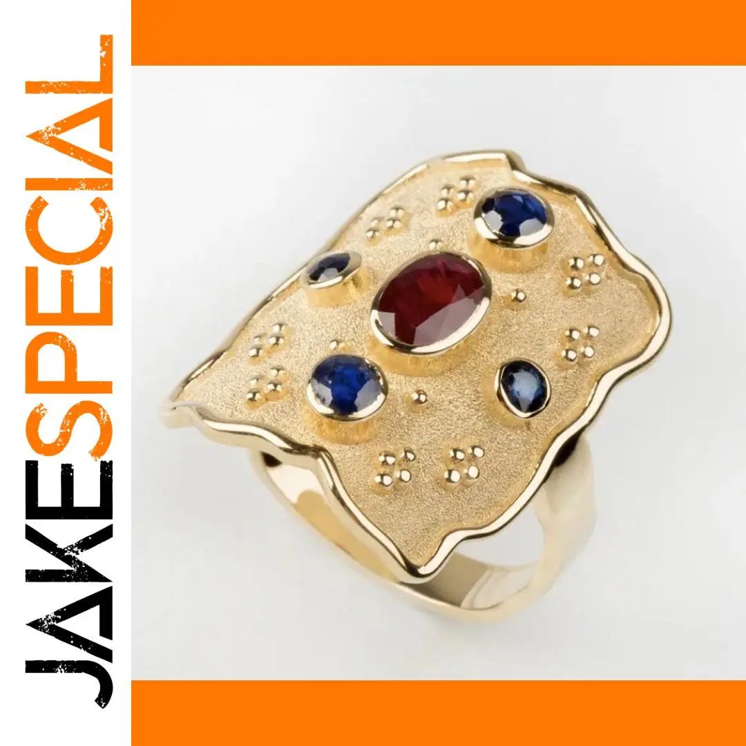 - Embedded with five zircon stones: one large, deep red oval center stone and four smaller, vivid blue round stones, enhancing visual appeal with sparkling brilliance.