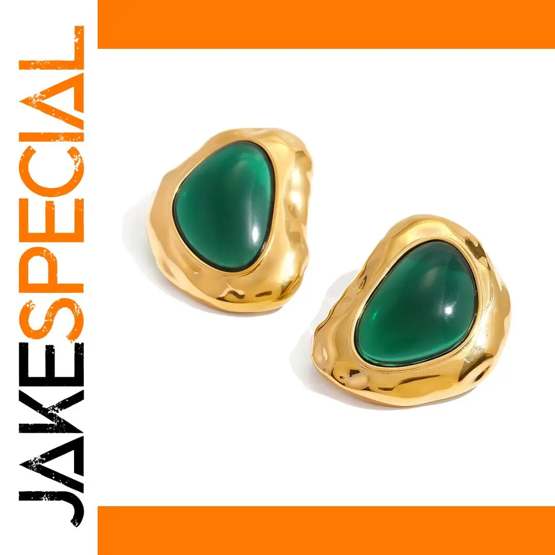 These model JDE2410010 stainless steel stud earrings feature irregular green resin centers with a glossy, smooth finish, encased in a thick, shiny gold-colored stainless steel frame with textured, wavy details. Crafted from high-quality, durable stainless steel, they are resistant to tarnishing, waterproof, and hypoallergenic, ensuring skin-safe wear. Designed for pierced ears, they offer a comfortable and secure fit, making them perfect for daily wear or special occasions. The bold, organic shape combined with a luxurious gold finish creates a striking blend of modern and vintage aesthetics, adding a fashionable statement to any outfit.