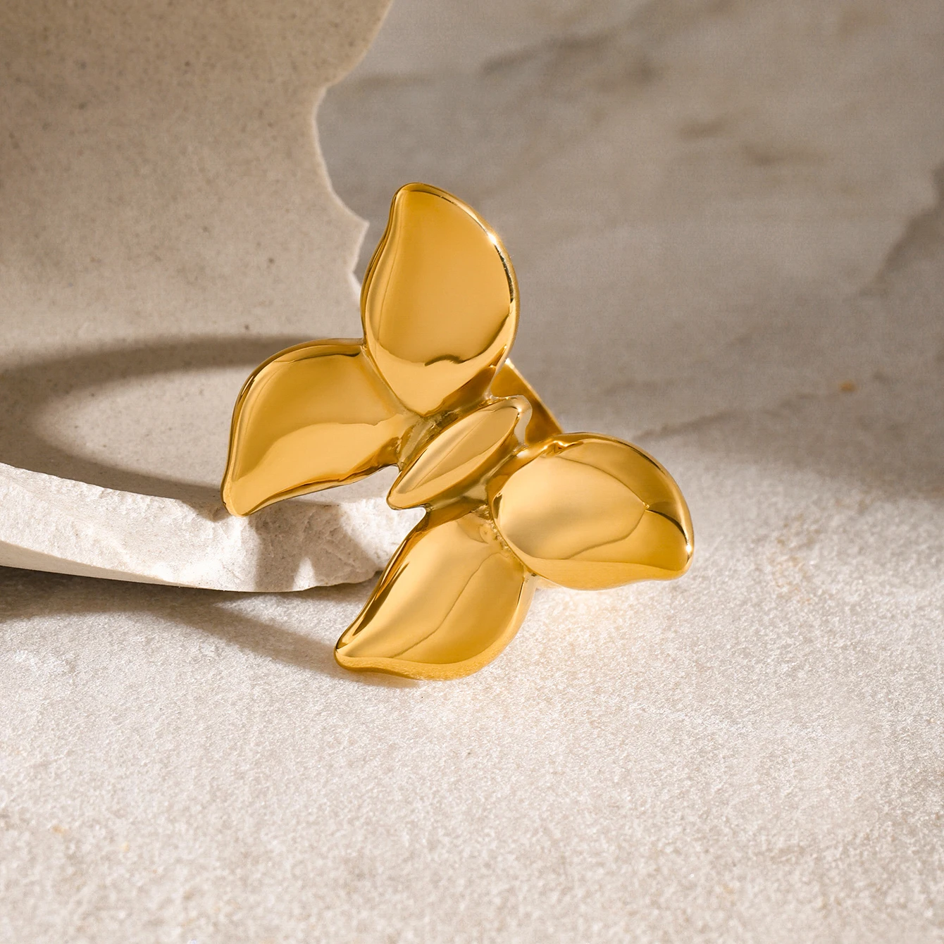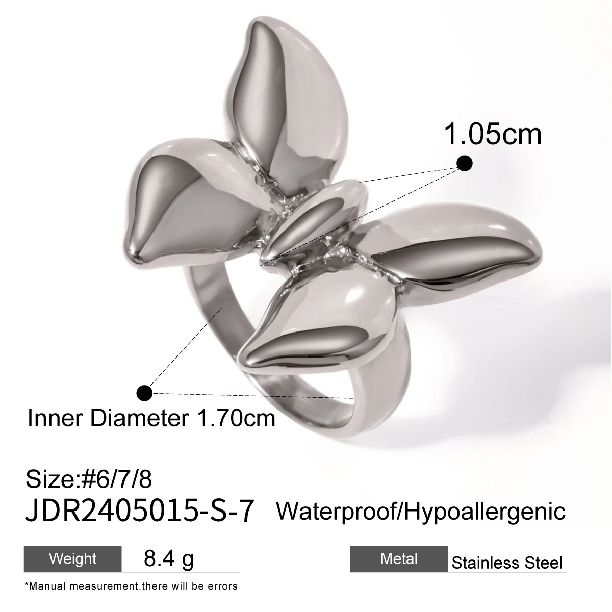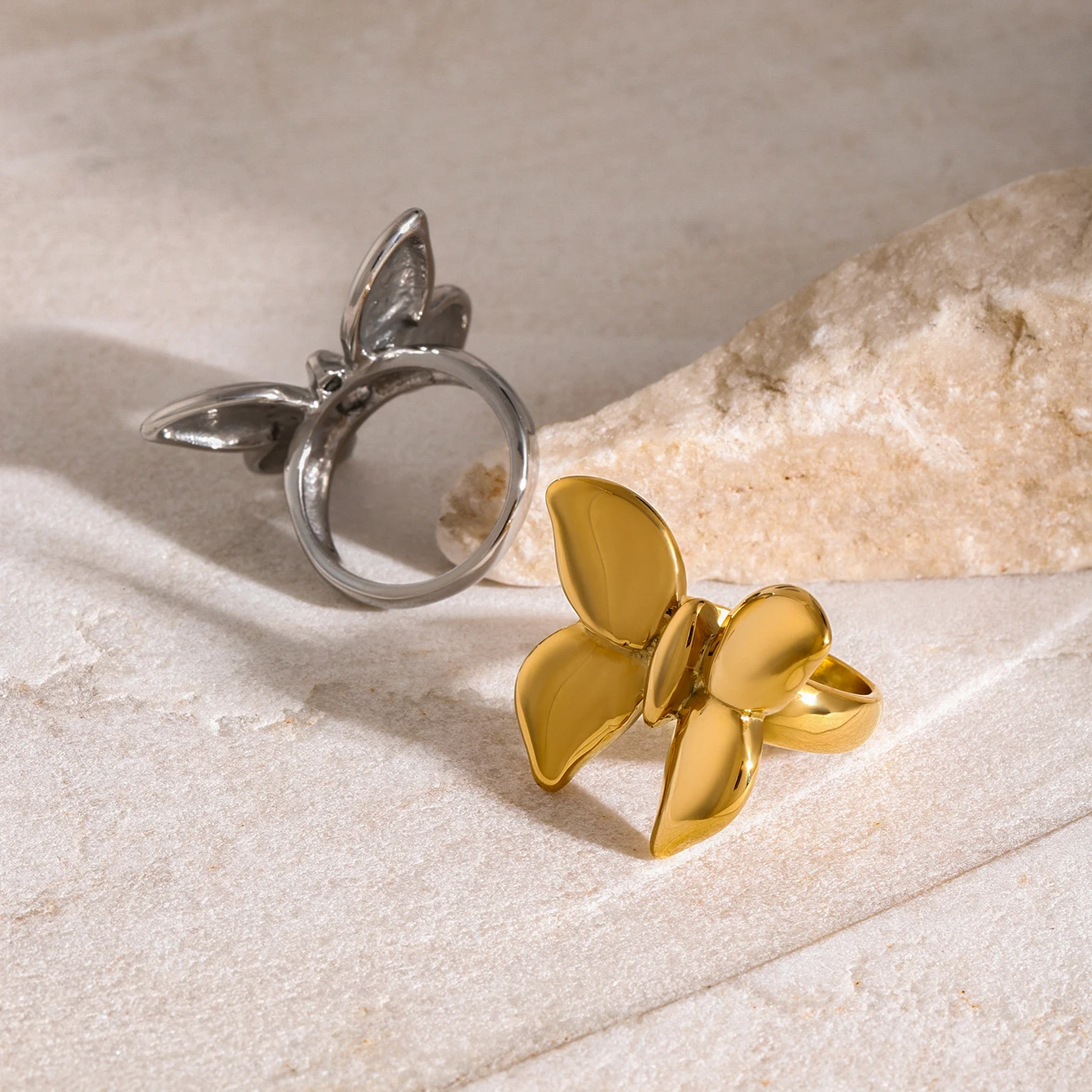 Imagine adding a striking, fashionable touch to your look with this statement butterfly ring. Crafted from stainless steel, it offers durability and a polished, shiny finish. The ring features a modern butterfly motif with broad, rounded wings, perfectly capturing a trendy geometric aesthetic. The gold-colored version, enhanced with PVD coating, provides a long-lasting, scratch-resistant, and fade-proof color, ensuring your accessory remains luminous over time. Its substantial profile makes it a standout piece suitable for casual or party wear. Designed for women in sizes 6, 7, and 8, it can be worn alone or stacked with other jewelry for a personalized look. Feel confident knowing your jewelry is waterproof, anti-allergenic, and built to last.