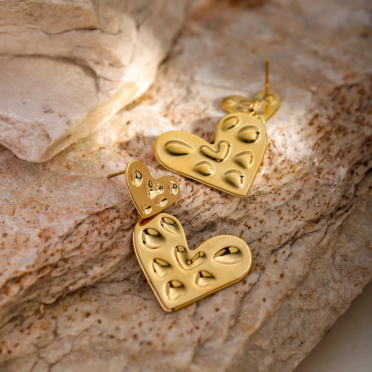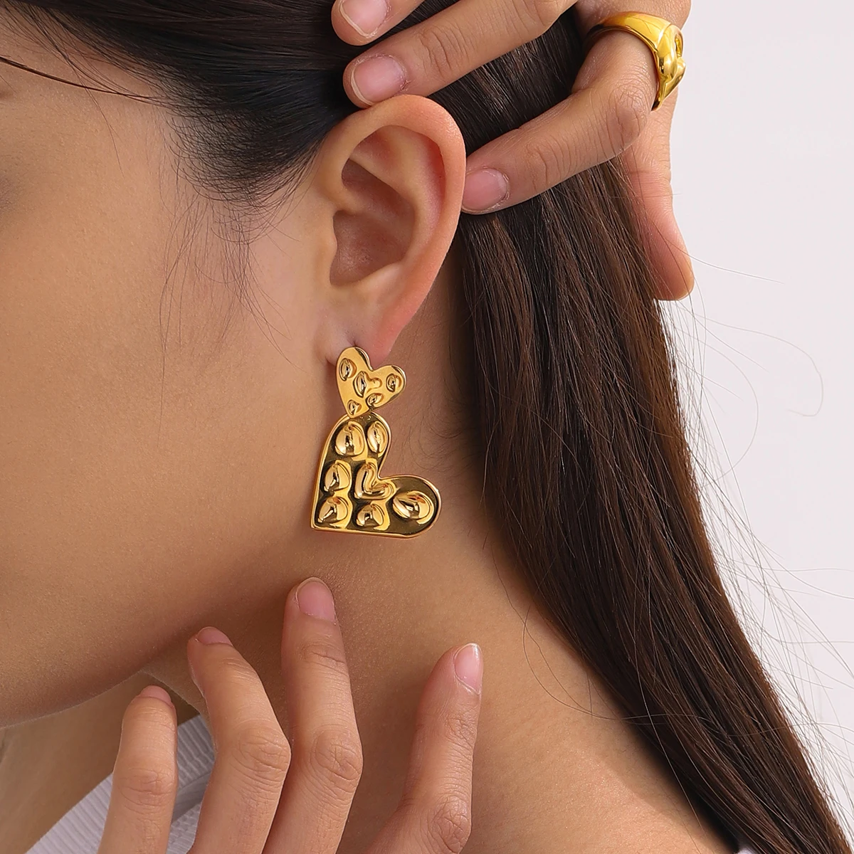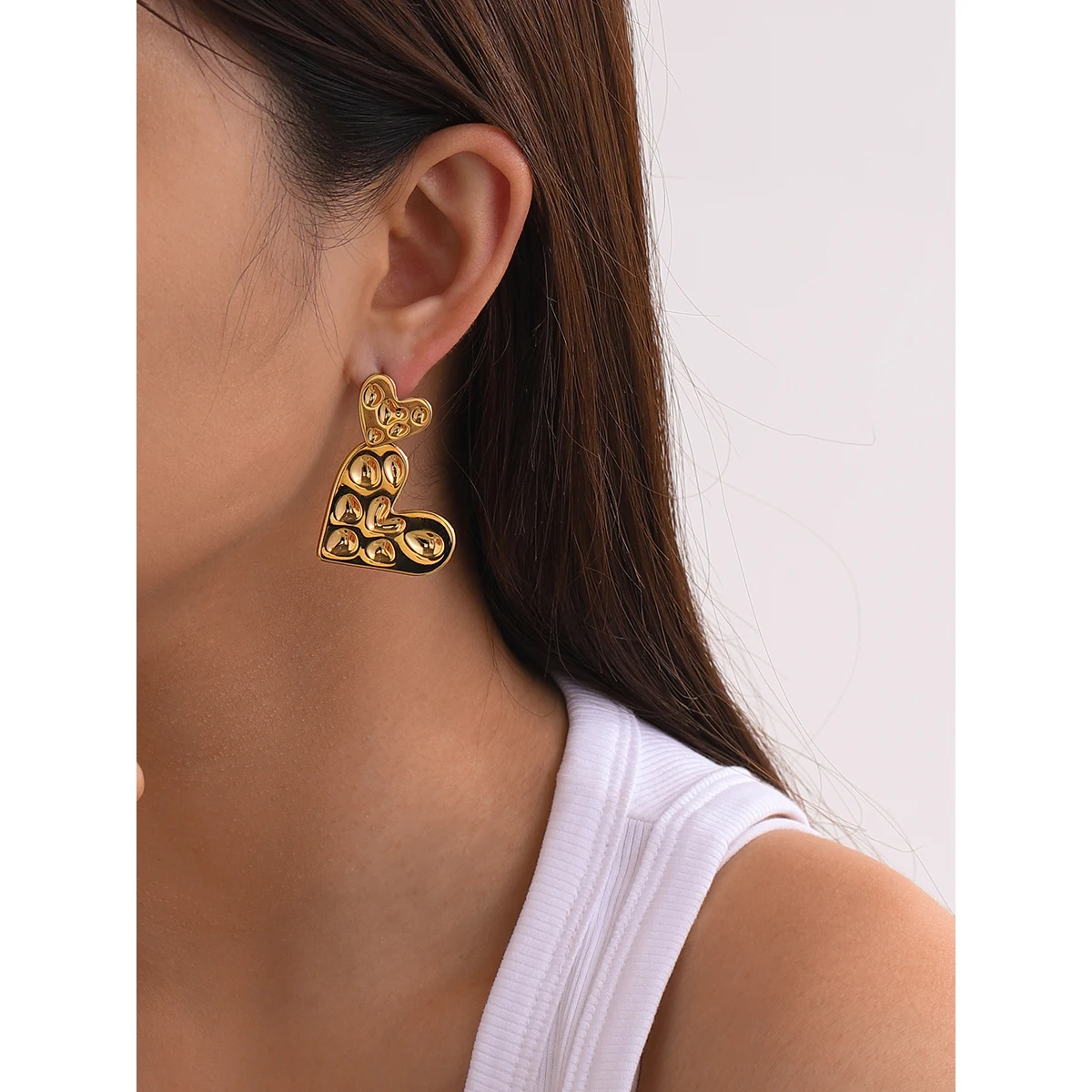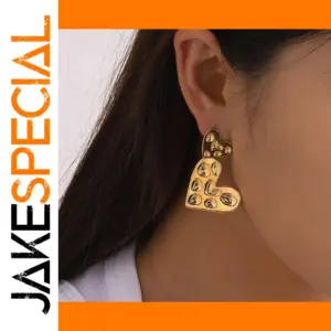 Experience the bold elegance of these stainless steel heart-shaped drop earrings (model number JDE2403038), crafted with durable PVD gold coating for long-lasting color and resistance to fading and scratches. Weighing 15 grams, these waterproof stud earrings feature a modern geometric design with a small heart adorned with raised domes, connected to an elongated component decorated with reflective oval and teardrop accents. Their glossy, polished finish catches light beautifully, making them perfect for women who want a striking, contemporary accessory that combines fashion and durability. Elevate your style effortlessly with these sophisticated and lightweight earrings designed for everyday wear and special occasions.