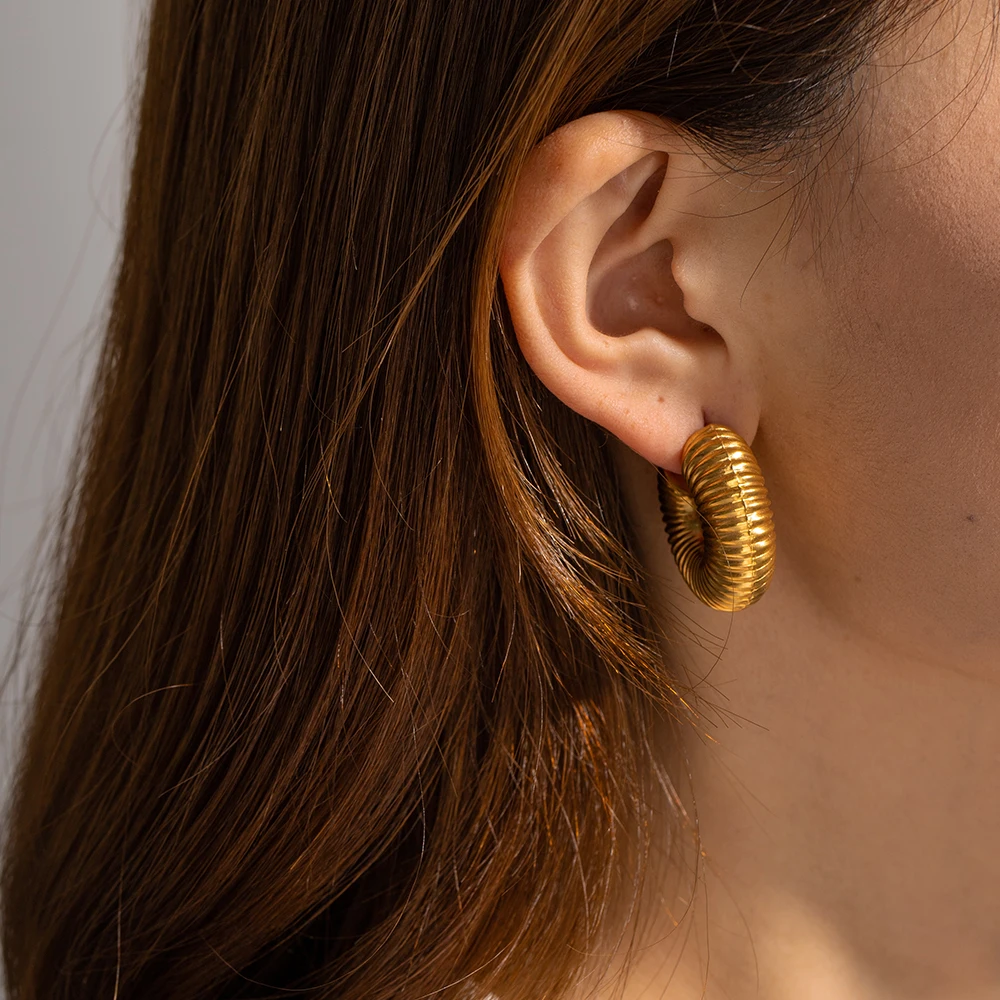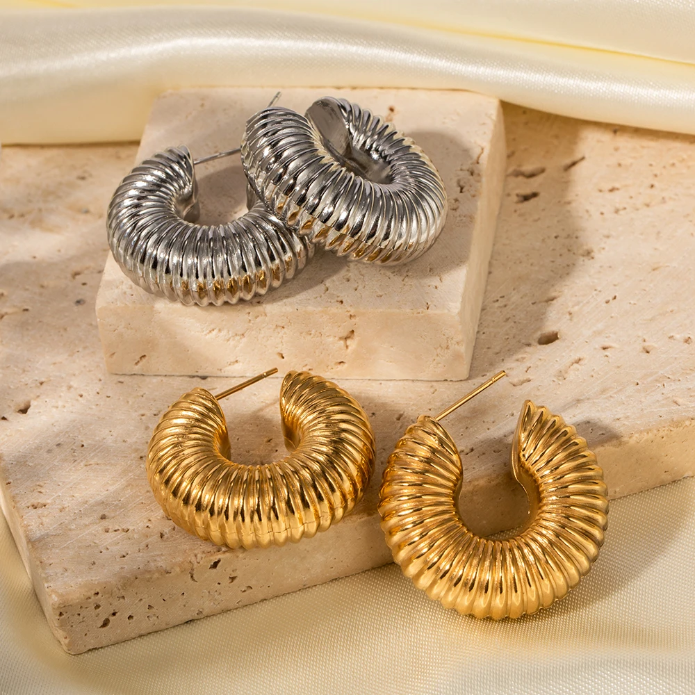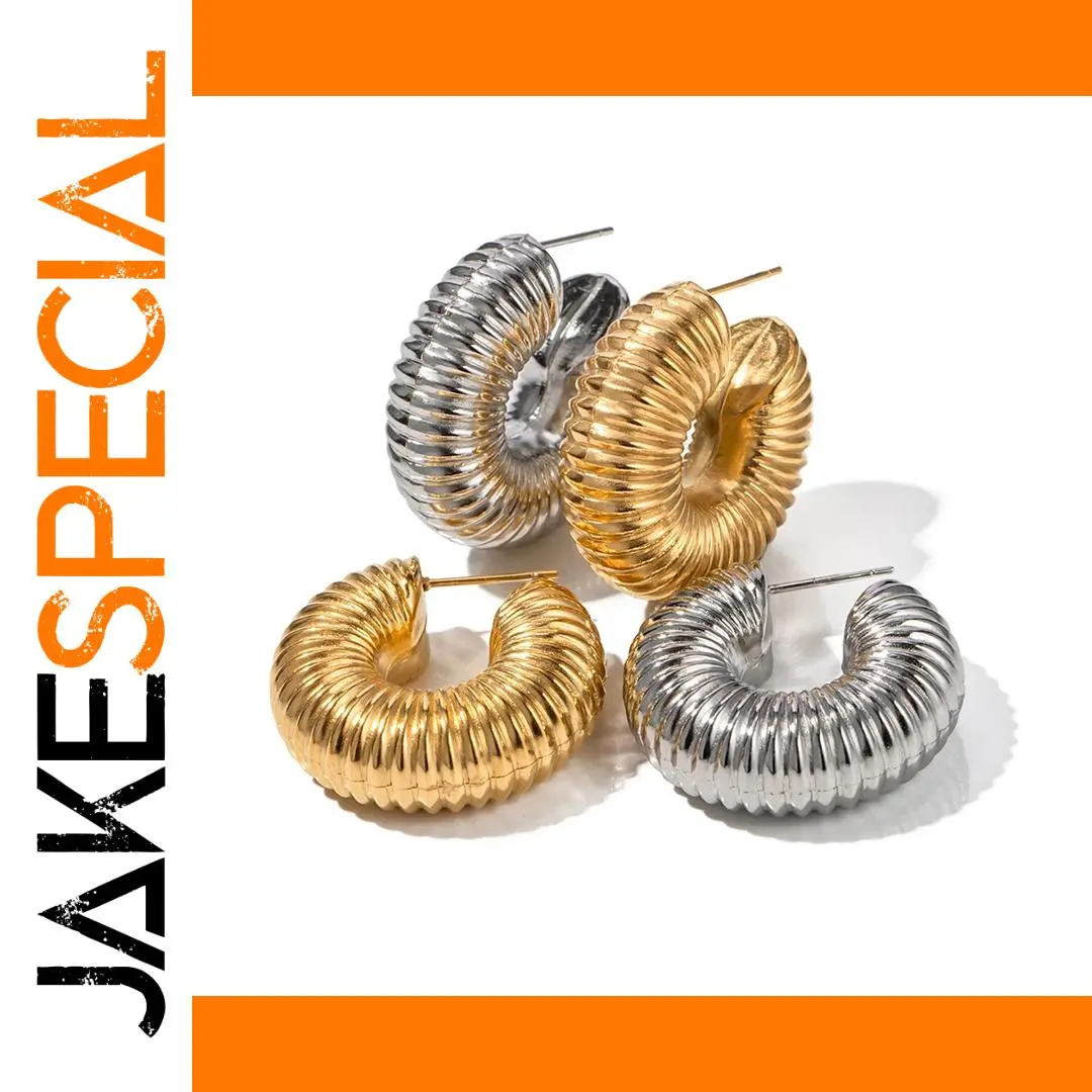 Experience bold modern style with these stainless steel hoop earrings featuring a hollow, rounded geometric shape with textured, ribbed surfaces that catch the light beautifully. Available in shiny gold and glossy silver finishes, each pair offers a polished metallic look and a chunky, statement silhouette. Designed with embedded posts for pierced ears, these waterproof earrings are resistant to daily wear and water, ensuring long-lasting durability. The thread-textured patterns add tactile interest while maintaining a sleek, minimalist aesthetic suitable for both casual and dressy occasions. Elevate your accessory collection with these versatile, contemporary earrings that combine fashion-forward appeal with practical durability.