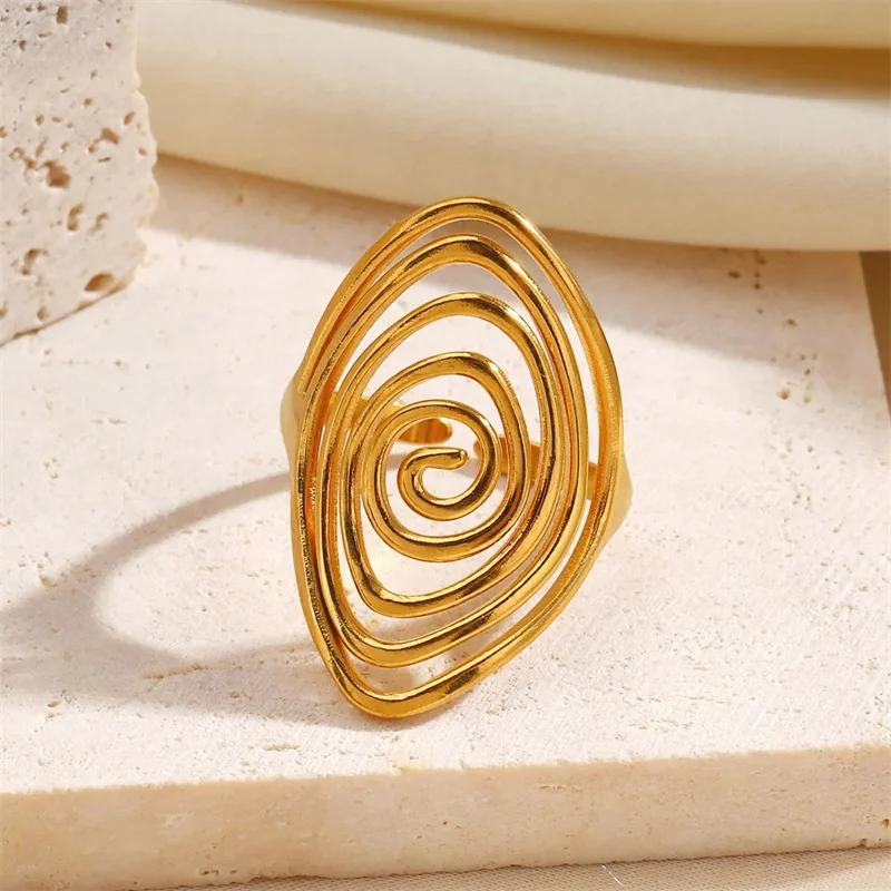 Discover the striking aesthetic of this bold, oversized stainless steel spiral ring. Designed for both women and men, it features an irregular, organic oval shape with a captivating swirling spiral centerpiece. The polished, shiny gold-tone finish enhances its contemporary appeal, making it a versatile accessory for casual or elegant occasions. Its minimalistic yet artistic design blends modern geometric elements with organic forms, ensuring it stands out as a statement piece. Perfect as a gift for someone who appreciates unique jewelry, this ring offers a perfect balance of style and craftsmanship. Feel confident wearing this eye-catching accessory that complements any wardrobe, elevating your look effortlessly.