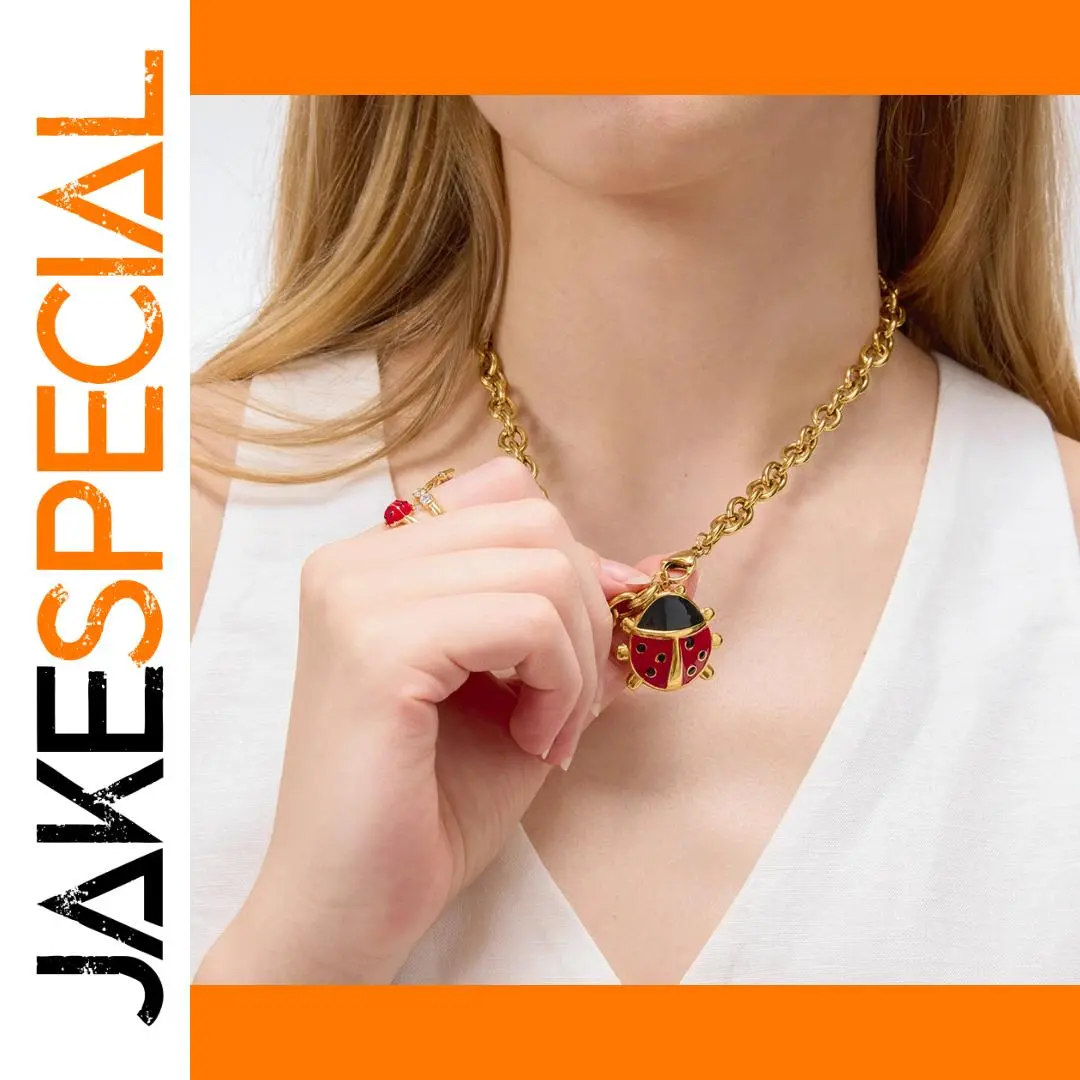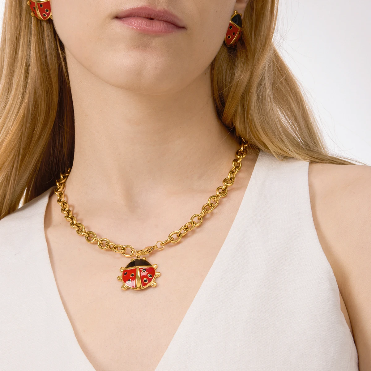 - This trendy necklace boasts a 3D ladybug pendant in vivid red and black with a dripping oil effect, outlined with a shiny gold-tone finish, perfect for adding a fun touch to your style.