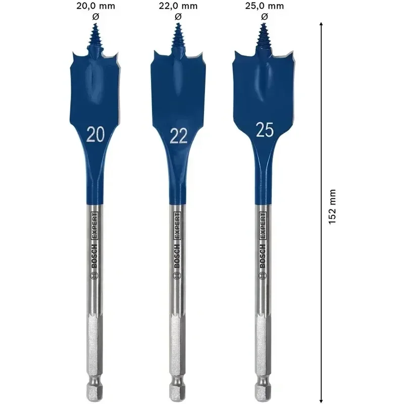 Experience unmatched efficiency with this Bosch Expert SelfCut Speed Spade Drill Bit Set, featuring three high-performance bits designed for fast, rough drilling in softwood and similar materials. These drill bits are crafted with vibrant blue-painted paddle-shaped blades, providing a sleek, modern look while ensuring durability and high-speed operation. The set includes diameters of 20mm, 22mm, and 25mm, clearly marked for easy identification. The metallic shanks are stamped with Bosch branding and are 1/4-inch hexagonal, ensuring compatibility with most three-jaw and hexagonal drill chucks. The innovative design uses Bosch Tip Technology to provide up to three times faster drilling, reducing fatigue during intense work. Perfect for professionals managing cables, pipes, and hardware installations.
