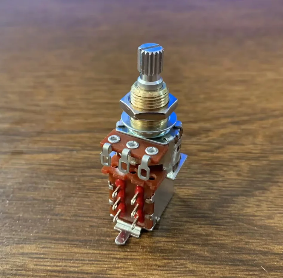 Experience precision control with this professional Bourns 10A250K potentiometer, crafted for guitar enthusiasts and technicians. Featuring a sleek long split brass shaft measuring 9.5mm, it offers smooth adjustments and secure knob attachment. The push/pull function adds versatility, making it perfect for tone or volume modifications. The durable metal and plastic construction exudes a rugged, industrial style, complemented by shiny silver mounting hardware, including a lock washer and hex nut. Set against a warm, natural wooden surface, this component combines craftsmanship with technical excellence. Designed with a maximum current of 10A and resistance of 250K ohms, it ensures reliable performance in high-demand environments. Elevate your guitar setup with confidence, knowing you have a high-quality, USA-made part.