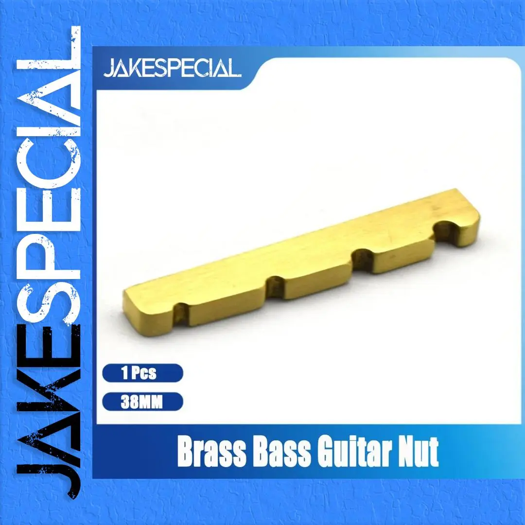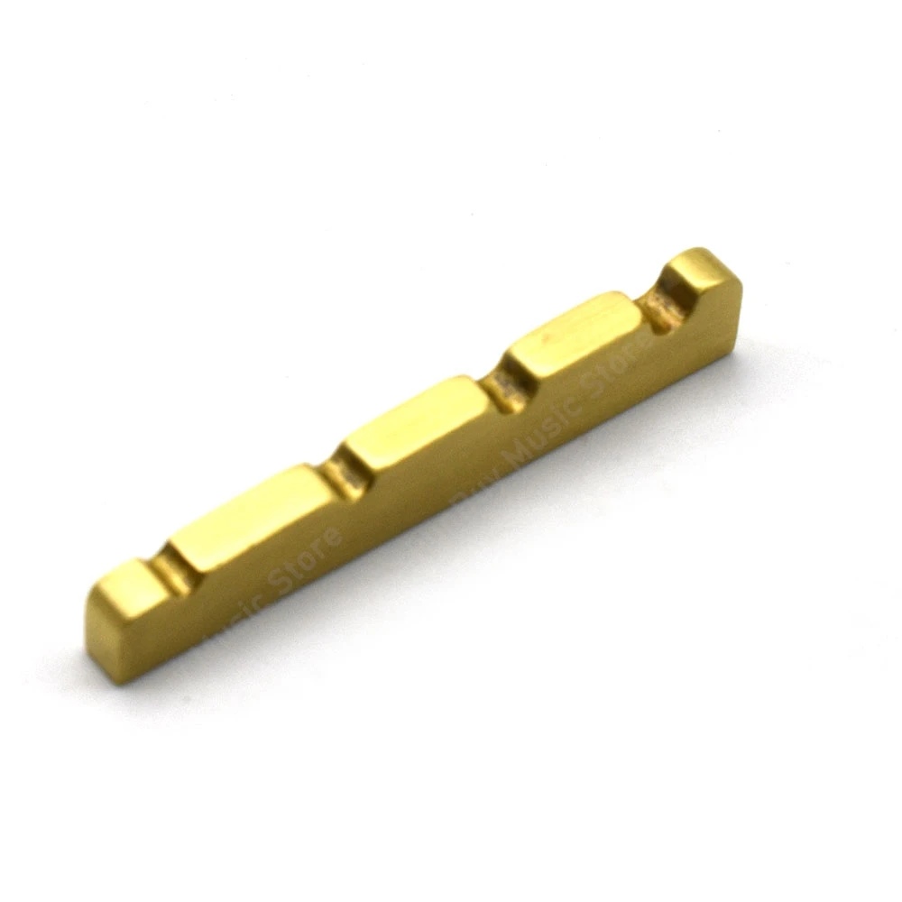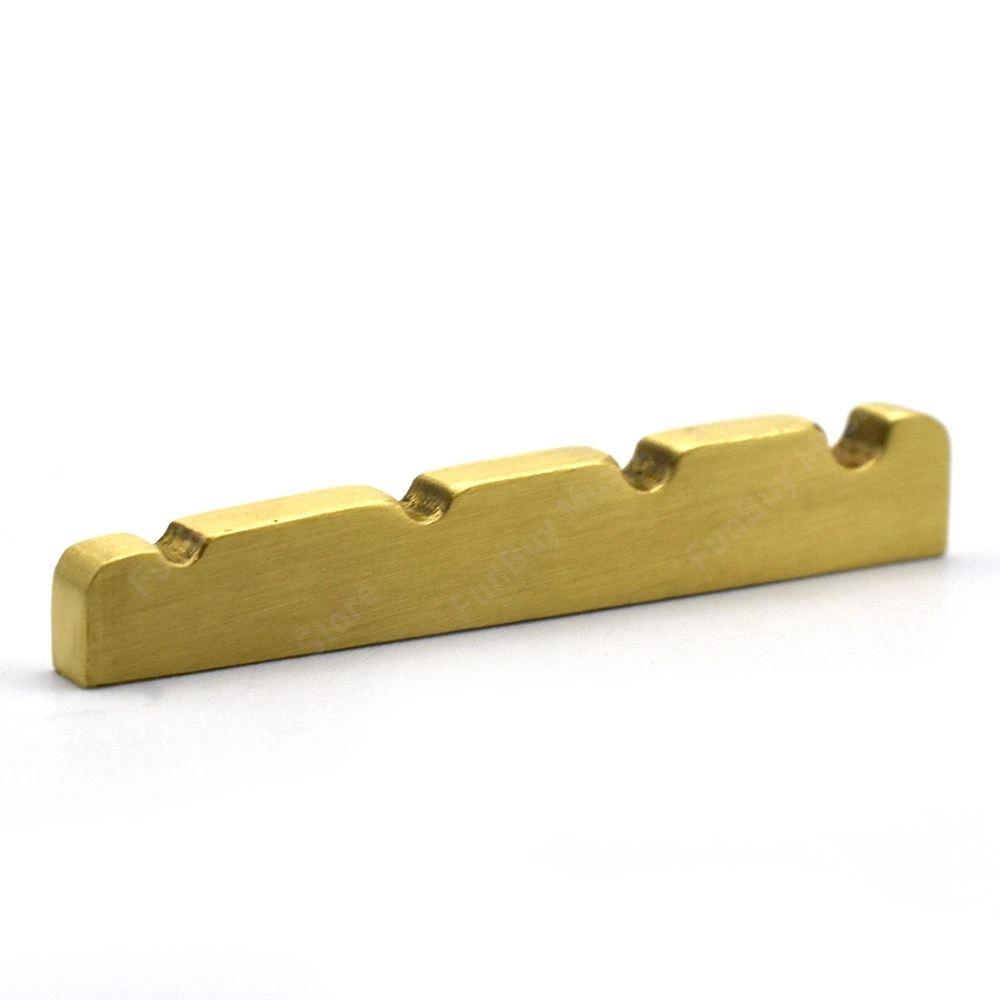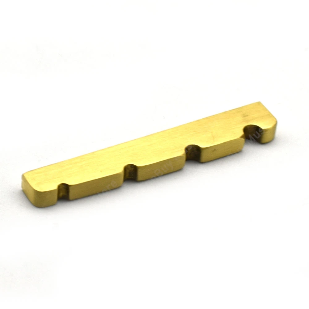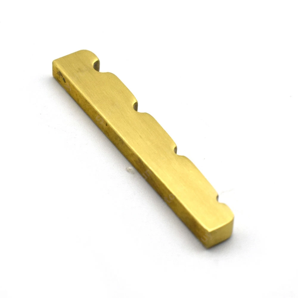 Imagine upgrading your bass guitar with this high-quality brass bridge nut, designed specifically for 4-string models. Its shiny, yellow-golden finish adds a sleek, sophisticated look to your instrument. Carefully precision machined, this 38mm nut offers a perfect blend of durability and aesthetic appeal. The preslotted design ensures your strings stay perfectly in place, maintaining accurate pitch during solos or recordings. The small screw allows you to easily adjust the string height, offering personalized comfort and playability. Whether you're a beginner or a seasoned professional, this part seamlessly integrates into your setup, enhancing both your sound and playing experience. Let this brass nut help you achieve your musical goals with confidence and style.