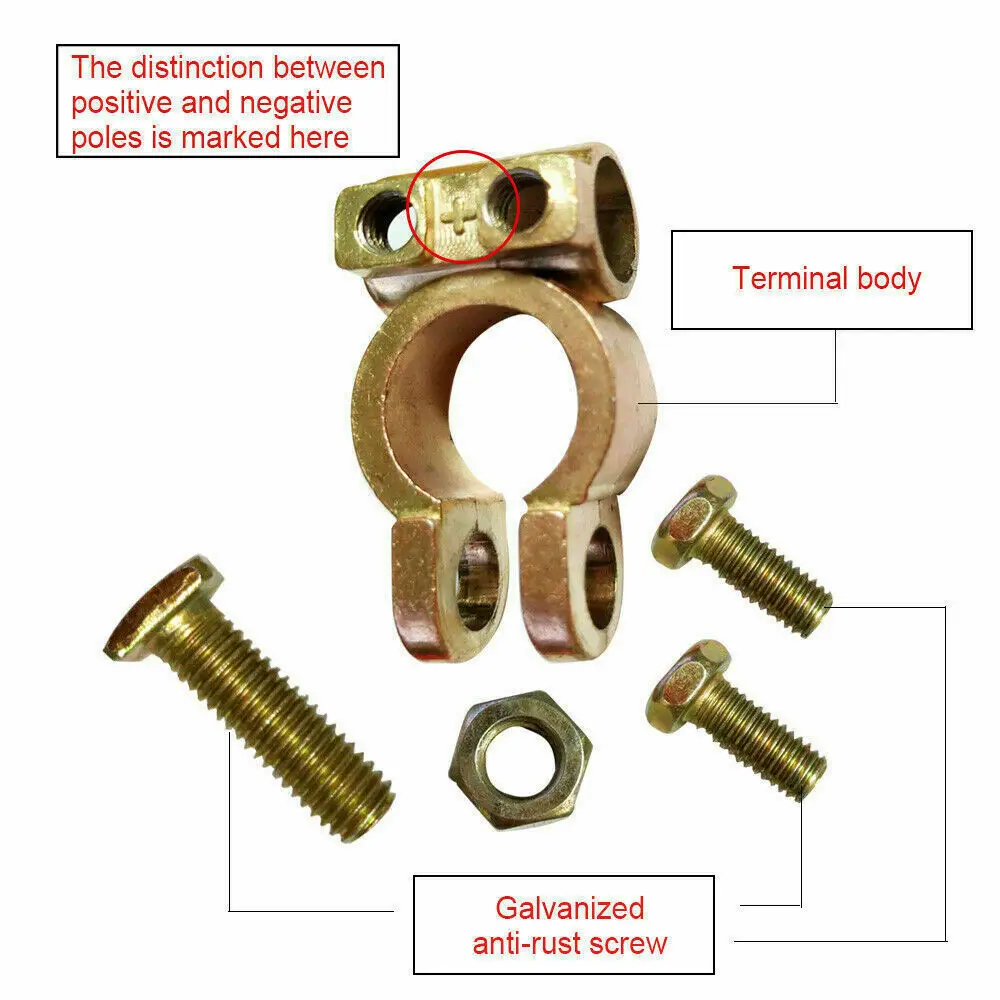 - Specifications include high copper content in the brass material, and appropriate dimensions for standard automotive battery posts, ensuring compatibility and high performance.