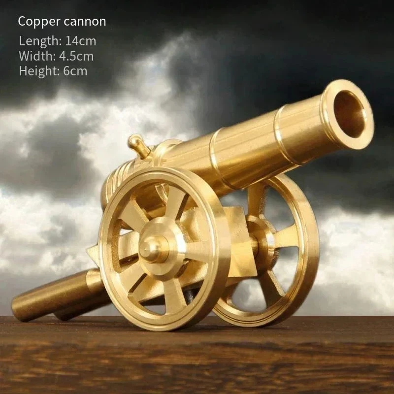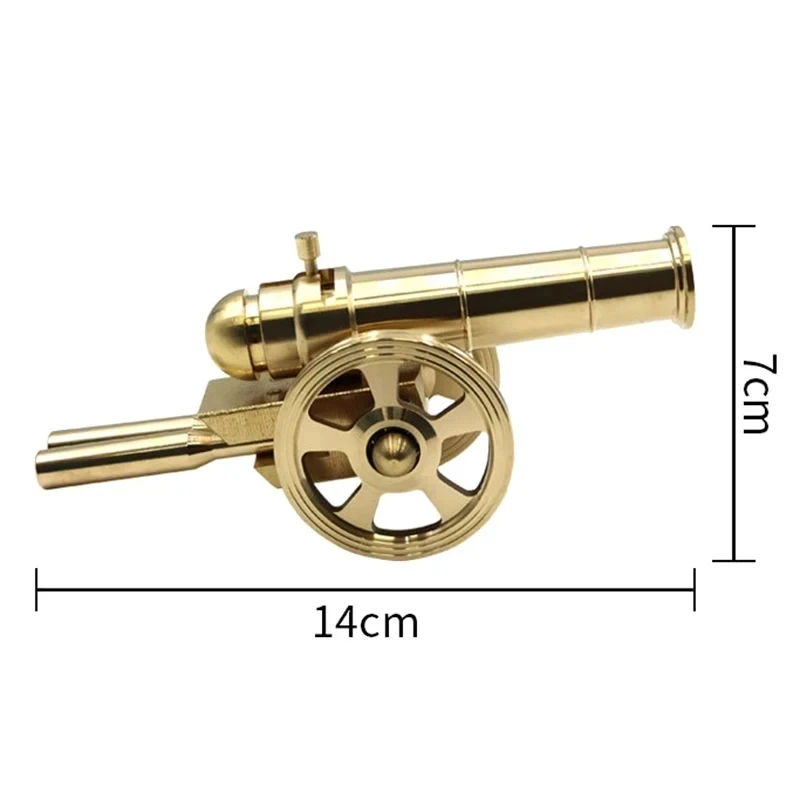 - This decorative brass cannon measures 14 cm in length, 6 cm in width, and 7 cm in height, making it a compact yet striking display piece suitable for various settings.