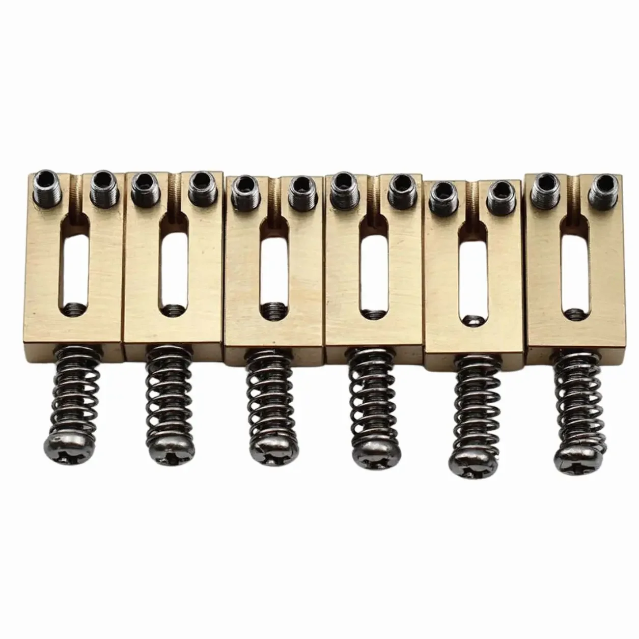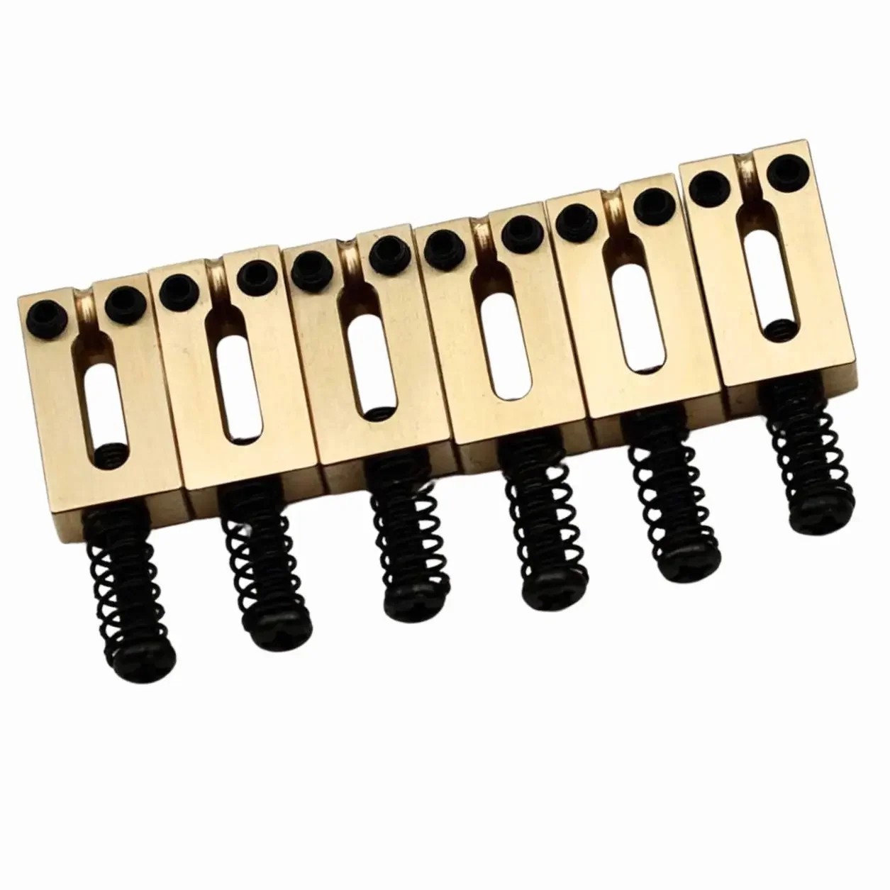 Elevate your electric guitar's performance with this high-quality brass saddle designed for Stratocaster and Telecaster models. Crafted from smooth, shiny brass with a lustrous gold-tone finish, it features clean edges and a polished surface that exudes craftsmanship. The rectangular shape with a narrow central slot ensures string durability, proper intonation, and enhanced sustain. Its sleek design not only complements the guitar aesthetically but also contributes to better tone clarity. Whether you're replacing old saddles or upgrading your bridge, this component offers optimal string contact and tuning stability. Its compatibility with hardtail and other bridges with 2-1/16″ (52.5mm) string spacing makes it versatile, ensuring a perfect fit and improved sound quality for your guitar.