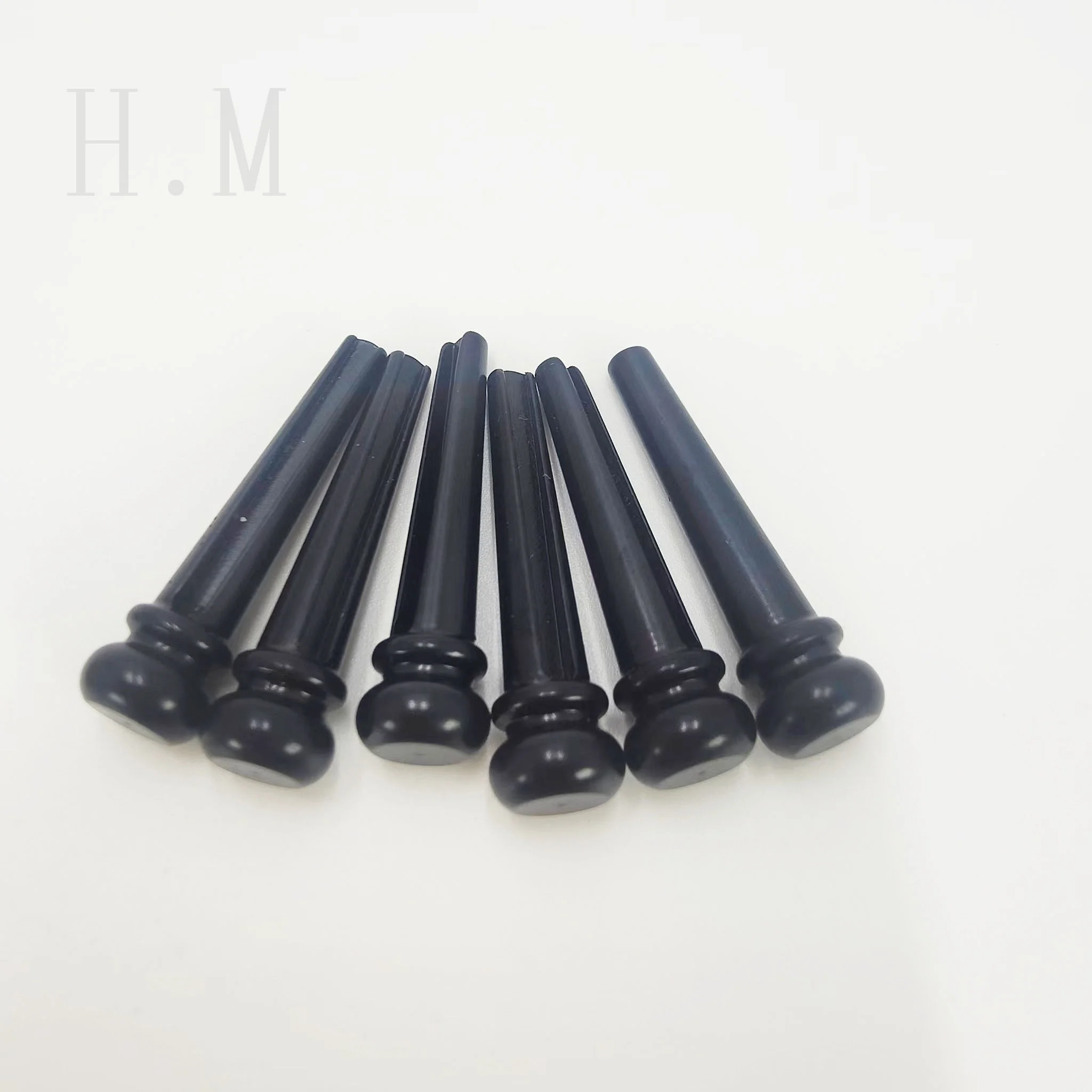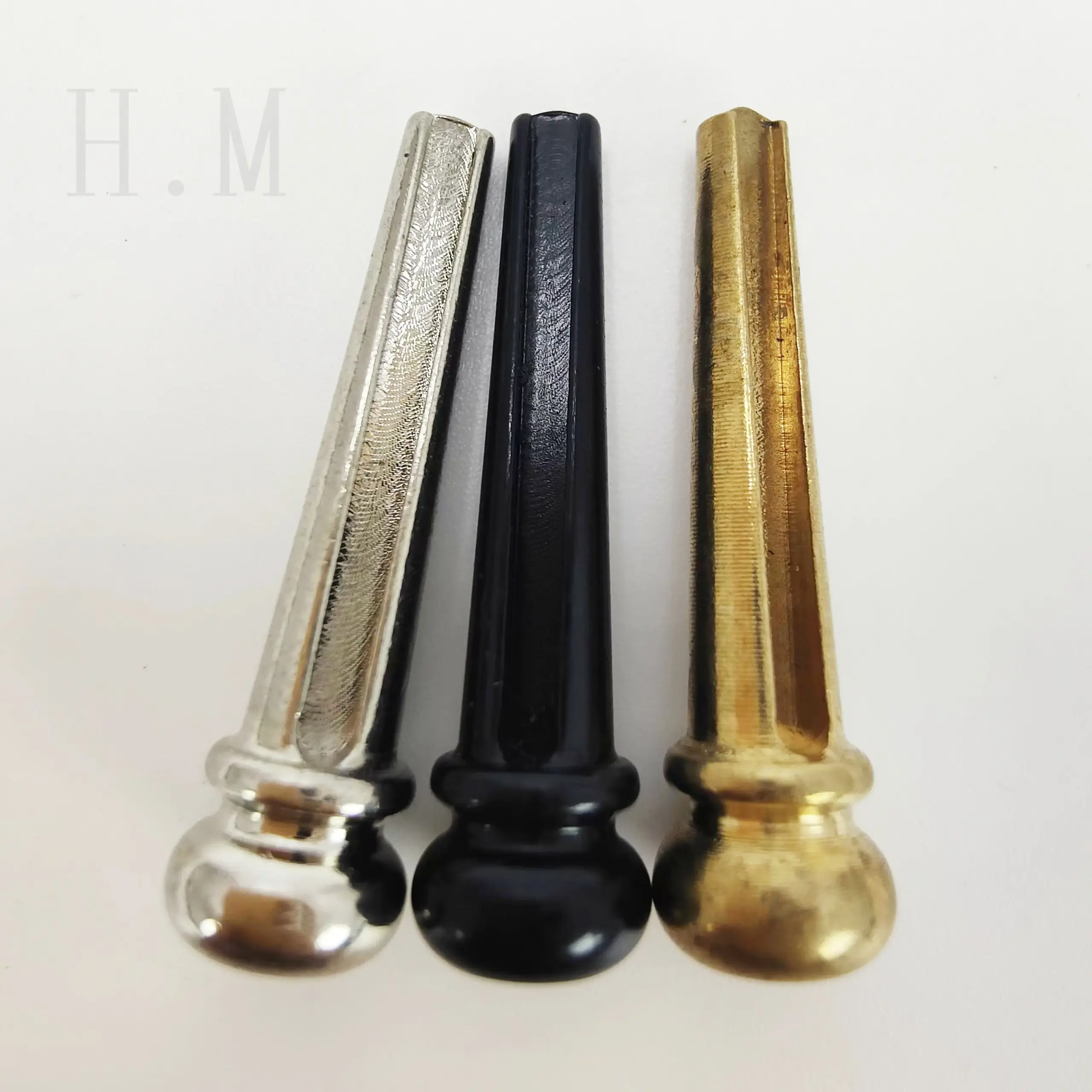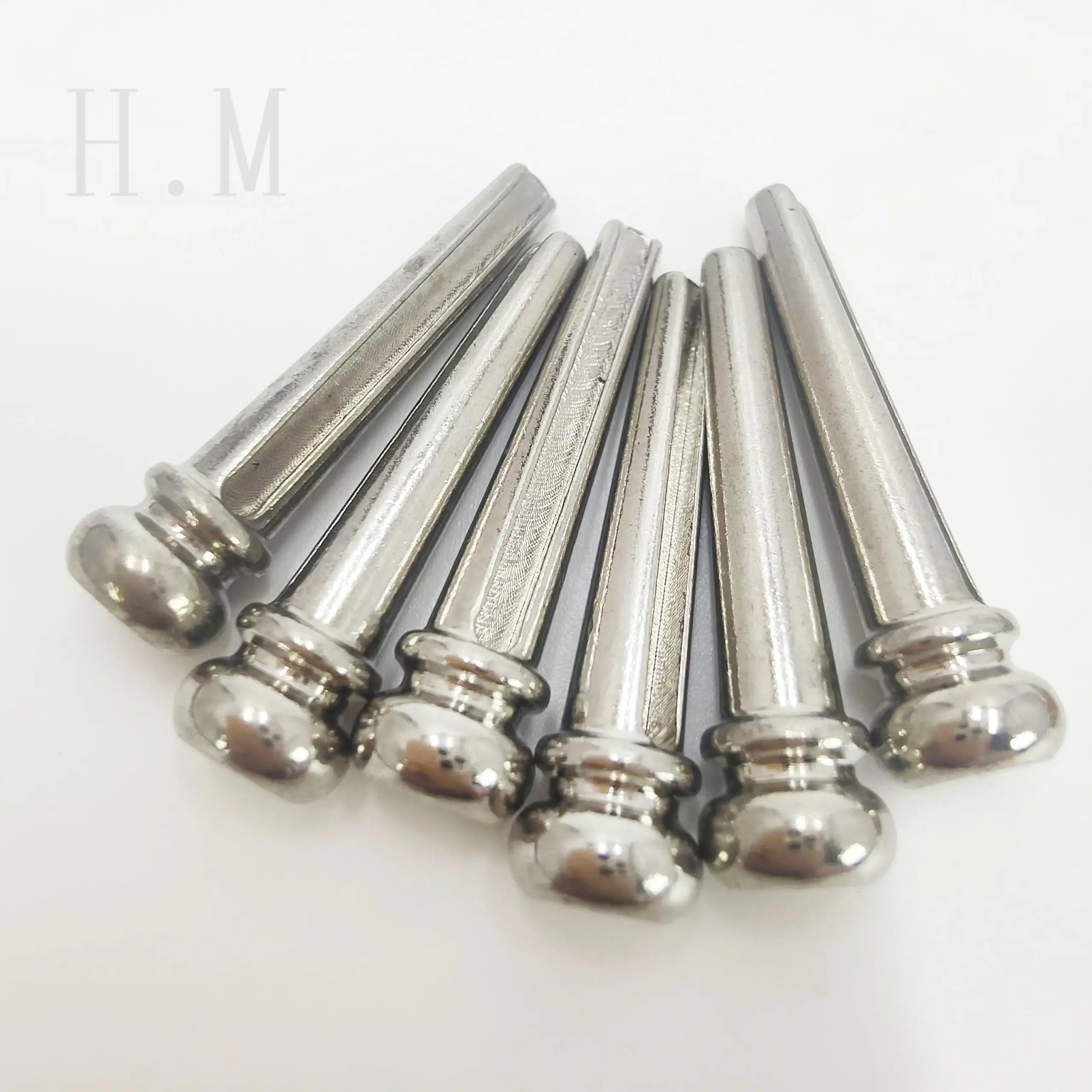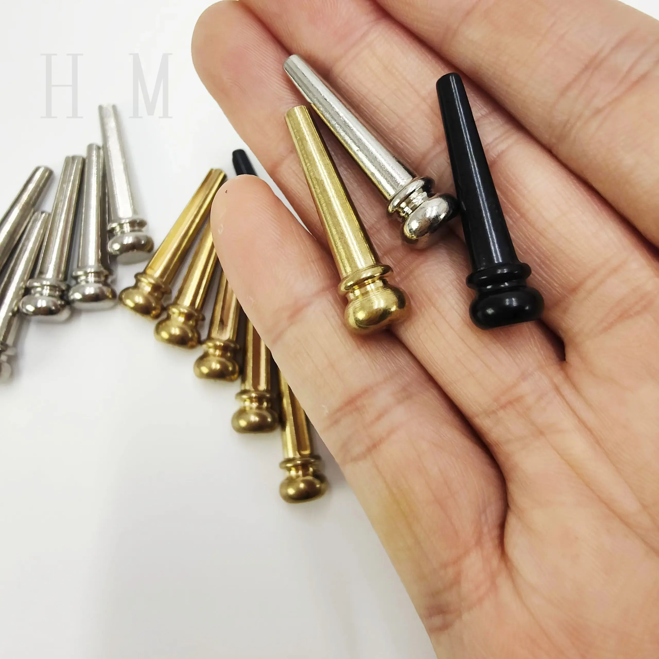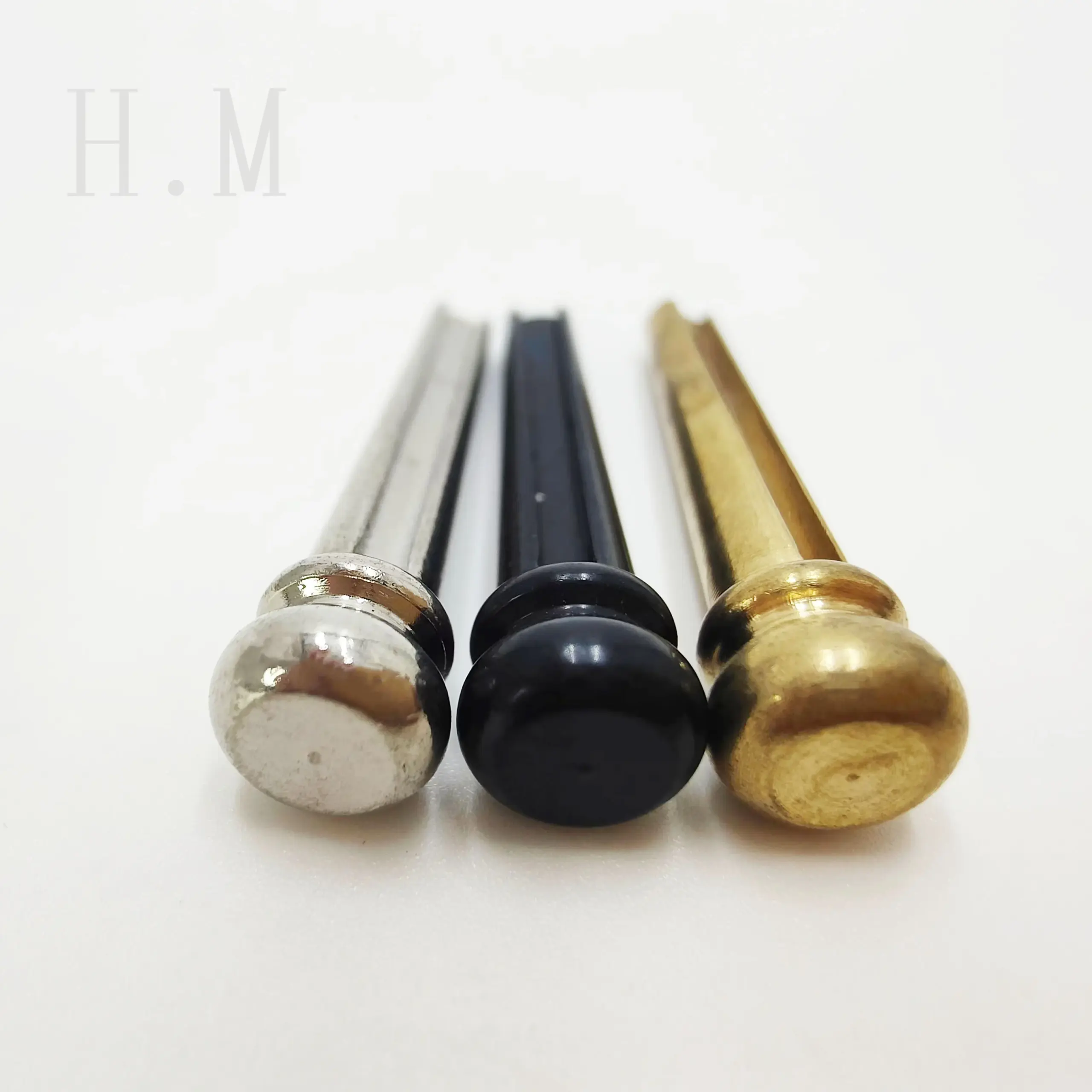 Experience the perfect blend of functionality and elegance with this set of six solid brass guitar string nails, designed specifically for high-end acoustic guitars. Each nail measures approximately 30mm in length and up to 5.3mm in diameter at the inside bayonet, offering a precise fit for your instrument. Their sleek finishes include electrophoretic black, chrome silver, and a luxurious gold, adding a touch of sophistication to your guitar's aesthetics. The smooth, rounded, slightly domed head ensures effortless handling and installation, while the cylindrical shank guarantees reliable string fixation. Crafted from durable brass, these nails provide excellent conduction of sound and stability, making them an ideal upgrade for professional musicians and hobbyists seeking premium quality components. Enjoy enhanced sound performance and a visually appealing upgrade with this essential guitar accessory.