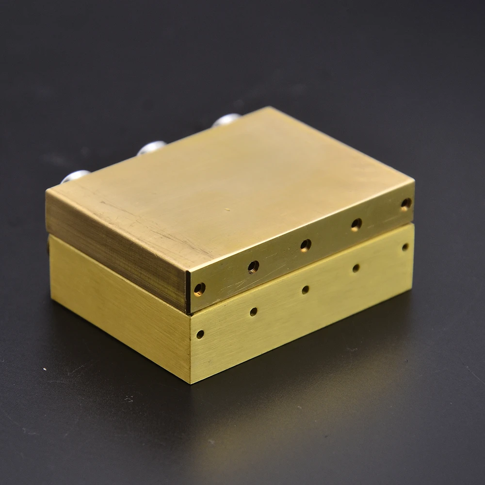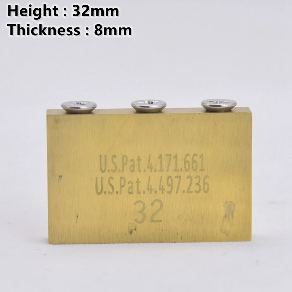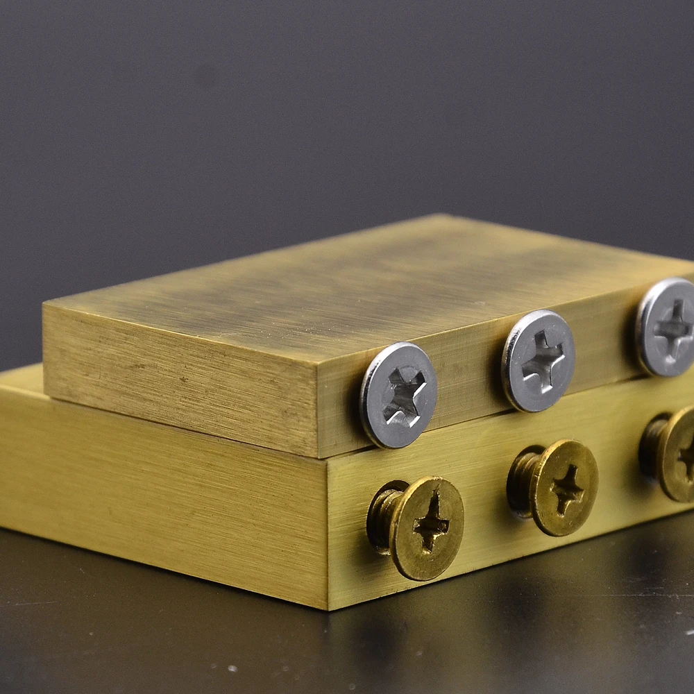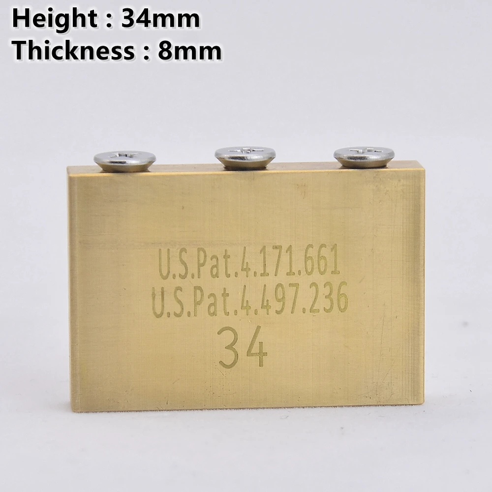 Experience superior sound and durability with this high-quality brass guitar tremolo system bridge. Crafted from durable brass, it offers excellent tone quality and long-lasting performance. Available in four precise sizes—32mm, 34mm, 37mm, and 42mm—each measures 50mm in length and 8mm in width, providing versatile options for your guitar setup. The polished metallic surface exhibits a warm, golden hue, enhancing a vintage, industrial aesthetic. A set of round, grooved saddle screws sit atop each bridge segment, ensuring secure string anchoring and fine adjustment. Some pieces display subtle patina, adding character to their refined design. This component is built for longevity and performance, ensuring your instrument stays in optimal playing condition. It’s compatible with Floyd Rose original and Floyd Rose special guitar parts, making it a perfect upgrade for your tremolo system.