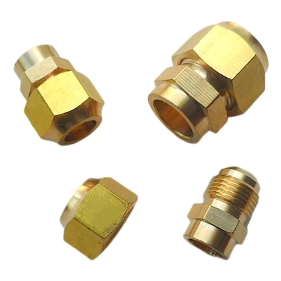This forged brass air conditioner coupling and nut set offers durable, high-pressure connections with sizes ranging from SAE 1/4″ (6.35mm) to SAE 3/4″ (19.05mm). Designed for maximum pressure of 229 PSI (1.6 MPa) and operating within -20°C to 120°C, these fittings feature hexagon heads for easy tightening and precise, clean machining. Suitable for air conditioning, refrigeration, ship piping, copper water lines, and medical oxygen systems, each fitting includes a male connection with internal threads compatible with UNF standards. The 16mm hose connection inner diameter ensures a secure fit, combining robust forged construction with a sleek metallic finish for reliable, long-lasting performance.