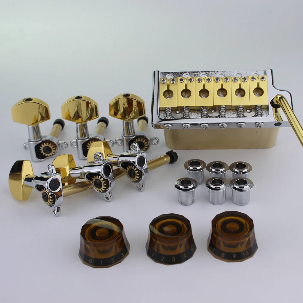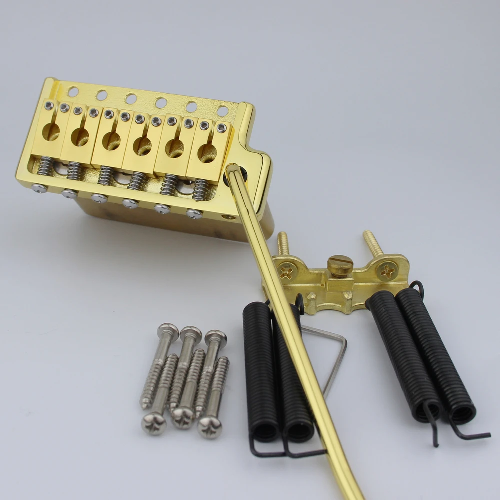 Enhance your guitar with this high-quality brass tremolo bridge set, compatible with ST style guitars. Crafted from durable metal, it features a 10.5mm string spacing and a sleek brass base with a polished gold saddle for a sophisticated look. The set includes adjustable knobs in both BR and CR colors, offering customizable aesthetic options. Designed for complete installation and precise tuning, this tremolo system delivers reliable performance and an impressive visual upgrade with its shiny chrome finish, brass accents, and vibrant yellow saddles. Elevate your guitar’s tone and style, making every performance as inspiring as the moment you installed it.