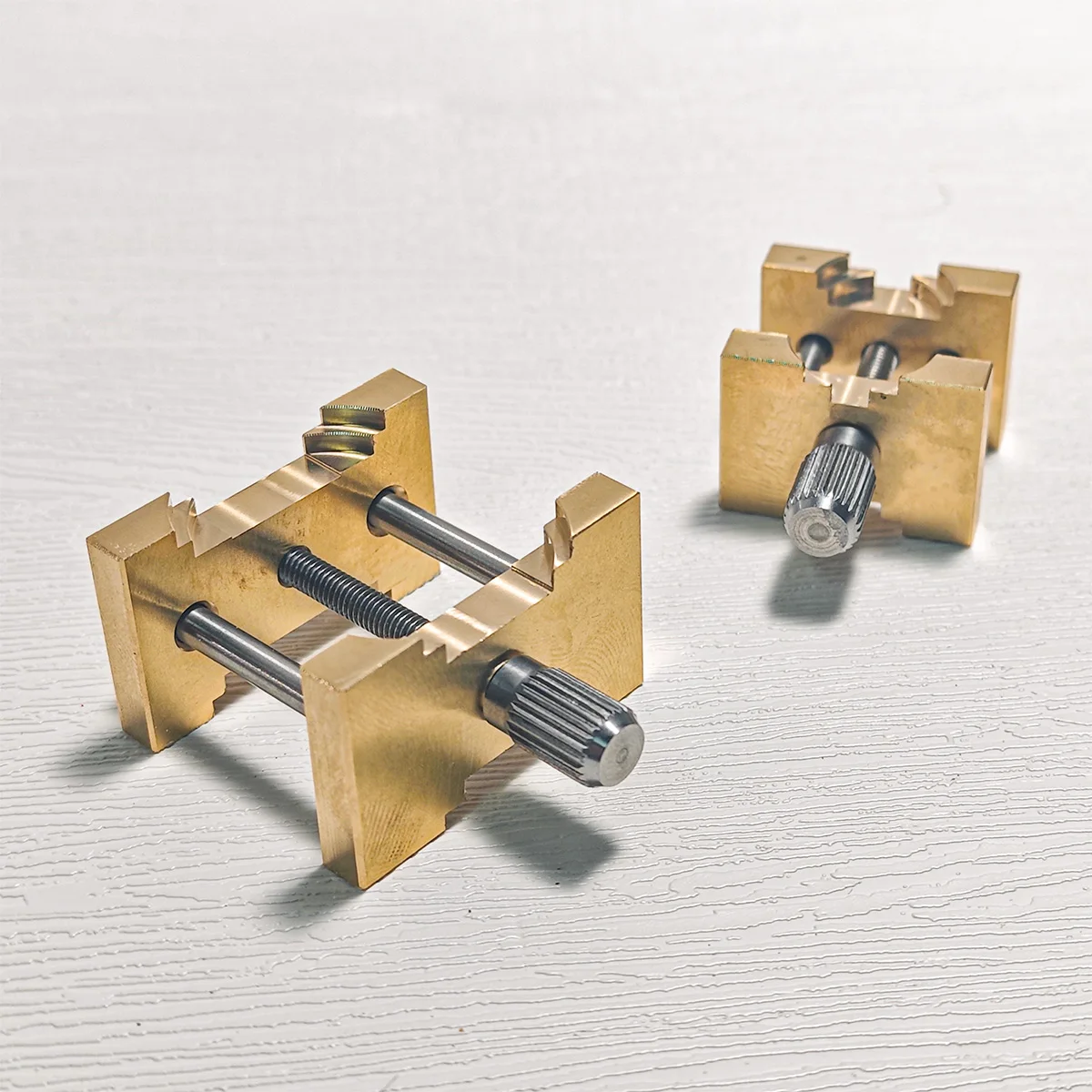 Experience the precision and craftsmanship of this high-quality brass watch movement holder set, designed for professional watchmakers and dedicated enthusiasts. Crafted with a polished, warm gold finish, these holders combine durability with refined aesthetics, making your repair or assembly work both efficient and enjoyable. The rectangular, smooth bases feature slight chamfered edges for a subtle touch of sophistication. Adjustable, ridged screws allow you to securely hold both quartz and mechanical watch movements without causing damage, thanks to the U-shaped cutouts and cylindrical stabilizing posts. Whether for routine maintenance or intricate assembly, these tools provide firm support, enhance precision, and ensure your work is of the highest quality. Invest in a tool that offers both functionality and elegant design.