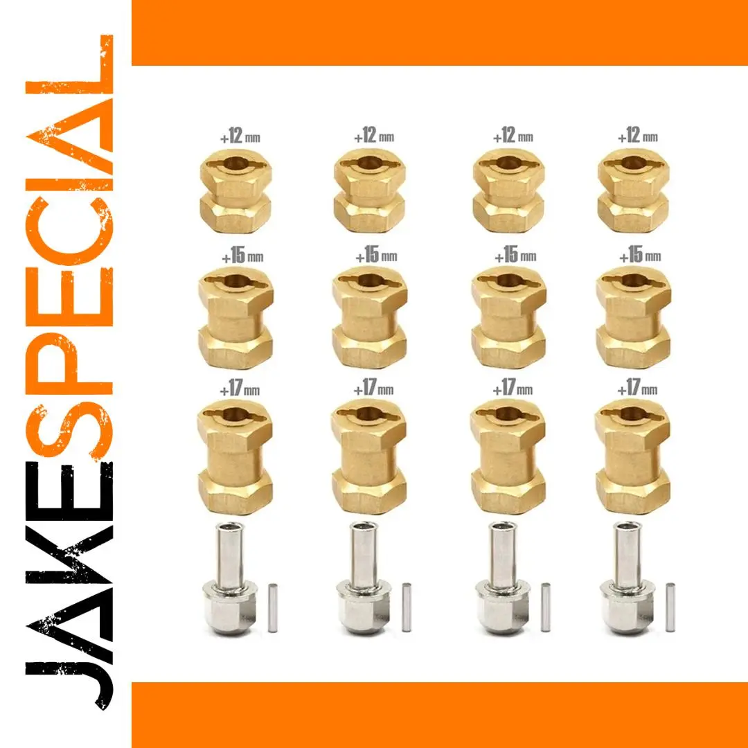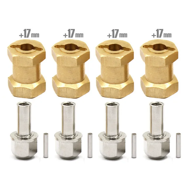 Enhance your 1/10 scale RC crawler with this premium brass wheel hex hub adapter set. Designed for precision and durability, these adapters feature a shiny, polished brass finish that adds a sophisticated touch to your vehicle’s appearance. With lengths of 12mm, 15mm, and 17mm, they allow for accurate wheel widening, improving stability and handling during rugged terrains. The hexagonal exterior shape ensures a secure fit, while the central 5mm diameter hole guarantees compatibility with various wheel rims. The set includes all necessary hardware: wheel nuts, hex pins, and barrel nuts, making installation straightforward. Crafted from high-quality, lead-free brass, these adapters are built for long-lasting performance, giving you confidence in your RC crawler’s upgrade.