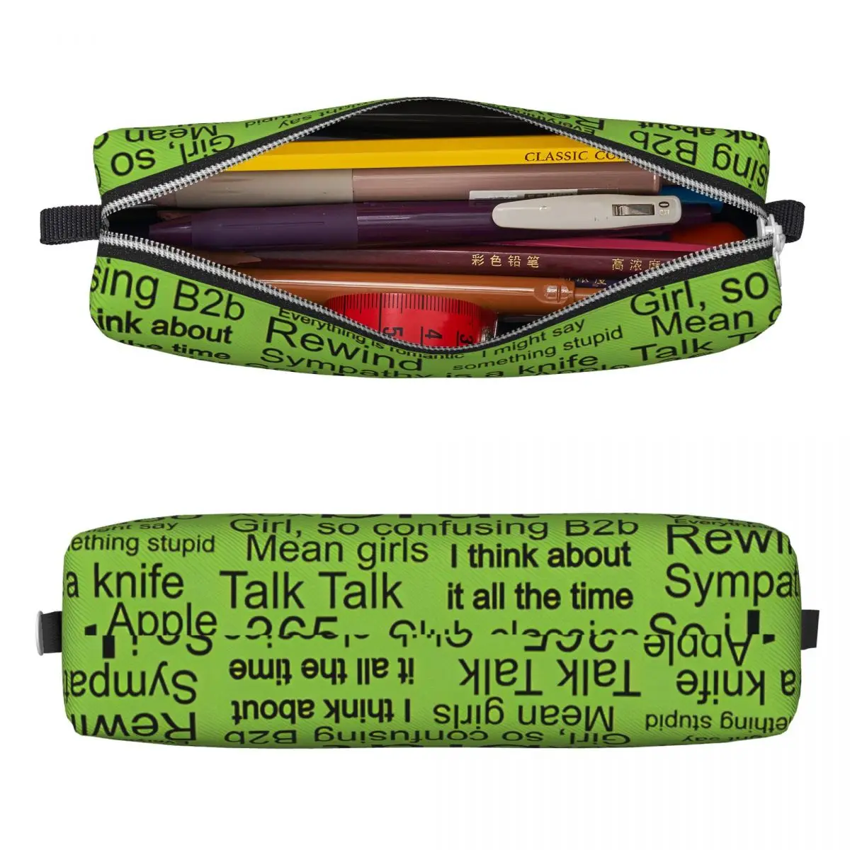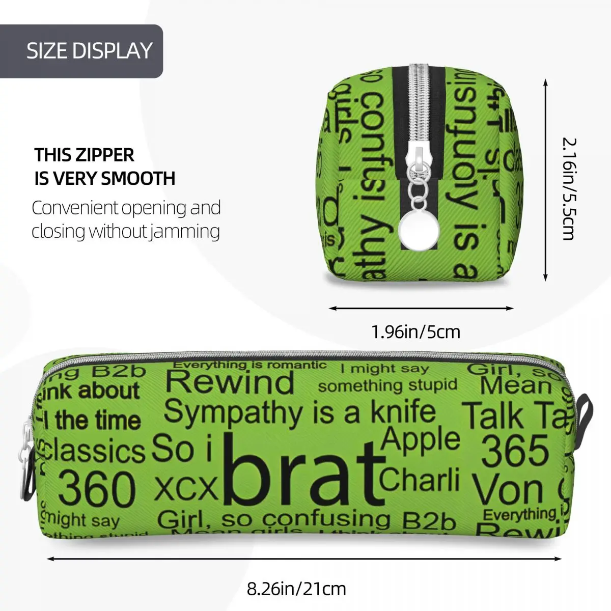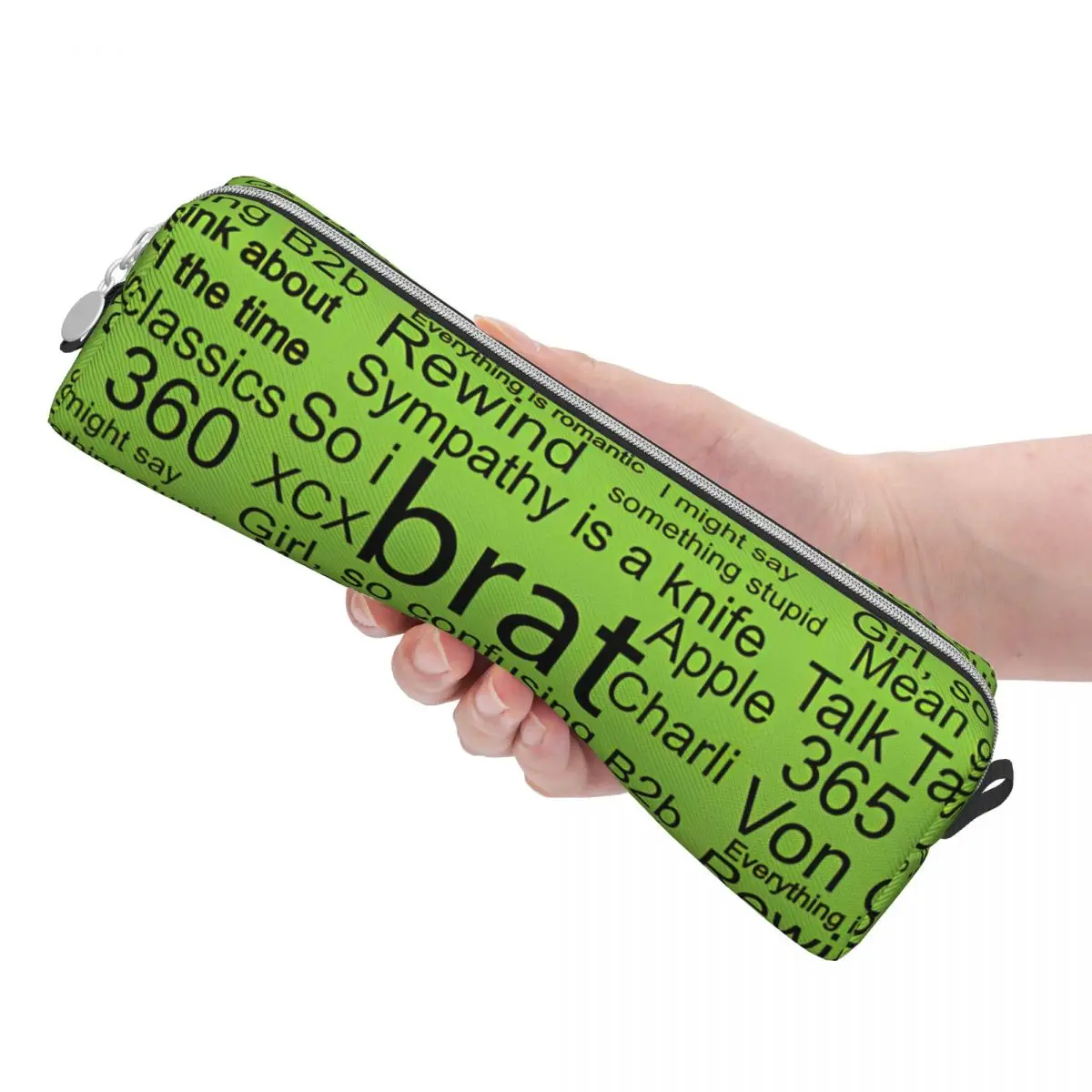 This vibrant green pencil case, inspired by the playful spirit of Charli XCX, offers both style and functionality for school and office supplies. Its modern design features black text elements and phrases associated with the singer, creating a trendy and youthful aesthetic. The prominent word “brat” in a bold font captures attention, while the mixed fonts enhance its dynamic look. The sleek, rectangular shape with slightly tapered ends not only maximizes storage capacity but also provides easy access through its sturdy zipper, which includes a stylish silver pull tab. This durable fabric design ensures longevity, making it perfect for daily use.