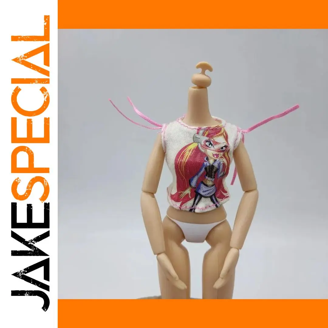 Get ready to elevate your doll collection with this stylish top designed specifically for 30cm Bratz dolls. Adorned with a vibrant graphic print of a playful character with striking pink hair, it brings personality and flair to any doll outfit. Crafted from soft flannel material, this garment features short sleeves and charming pink ribbon ties, making it easy to secure on your beloved doll. Imagine your doll donning this cheerful, colorful top, making her the star of any display. This top complements imaginative play and is a perfect way to showcase your unique style while enhancing your collection.