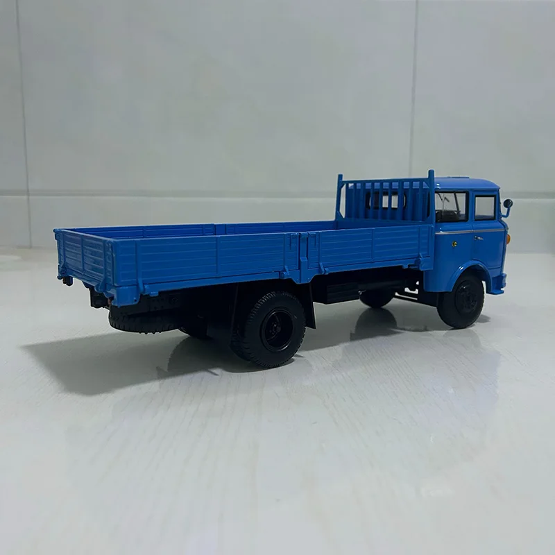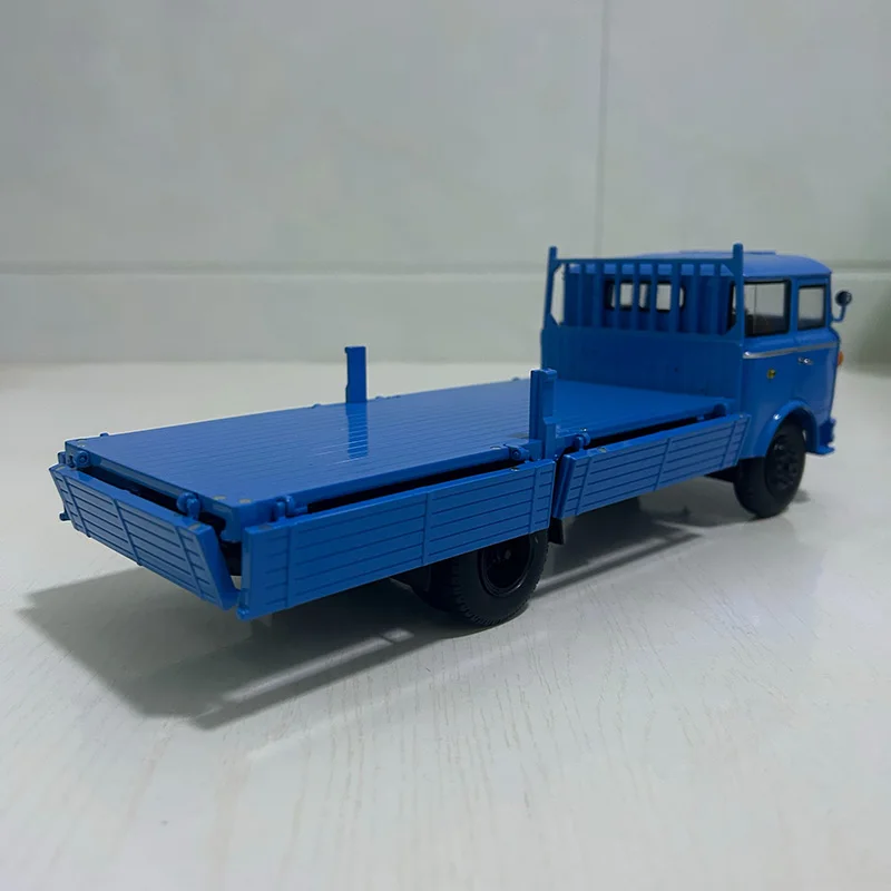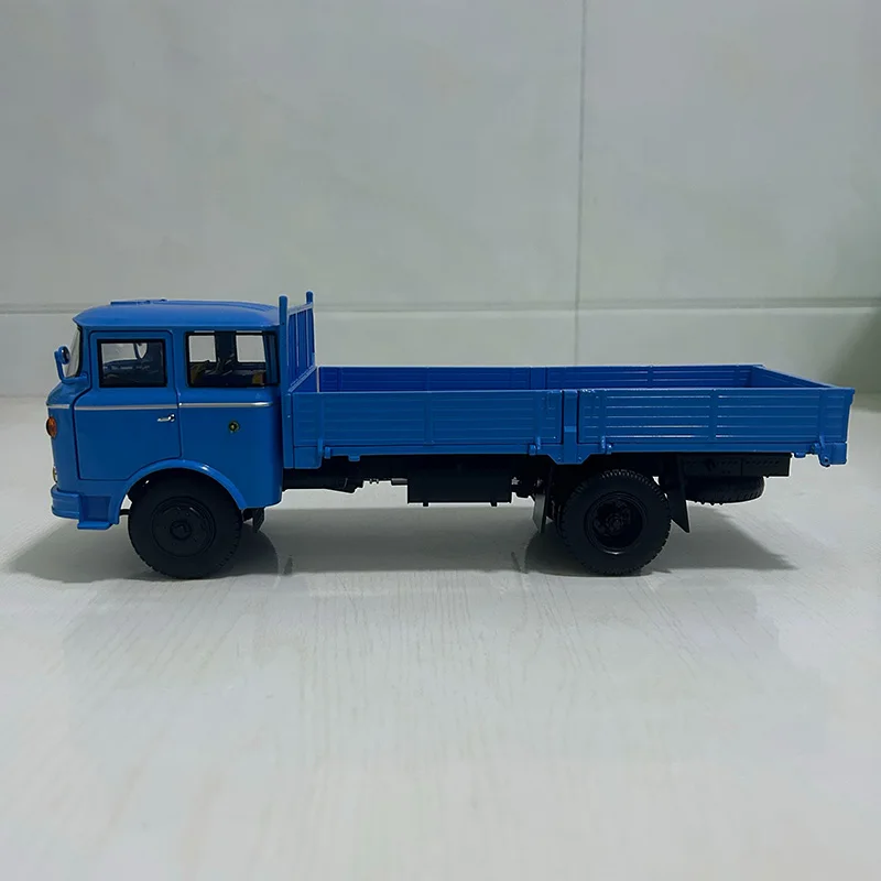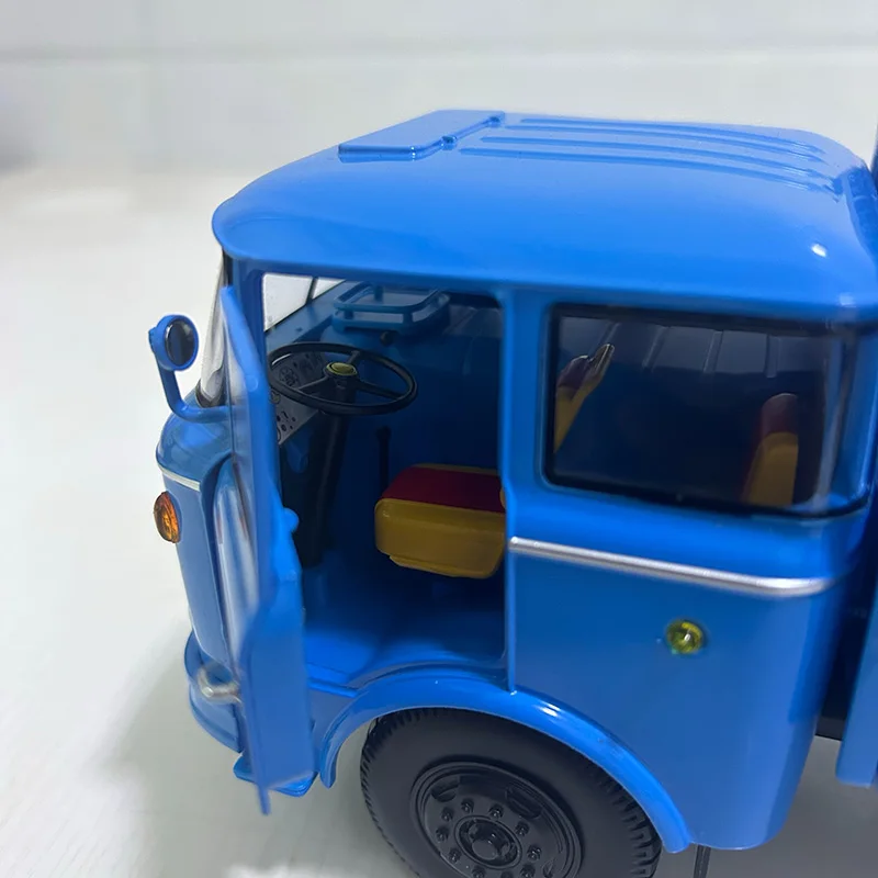 Bring a vibrant touch to your collection with this stunning 1:24 scale diecast cargo truck, designed with meticulous detail and a lively blue finish. Crafted from alloy and ABS plastic, this model offers durability and an authentic look, perfect for display or as a gift. Its classic, boxy cab features smooth rounded edges, a detailed silver grille, circular headlights, and small yellow indicator lights that add subtle color accents. The large, curved windshield and finely detailed doors with handles and hinges enhance realism. The flatbed cargo area, matching the bright blue tone, is reinforced with protective side panels, conveying a sturdy, utilitarian style. Functional doors that open allow you to showcase the interior, making it a truly appealing collectible for enthusiasts and adult collectors alike.
