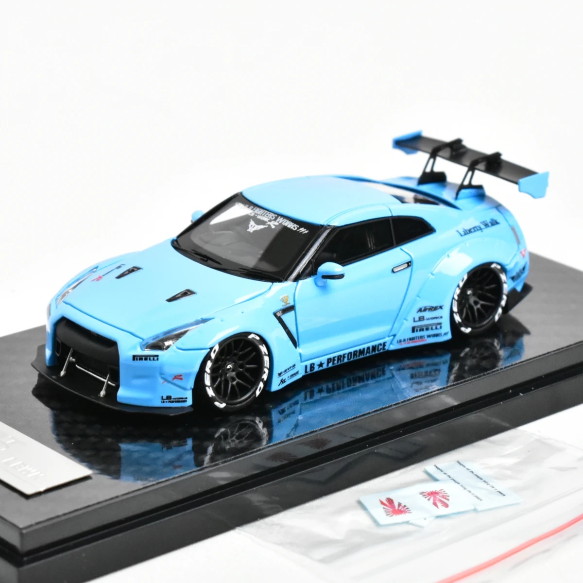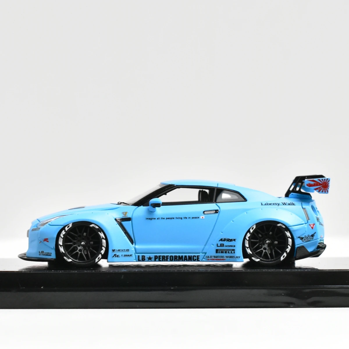 Imagine adding this vibrant, highly detailed resin diecast model to your collection, instantly elevating your display with its dynamic racing style. Crafted with precision, this 1:64 scale replica captures the essence of a high-performance sports car, featuring a sleek, aerodynamic silhouette accented by sharp contours. The bright blue finish makes it eye-catching, complemented by black grille, wheels, rear wing, and side mirrors. The model showcases finely painted sponsor decals, including “LB PERFORMANCE” and racing stickers, with a clear, sharply contoured headlight design and a tinted windshield. The extensive attention to detail highlights its craftsmanship, making it an ideal piece for collectors who appreciate authenticity and sporty aesthetics in their display.