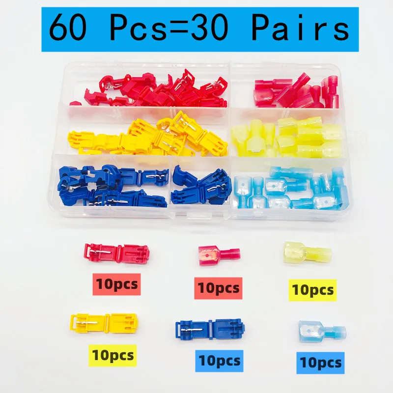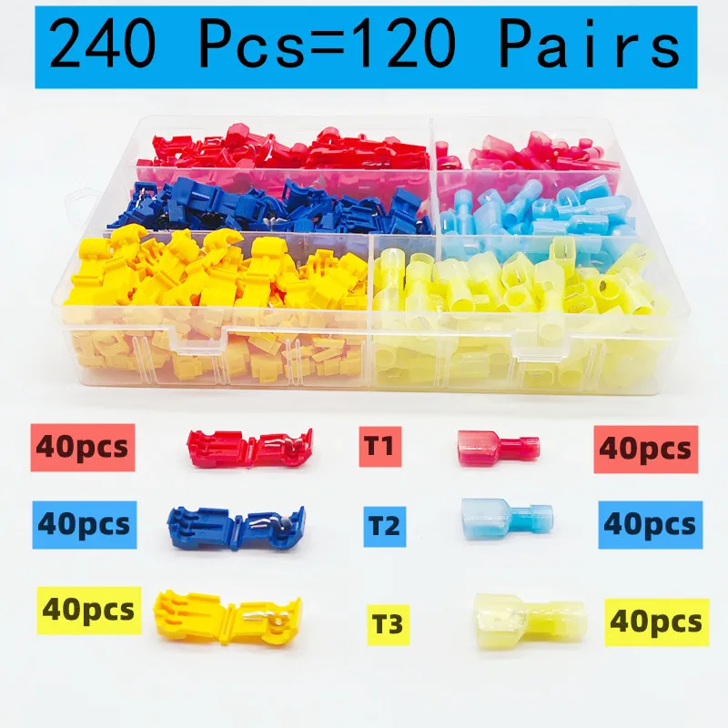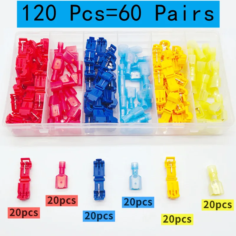 Imagine effortlessly organizing your electrical connections with this set of vibrant, color-coded T-shaped terminal blocks. Designed for durability and ease of use, these connectors feature a sleek, modern look that enhances any wiring project. Their high-quality plastic construction ensures long-lasting performance, while their compact size saves valuable space. With quick-free stripping plugs integrated into each connector, installing or maintaining cables becomes faster and more efficient. Perfect for various electrical applications, these versatile terminal blocks allow you to create secure, reliable connections in complex wiring setups. Whether you need a small or large volume, choose from packages of 60, 120, or 240 pieces to suit your needs and ensure your projects proceed smoothly.