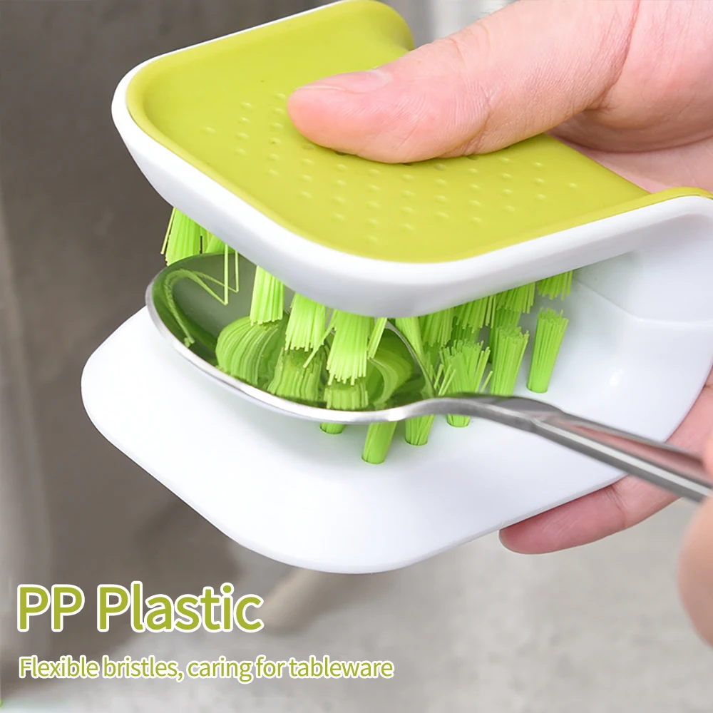 - Soft, flexible bristles are arranged along the curved surface, allowing gentle yet effective scrubbing on different surfaces including metal, plastic, and ceramic without scratches.