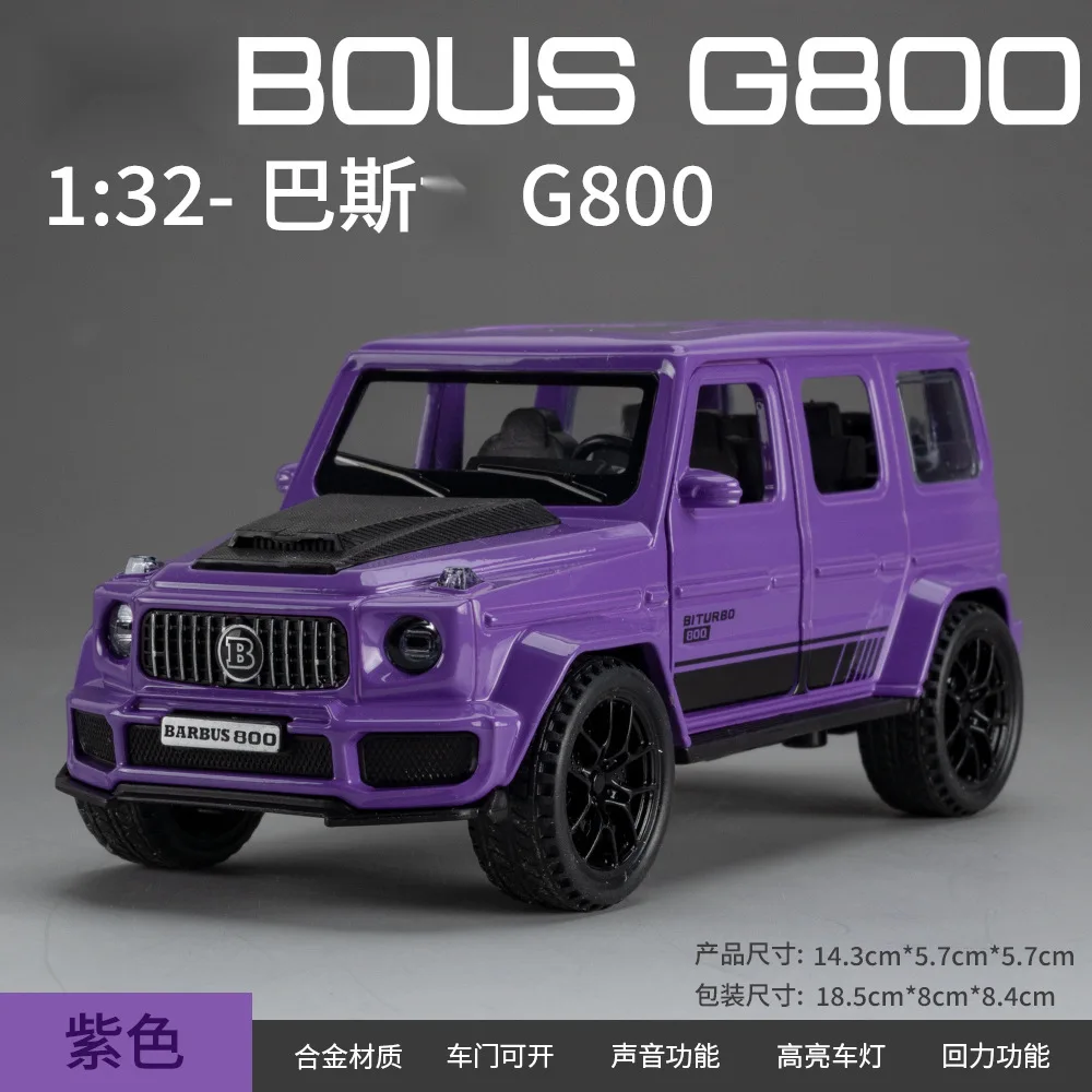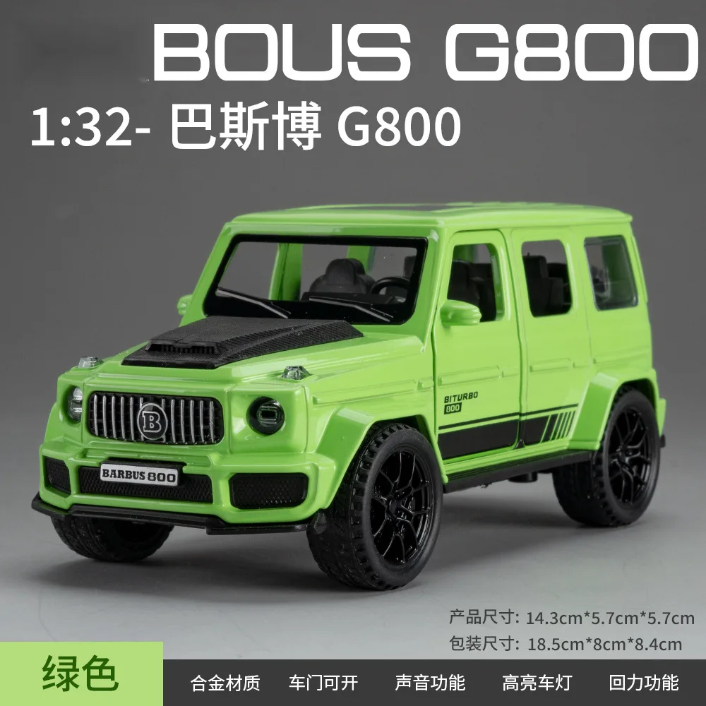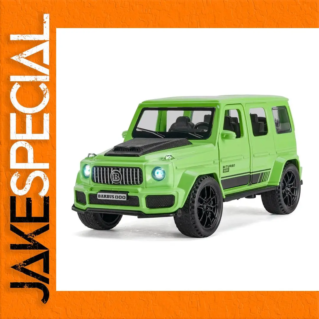 Step into the world of adventure with this detailed 1:32 scale off-road SUV toy model. Crafted from durable diecast metal, this replica vividly captures the rugged spirit of a real off-road vehicle. The bright green exterior is complemented by bold black accents, including a striking grille with vertical black bars, a textured hood decal, and large off-road tires with intricate spoke rims and deep treads. The vehicle features functional LED headlights that emit a bright white light, adding a modern, high-performance aesthetic. The transparent windows reveal a sleek black interior, including molded seats, steering wheel, and dashboard. Powered by a button battery, it includes sound and light functions, making it a captivating centerpiece for hobbies and collections. It creates an immersive experience for enthusiasts who want to visualize owning their own rugged off-road adventure.