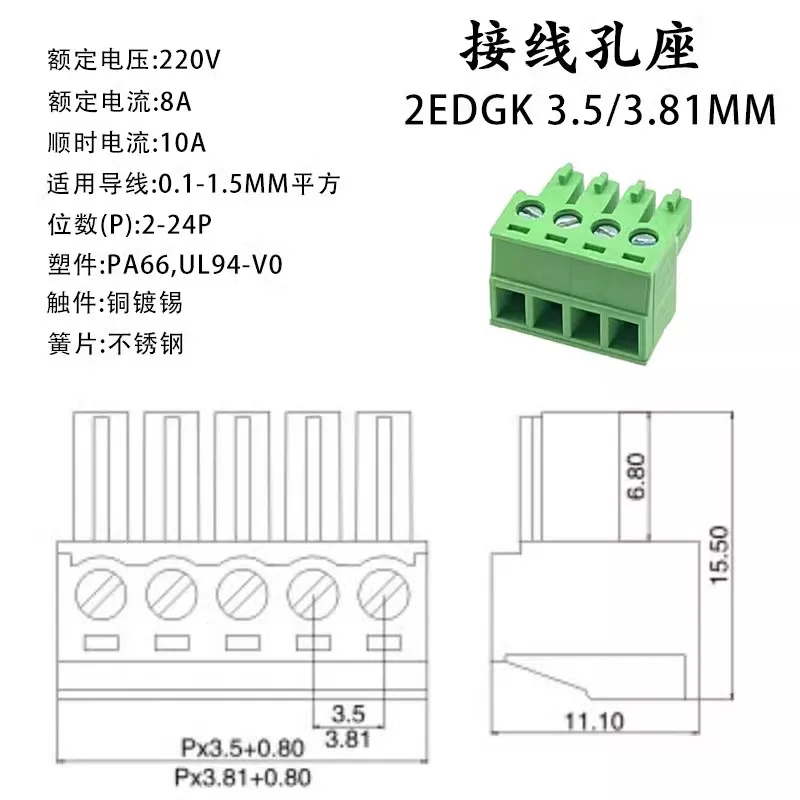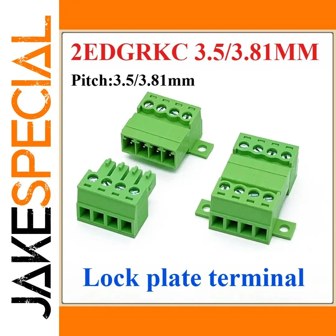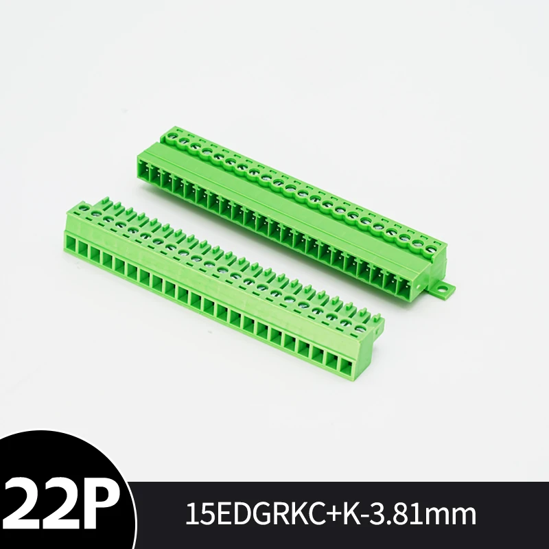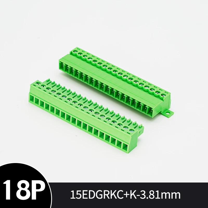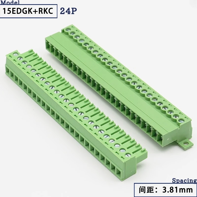 This secure and versatile solderless docking connector set features a plug-in design available in 3.5mm and 3.81mm pitch versions. It includes multiple pin configurations from 2P up to 24P, with bright green, modular rectangular housings that facilitate easy wiring and reliable connections. The connectors are equipped with exposed screw terminals on top for straightforward wire insertion and fastening, complemented by a sturdy mounting flange for secure installation. Designed for electrical and electronic applications, these connectors are CE and RoHS certified, ensuring a high-quality, chemical-free solution that combines practicality with durability. Perfect for organized, professional wire management efforts.