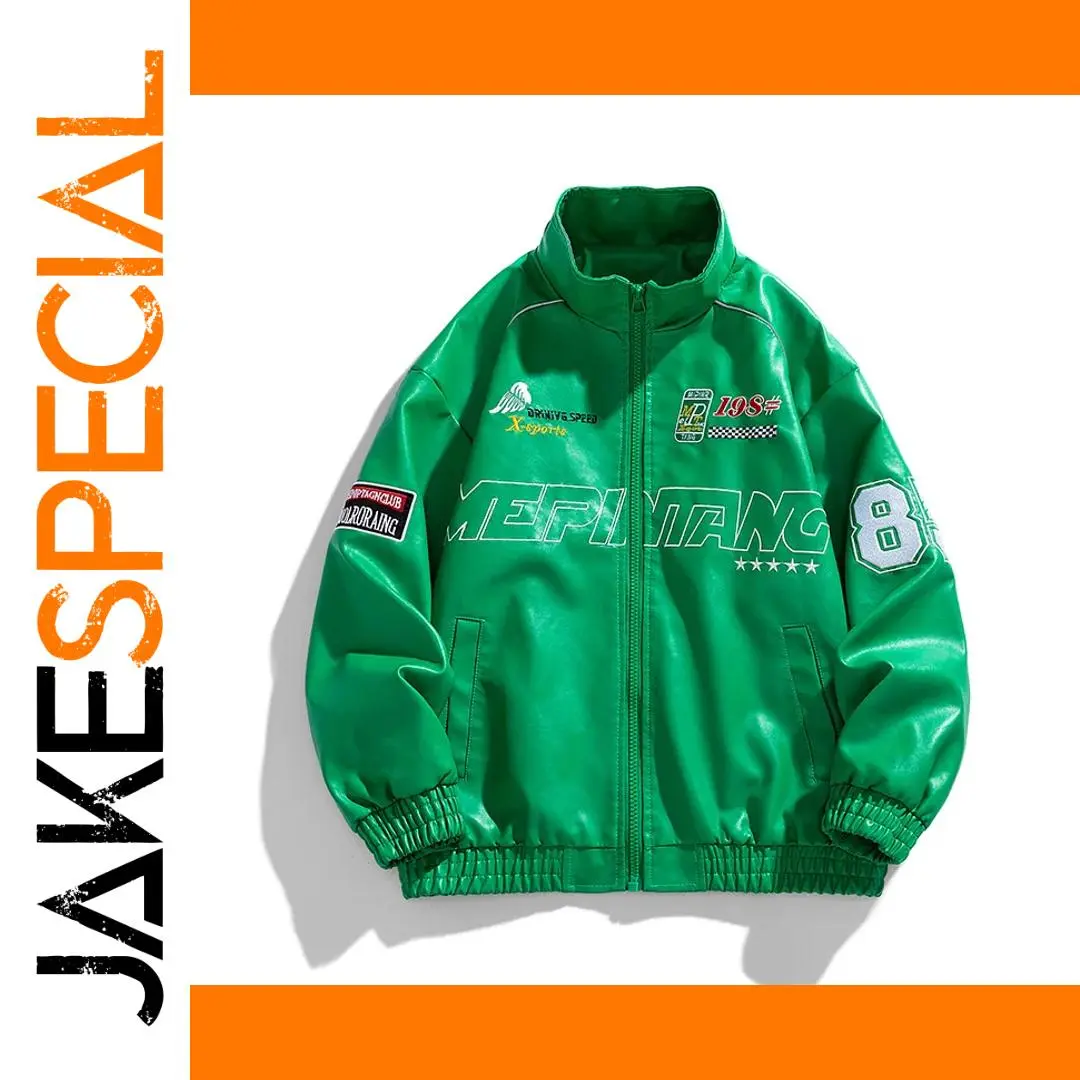 This vibrant green jacket combines style and functionality for a unique fashion statement. Crafted from shiny faux leather, it's designed with a sporty flair and tight-fitting features to enhance your silhouette. The high collar and full zipper provide custom ventilation, while the front boldly displays “MEPI TANG” in striking white lettering. An additional Racing Club patch on the sleeve and number “8 inches with stars add an authentic racing vibe. Elasticized cuffs and a gathered hem ensure a snug fit, essential for blocking wind during your adventures. Whether you’re hitting the streets or attending a motorsport event, this jacket is the perfect piece to elevate your outfit.