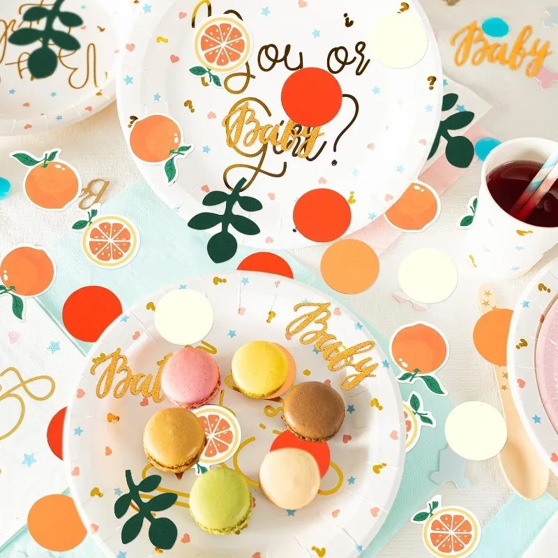 - Each confetti piece showcases detailed motifs, including realistic orange slices with segmented design, vibrant green leaves, and gold “Baby” accents that reflect light beautifully.