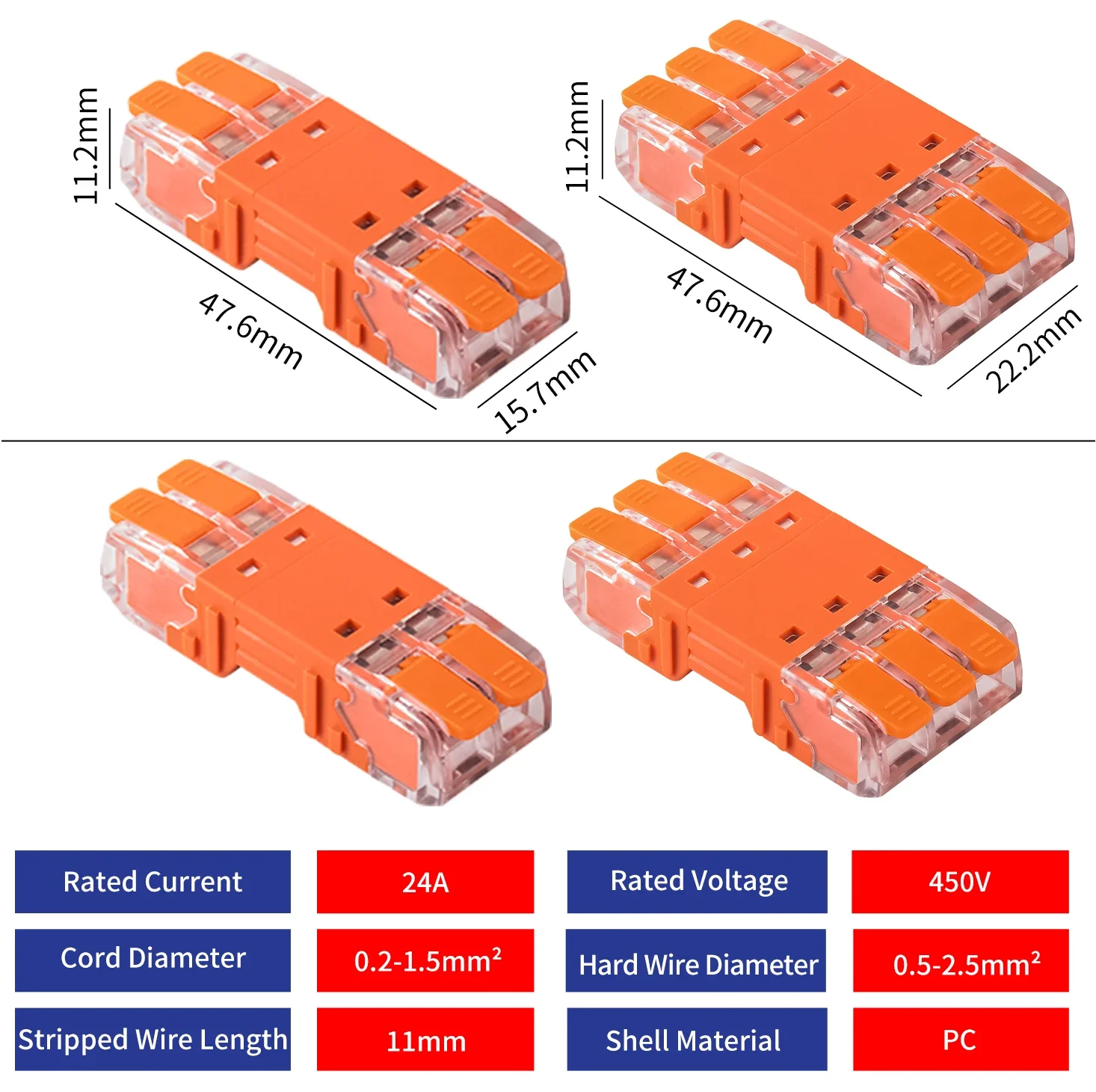 - Operational at up to 450V and rated at 24A, with a working temperature range from -40°C to 105°C; perfect for demanding electrical environments and heat conditions.