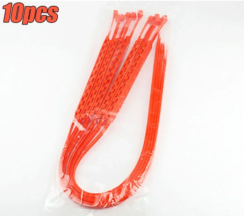Experience the confidence of driving safely in winter conditions with this set of bright orange tire anti-skid straps. Designed for quick, hassle-free emergency use, these flexible straps wrap securely around your tires to enhance traction on snow or ice. Their vivid color ensures high visibility, making it easier to locate and install them during emergencies. Made of durable rubber, each strap measures 93.5 cm in length and 2 cm in width, providing a snug fit on various vehicle tires. The textured surface with ridged patterns enhances grip, preventing slipping. Lightweight and disposable, these straps are perfect for sudden winter challenges, offering convenience and peace of mind when you need it most.