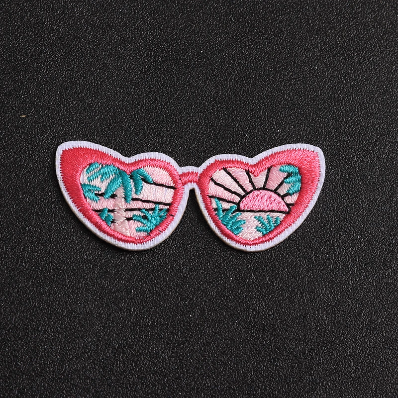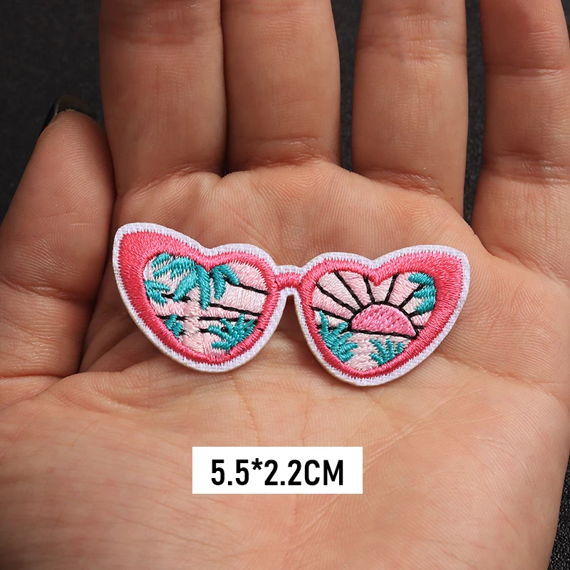 Transform your clothing and accessories with this playful set of five vibrant patches, each measuring 5.5 by 2.2 cm. Crafted from eco-friendly non-woven fabric, these patches feature detailed embroidery showcasing a pair of heart-shaped sunglasses outlined in bold pink. Inside each frame, an intricate tropical scene depicts a sunset or sunrise over shimmering waters, with silhouettes of palm trees on either side. The scene is embroidered with fine stitches, creating a textured 3D effect that adds depth and charm to your DIY projects. Perfect for customizing T-shirts, bags, curtains, or jackets, these patches turn ordinary items into eye-catching, beach-inspired fashion statements. Easy to apply, they're suitable for household irons and heat press machines.