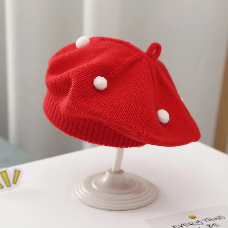Imagine dressing your little one in this cheerful, bright red beret that combines warmth, style, and comfort effortlessly. Crafted from high-quality cotton and cashmere, this soft, cozy hat provides excellent insulation against chilly weather, ideal for infants aged 0-1 year. Its lightweight design ensures your baby won't feel weighed down, while the snug fit keeps it securely in place through daily adventures, family outings, or special photo sessions. The rounded crown with a slightly slouched, relaxed fit offers a charming, casual look and a playful touch with tiny white pom-poms evenly spaced around the top. Adding a whimsical appeal is the small fabric loop at the center. This stylish accessory is perfect for keeping your baby warm and adorable all winter long, blending practicality and cuteness seamlessly.