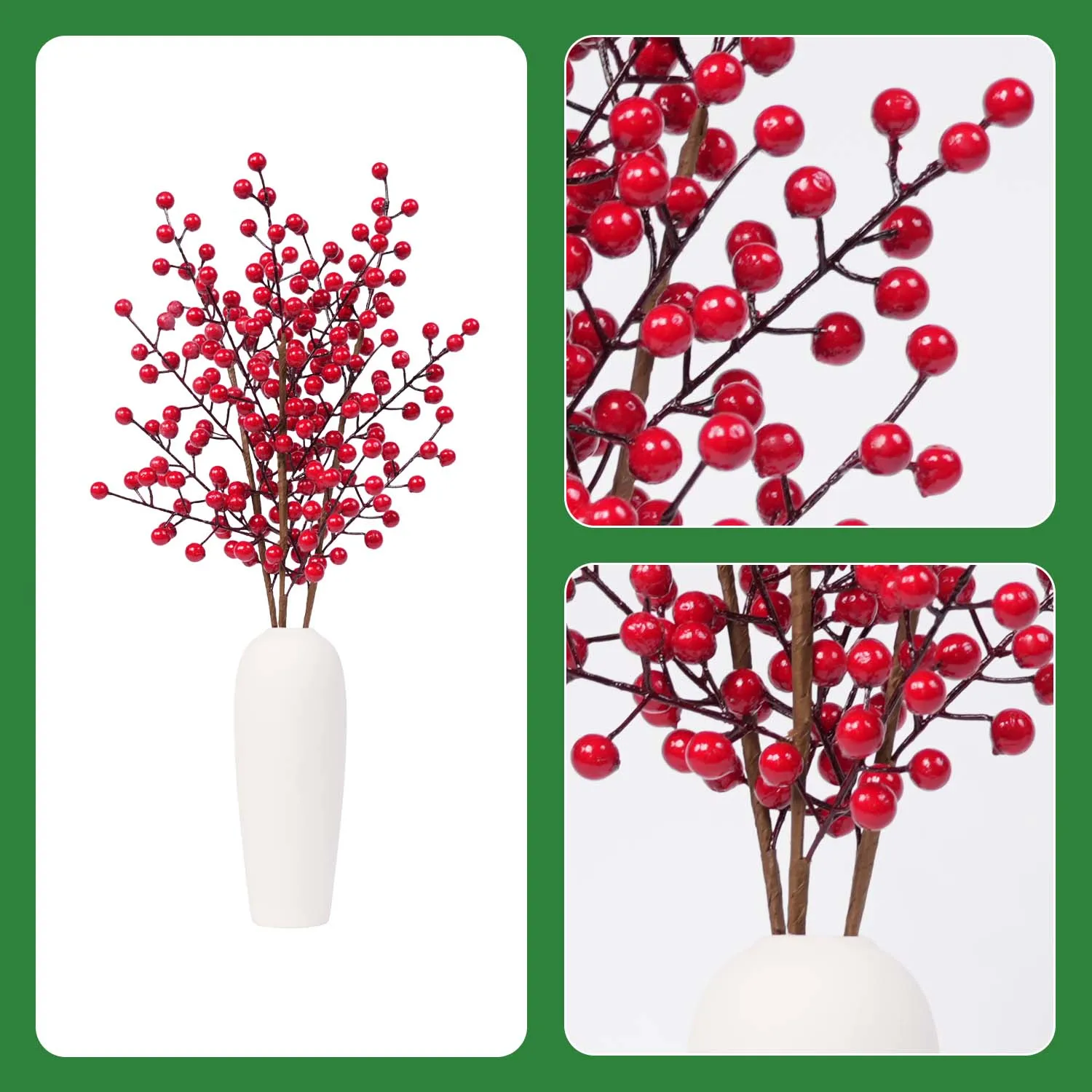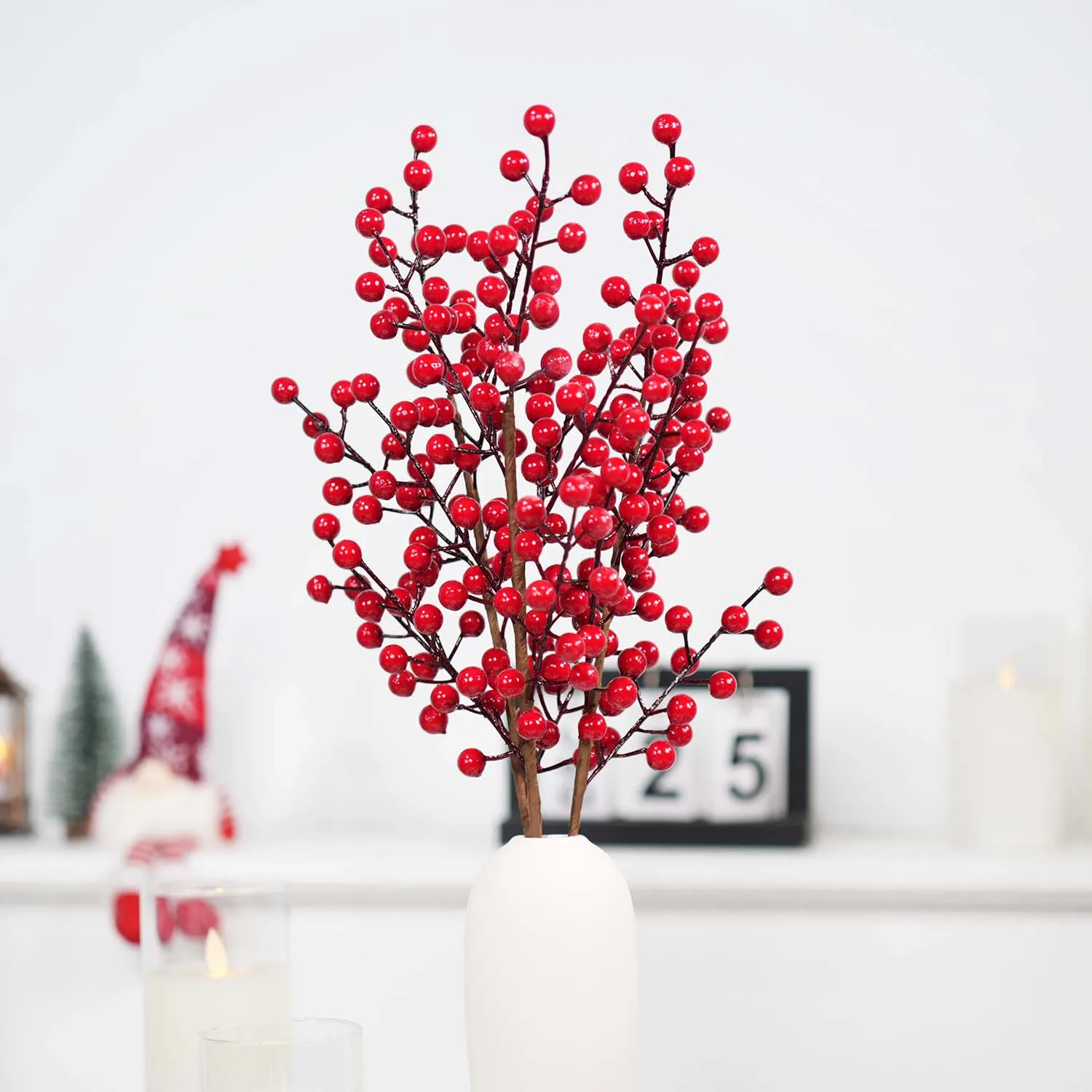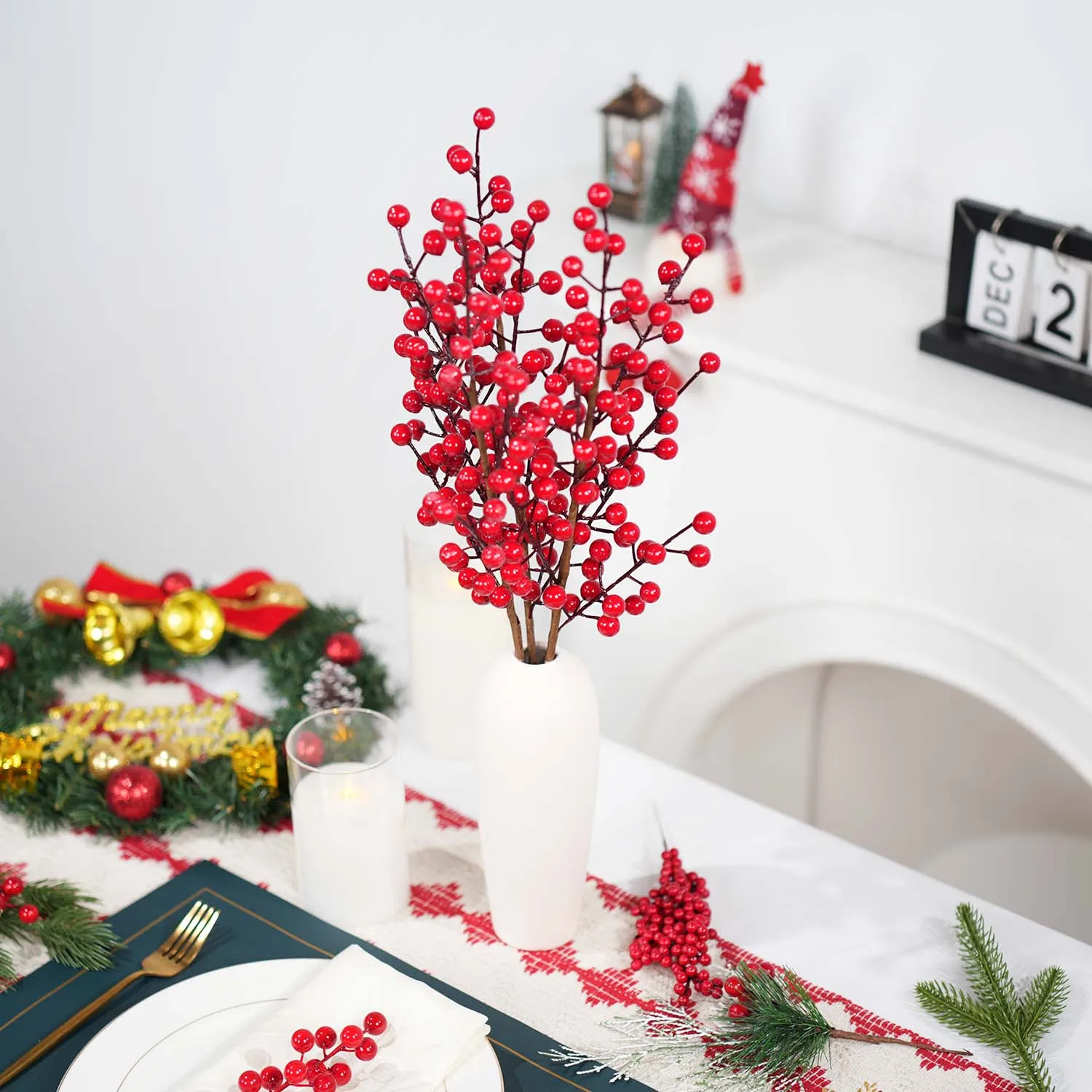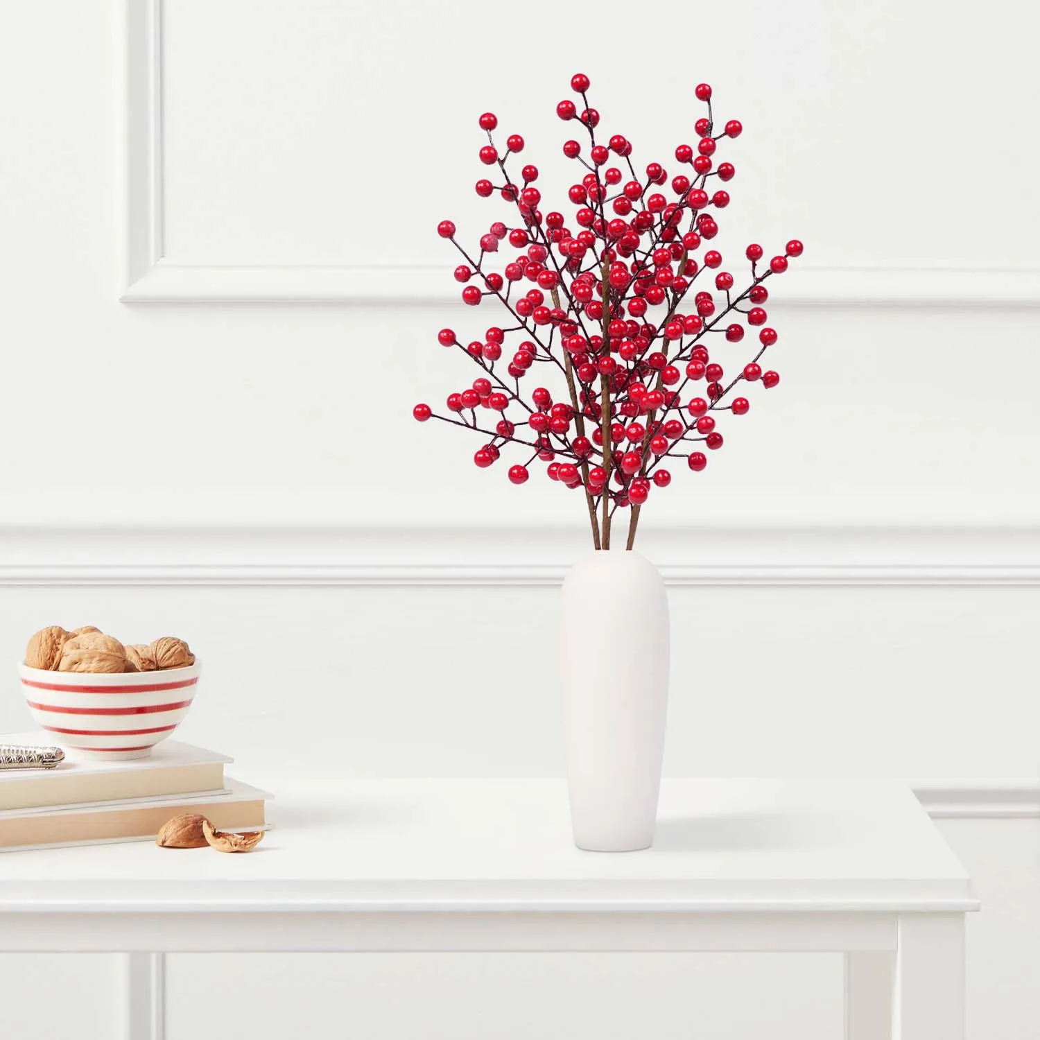 Enhance your festive ambiance with this 54cm artificial Christmas decoration featuring vibrant red berry branches and cherry stamen elements made of safe, durable plastic. Designed for indoor use, it’s perfect for Christmas, New Year, anniversaries, baby showers, birthdays, bridal showers, engagements, graduations, and housewarming celebrations. The arrangement showcases numerous glossy, bright red berries densely clustered on slender, dark brown stems, creating a lively, cheerful appearance. Placed in a sleek, tall, matte white vase with an elongated, rounded, slightly tapered shape, this minimalistic yet eye-catching piece offers a perfect blend of natural-inspired beauty and modern simplicity to elevate any home or event decor.