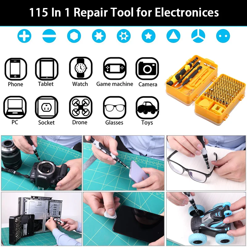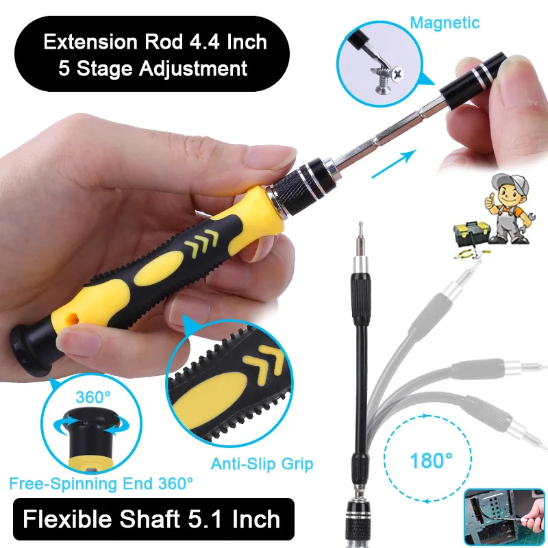 Experience the confidence that comes with owning this highly versatile yellow 115-in-1 precision screwdriver set. Its vibrant case and meticulously organized interior make repairs straightforward and efficient. Designed for professional and DIY repairs alike, this set features a wide range of stainless steel screwdriver bits, including Phillips, Torx, Hex, U-shape, Y-shape, and more, all with magnetic tips for secure handling. The handles are ergonomic and non-slip, ensuring comfort during extended use. Its dismountable, insulated design enhances safety and precision, making delicate repairs on electronics, smartphones, tablets, and home appliances seamless. Whether you're a technician or a hobbyist, this screwdriver kit elevates your repair game with quality, durability, and style.