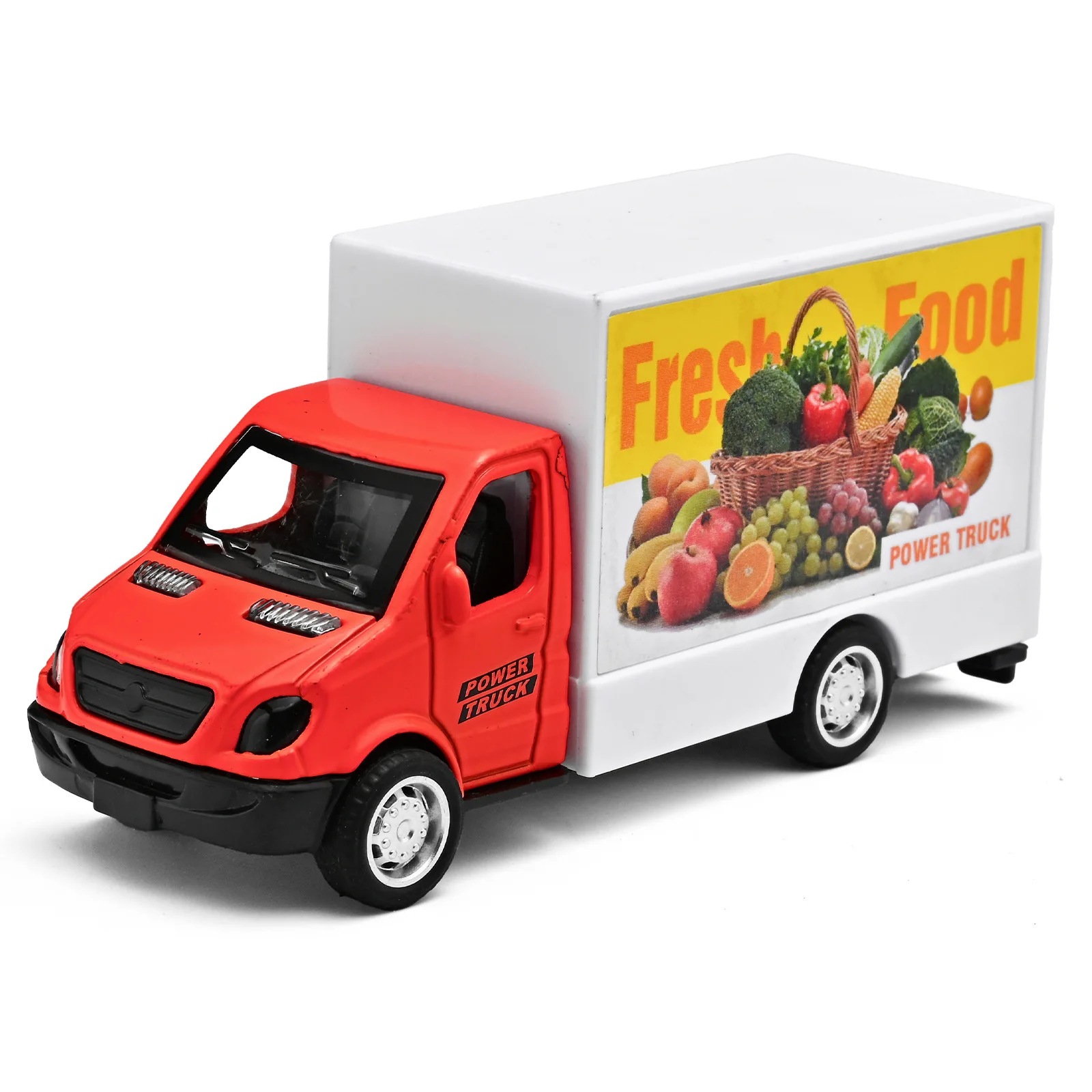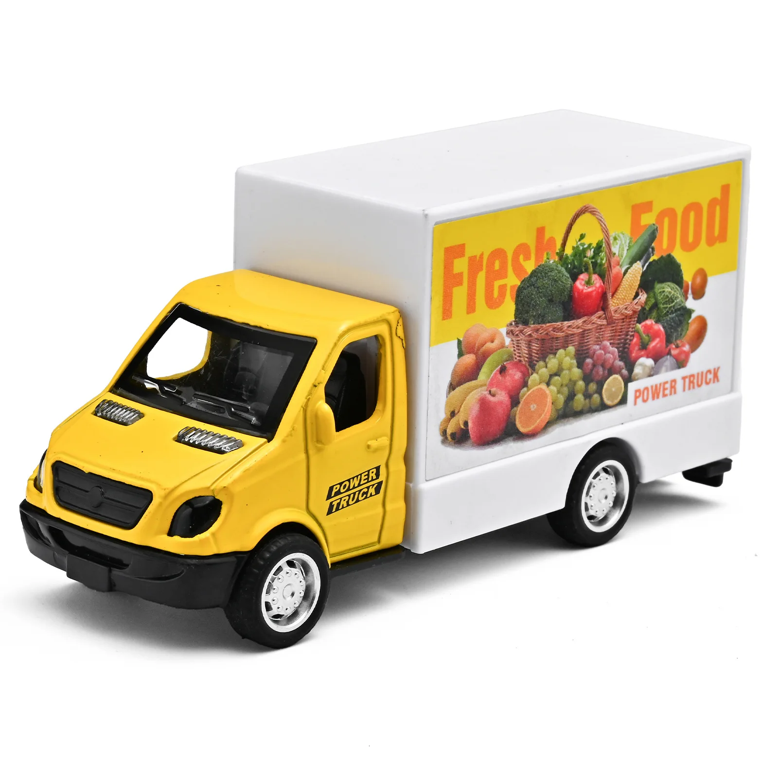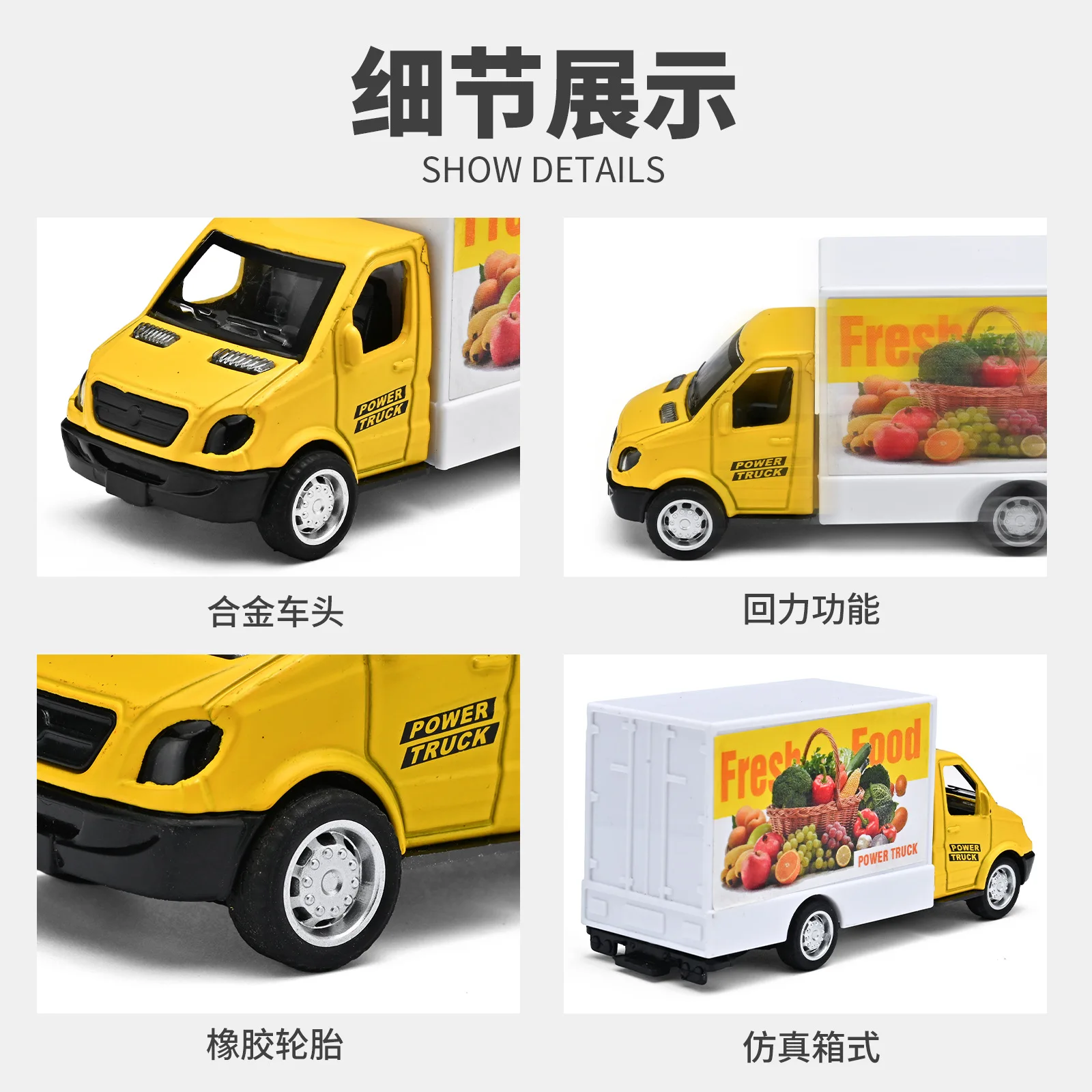 Discover this detailed 1:36 scale diecast alloy light truck hatchback model, crafted as a static ornament perfect for adult collectors and hobby enthusiasts aged 14 and above. The vibrant design features a bright yellow cab with black accents, transparent black windows, and realistic details like door handles, side mirrors, and hood vents. The rear cargo area displays a large white surface adorned with colorful fruit decals—grapes, apples, oranges, bananas—highlighted by bold “Fresh Food” orange lettering. Its compact, boxy shape combines lively colors with intricate textures, making it an eye-catching addition to any display. This non-electric, chemical-free model offers various color options, including versions with or without display boxes for versatile presentation.