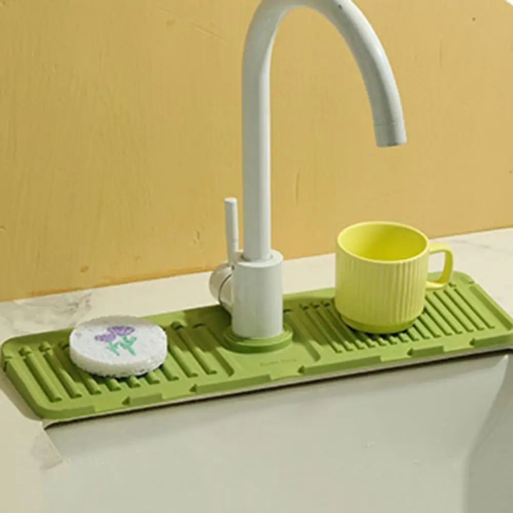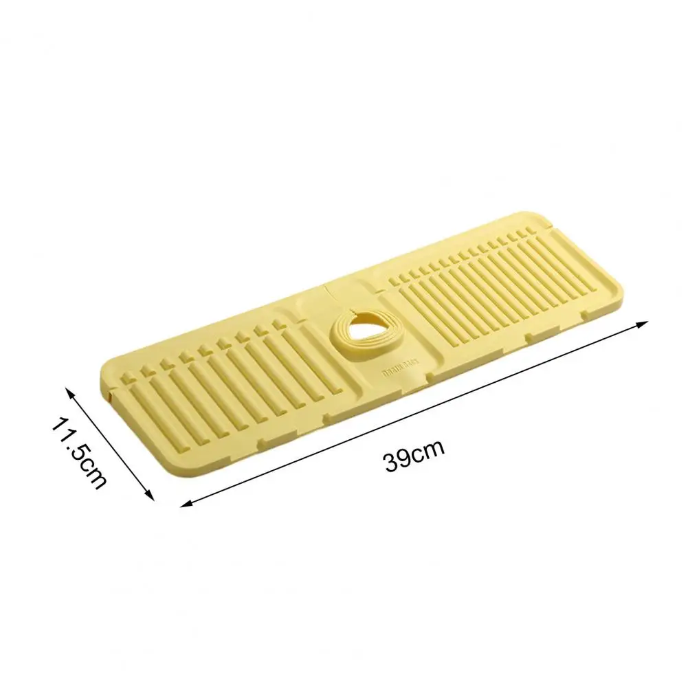 Experience the convenience and vibrant style of this yellow silicone faucet splash guard, designed to enhance your sink area. Its sleek, rectangular shape with smooth, rounded edges blends seamlessly into modern decor. The textured finish, featuring parallel ridges and small slots, promotes efficient water runoff and rapid drying, keeping your workspace clean and dry. The sloped design ensures water is diverted quickly into the sink, minimizing splashes and mess. Made from durable, flexible silicone, this splash guard maintains its shape under daily use, offering a non-slip, stable surface for dishes, cutlery, and glasses. Easy to install and clean, it’s a practical addition to your kitchen, bathroom, laundry, or bar sink.