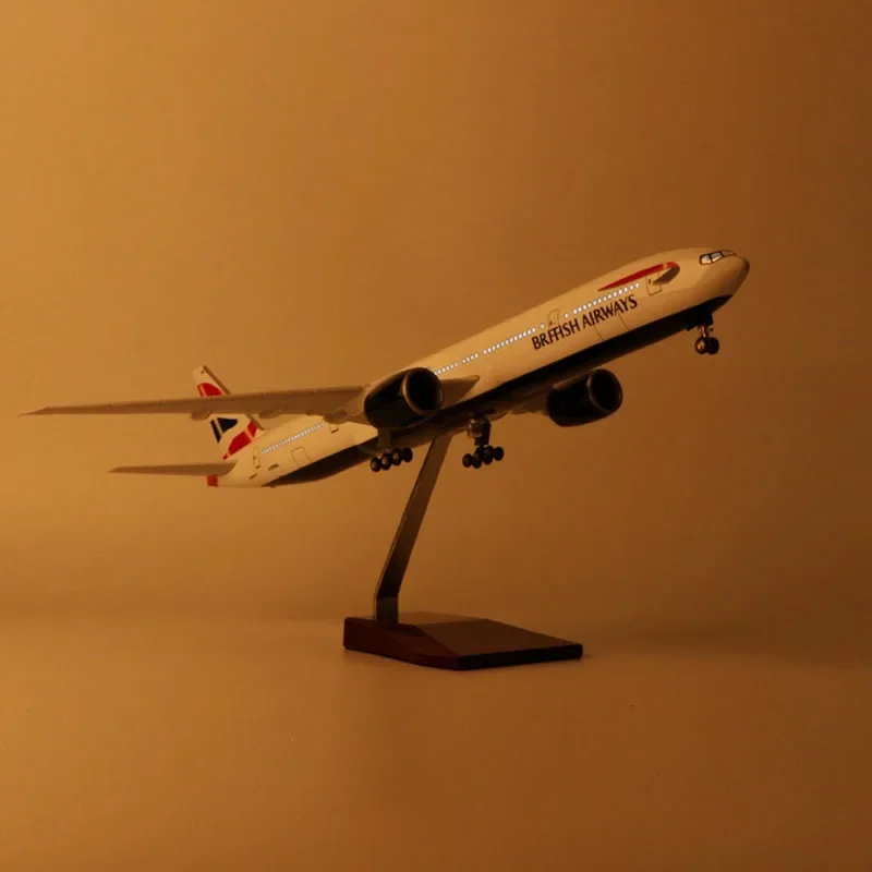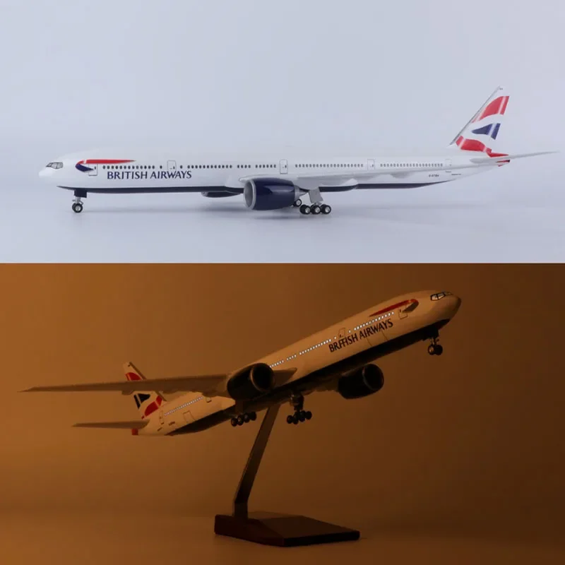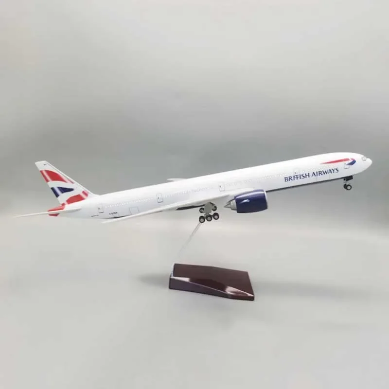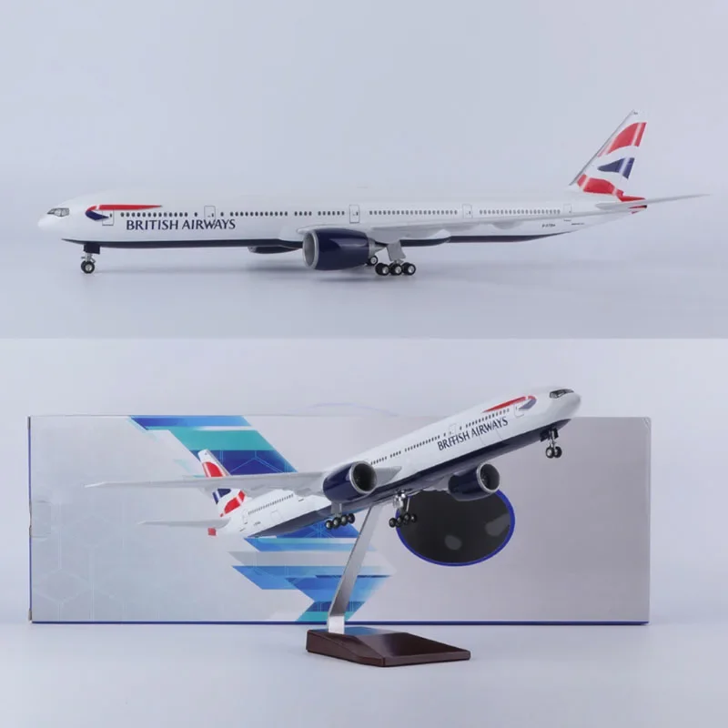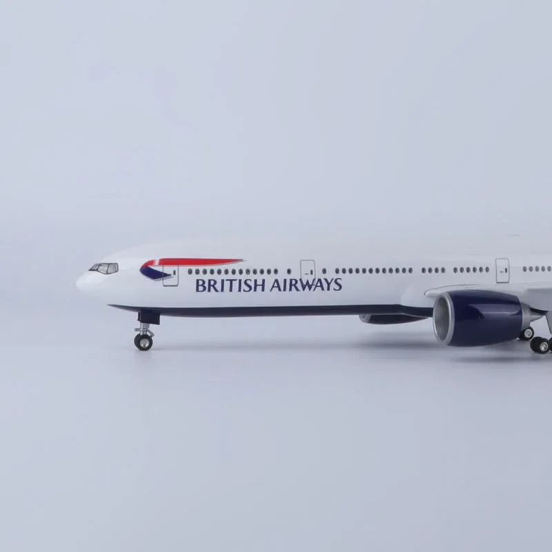 Bring home a stunning representation of modern aviation with this detailed British Airways Boeing 777 model. Crafted with precision, this resin aircraft measures approximately 47 centimeters in length and is scaled at 1:157. Its sleek, smooth surface showcases a crisp white fuselage accented with vibrant blue and red British Airways branding. The tail features a bold, stylized union flag emblem, complemented by blue accents on the tail fin and wingtips. The wings extend outward in sharp, clean lines, revealing detailed engine nacelles in metallic silver and jet-black highlights. Perfect for display purposes, this model embodies realism, craftsmanship, and style—adding a touch of elegance to your home or office decor.