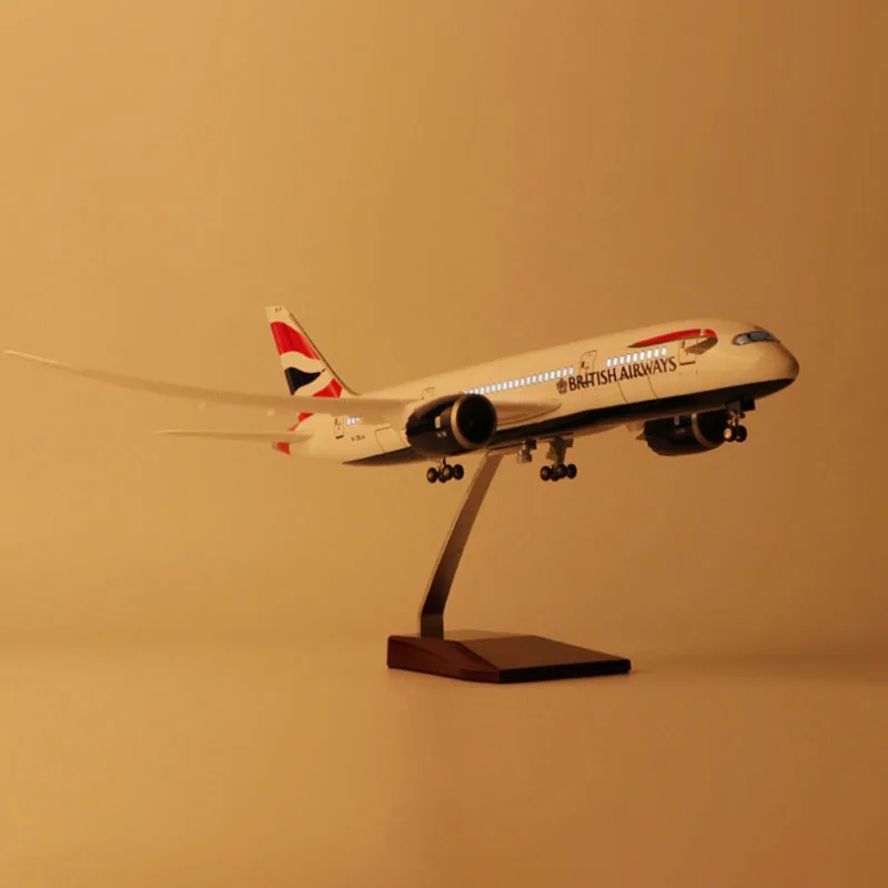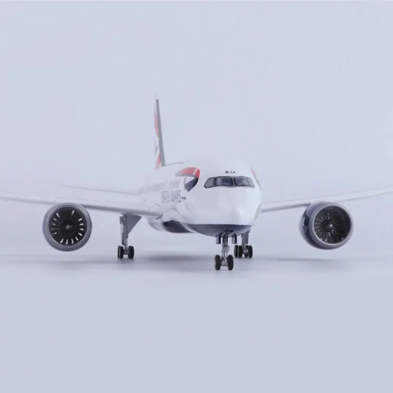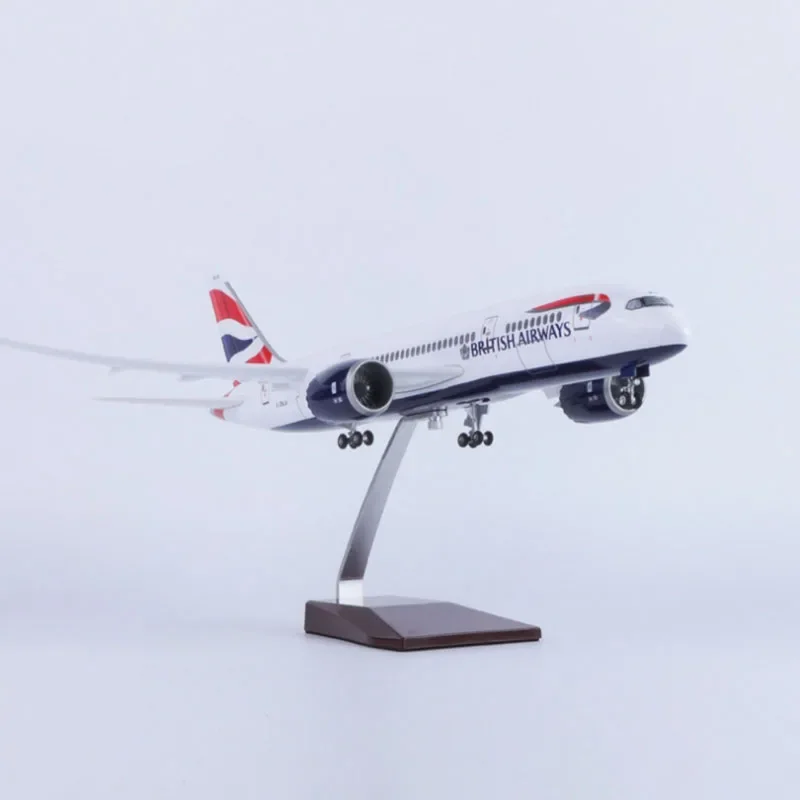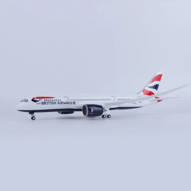 Immerse yourself in aviation excellence with this meticulously crafted 1/130 scale diecast resin model of the Boeing 787 Dreamliner in British Airways livery, measuring 43 cm in length. Featuring accurate details including a smoothly contoured white fuselage, vibrant tail fin with stylized Union Jack, and realistic wing and engine designs, this model exudes sophistication. It comes with detachable wings and wheels for easy shipping and assembly, and includes a voice-controlled cabin light that operates for approximately 20 seconds per use—battery recharge required. Crafted for display, it’s perfect for aviation enthusiasts aged 14 and above, showcasing a highly detailed, realistic miniature of this iconic aircraft.