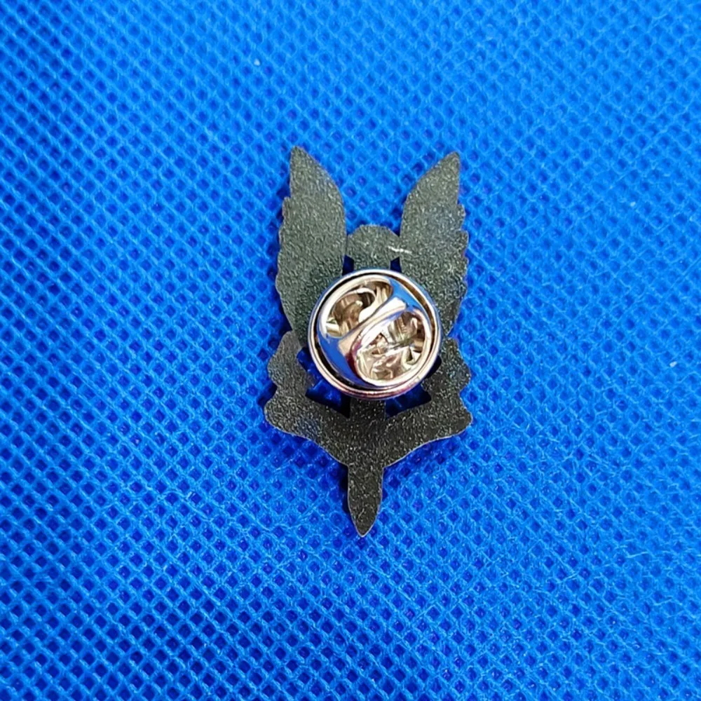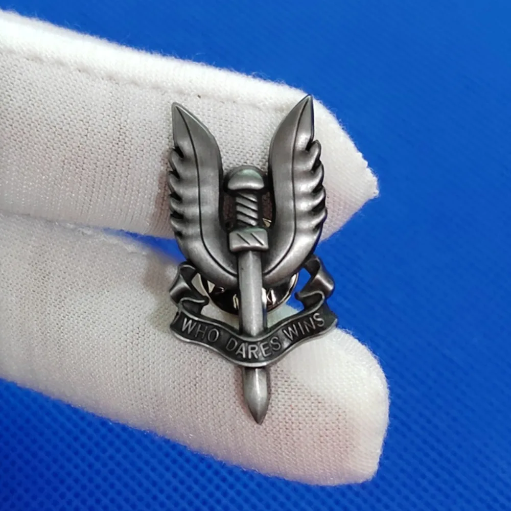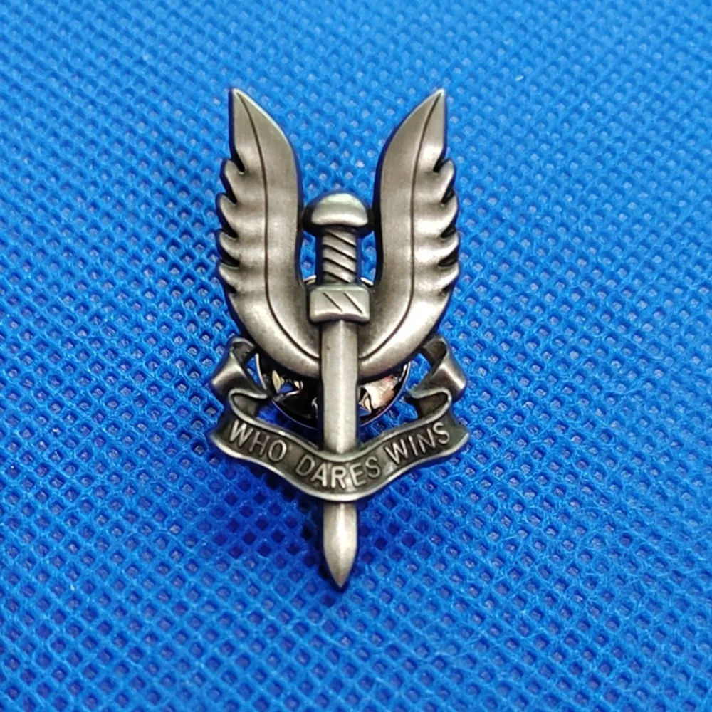 The British Army Special Air Service “Who Dares Wins” metal badge pin is an impressive embodiment of retro military style. Measuring approximately 3.5 cm in height and 2 cm in width, this badge features a striking winged emblem with a textured sword at its center. The muted silver color, with a slightly brushed finish, enhances its vintage aesthetics. Inscribed with the powerful phrase “WHO DARES WINS” on a curved central banner, this badge showcases military heritage and is perfect for embellishing jackets, backpacks, hats, or your next DIY project.