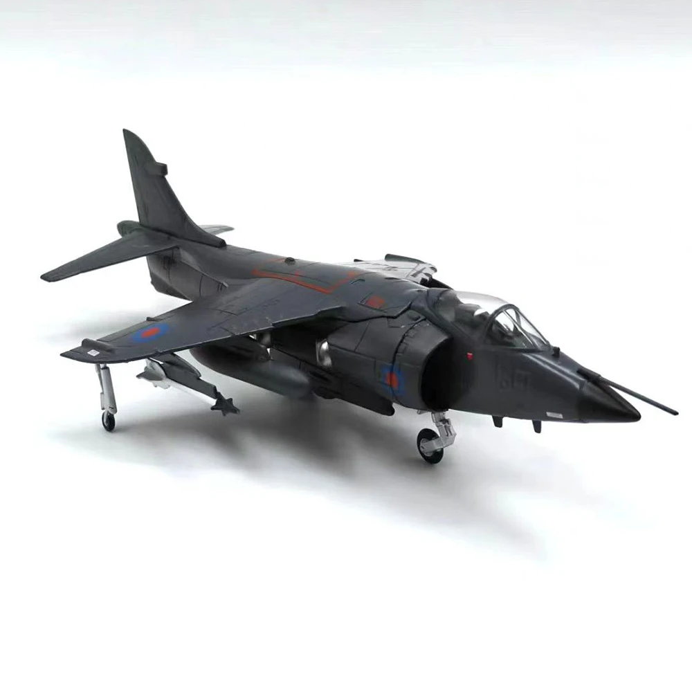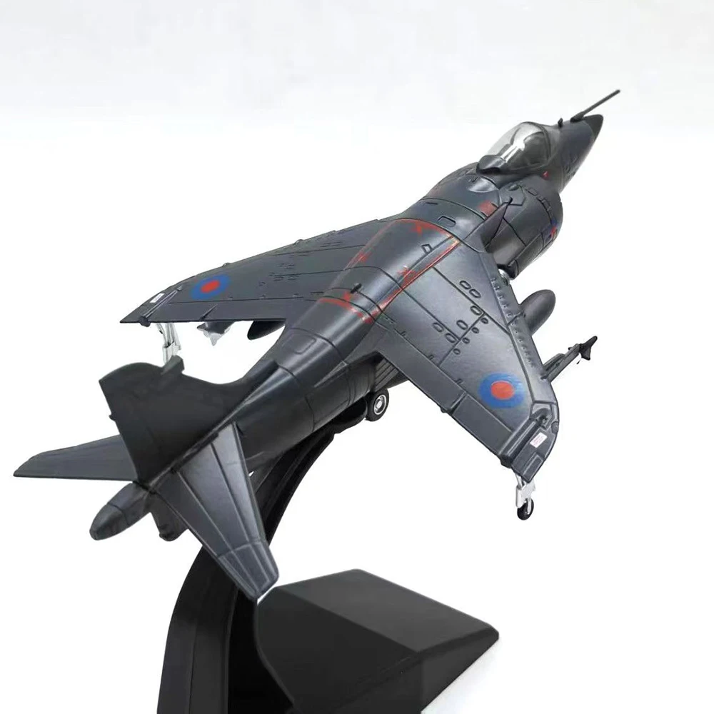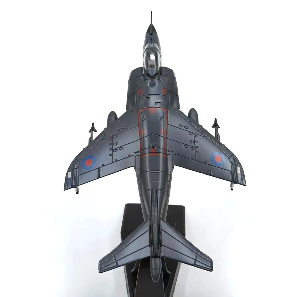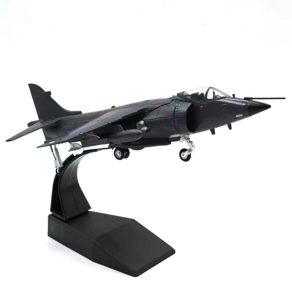 Enhance your collection with this detailed 1:72 scale British Harrier fighter aircraft model, crafted from die-cast alloy, plastic, and rubber. Featuring a sleek black finish accented by subtle red and blue details, it captures the dynamic, aerodynamic silhouette of a jet fighter with finely molded panel lines, vents, and intakes. The transparent cockpit canopy reveals interior details, while small weapon mounts add realism. Mounted on a black display stand, this static model is perfect for decoration, gifting, and hobbies. Please note minor paint flaws; suitable for collectors aged 14 and above. An impressive and realistic miniature for any aviation enthusiast.