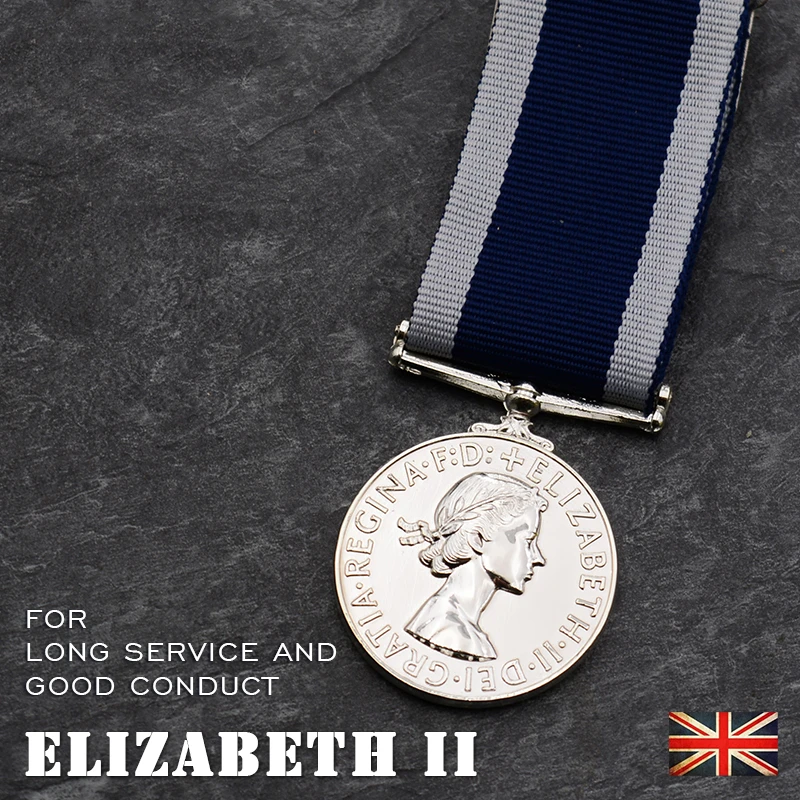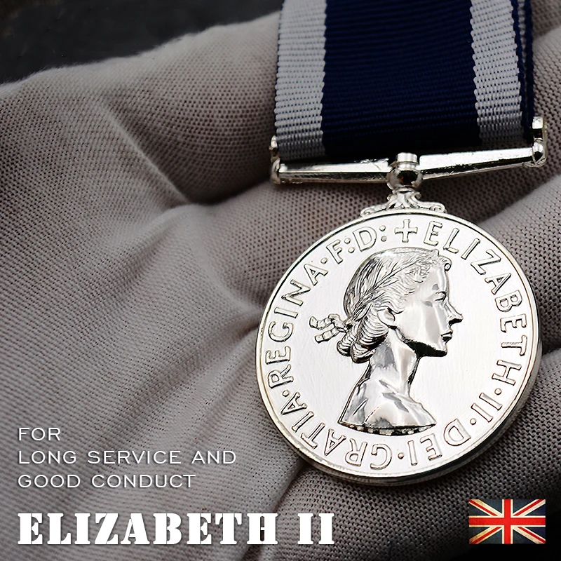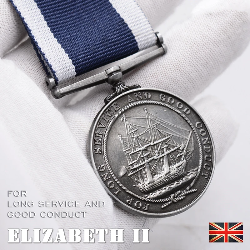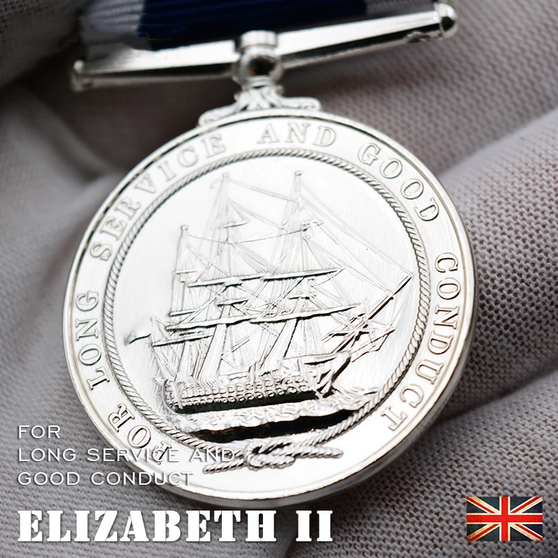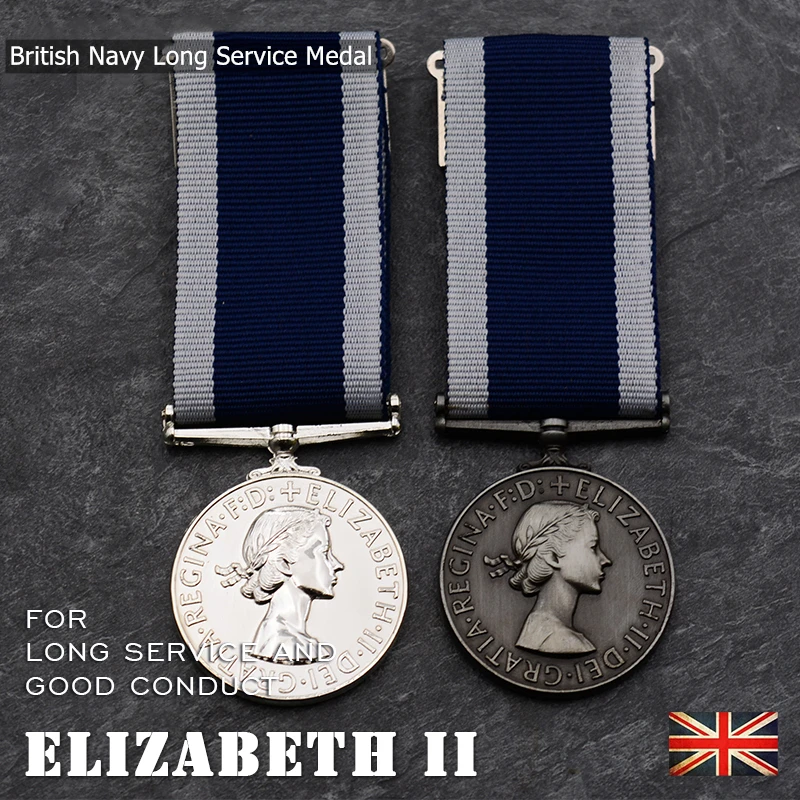 Imagine owning a piece of naval history with this stunning British Navy Long Service Medal depicting Queen Elizabeth II. Crafted from high-quality metal, this medal boasts a polished, shiny surface that captures light beautifully. The circular design features a detailed relief portrait of Queen Elizabeth II facing right, with perfectly engraved features and neatly styled hair tied with a ribbon. Encircling her profile, the bold inscription “ELIZABETH II DEI REGINA FID DEF” adds a regal touch. Attached to a wide woven ribbon with sharp stripes of dark blue and white, the medal exudes patriotism and dignity. Its European-inspired craftsmanship ensures durability and an elegant appearance suitable for display or collection. This historic piece is perfect for enthusiasts seeking distinguished memorabilia.
