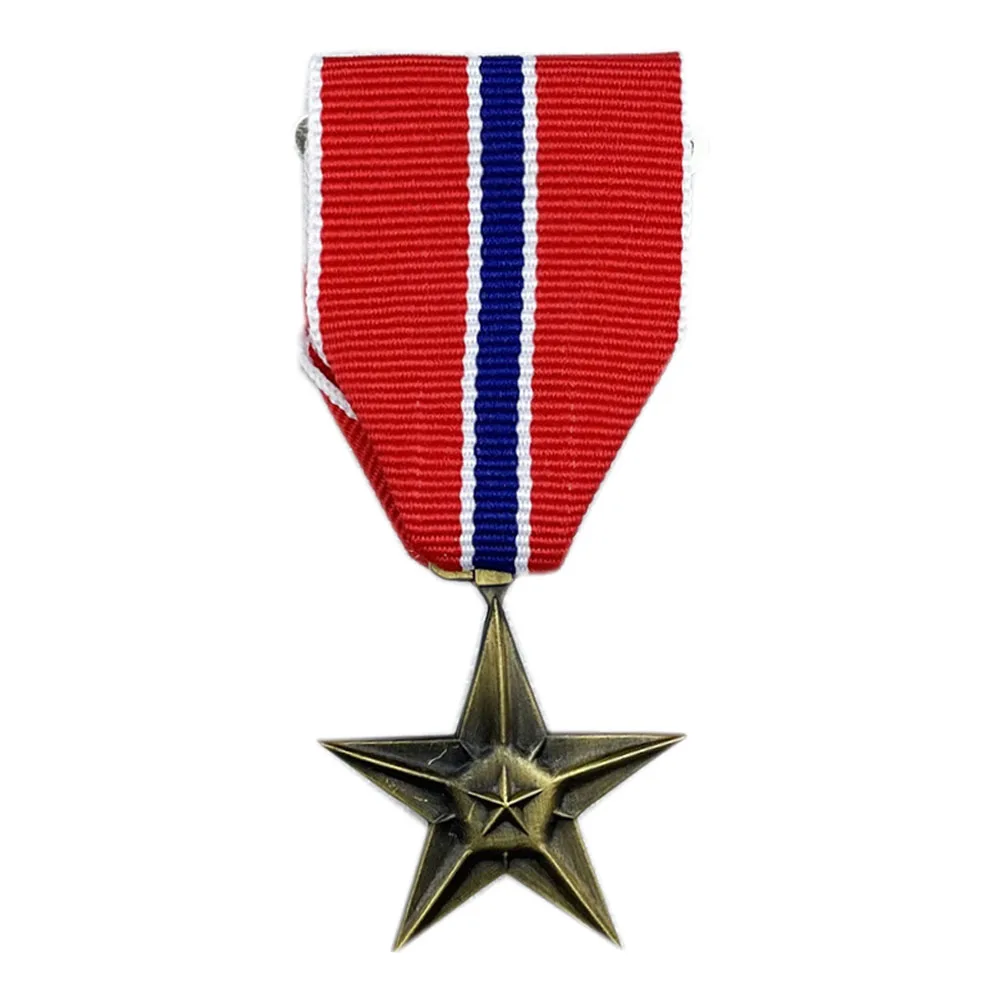 The Bronze Star military medal imitation is crafted from a durable metal alloy, embodying a rich bronze color with a polished finish. Its striking five-pointed star design is three-dimensional, reflecting meticulous craftsmanship. The medal is attached to a textured ribbon, primarily red, featuring a blue and white stripe in the center, suitable for both males and females. This retro and military-styled piece is not only a commemorative adornment but also versatile, perfect for attaching to jackets, backpacks, or hats, adding a touch of patriotic flair to any ensemble.