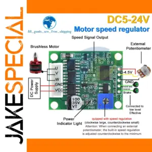 This compact, high-performance circuit board is designed to efficiently control 3-phase brushless DC motors. Featuring a vibrant green PCB, it boasts a sleek and modern industrial style with bold black terminal blocks and a striking blue potentiometer. The layout emphasizes functionality with clearly labeled connection points for motor wires, power supply, and signal output, making installation straightforward. Its eye-catching colors and clean design ensure easy identification of components like the electrolytic capacitor and control IC. Whether you’re building a robotic project or upgrading an existing motor system, this board offers reliable, precise speed regulation within a 6-20V range. Its technical aesthetic appeals both to hobbyists and professionals seeking performance and visual clarity.