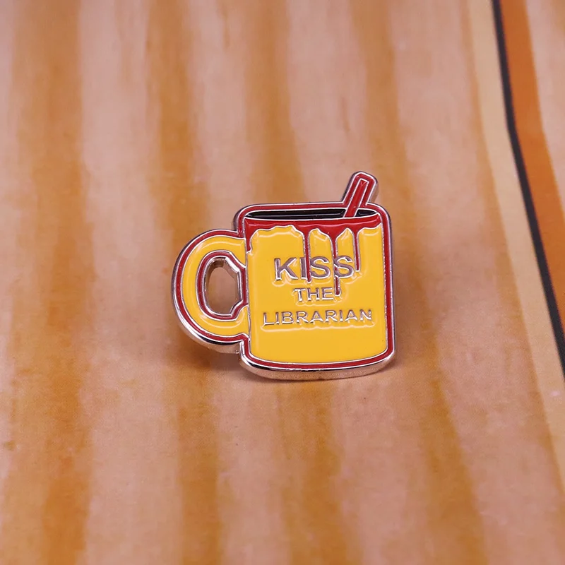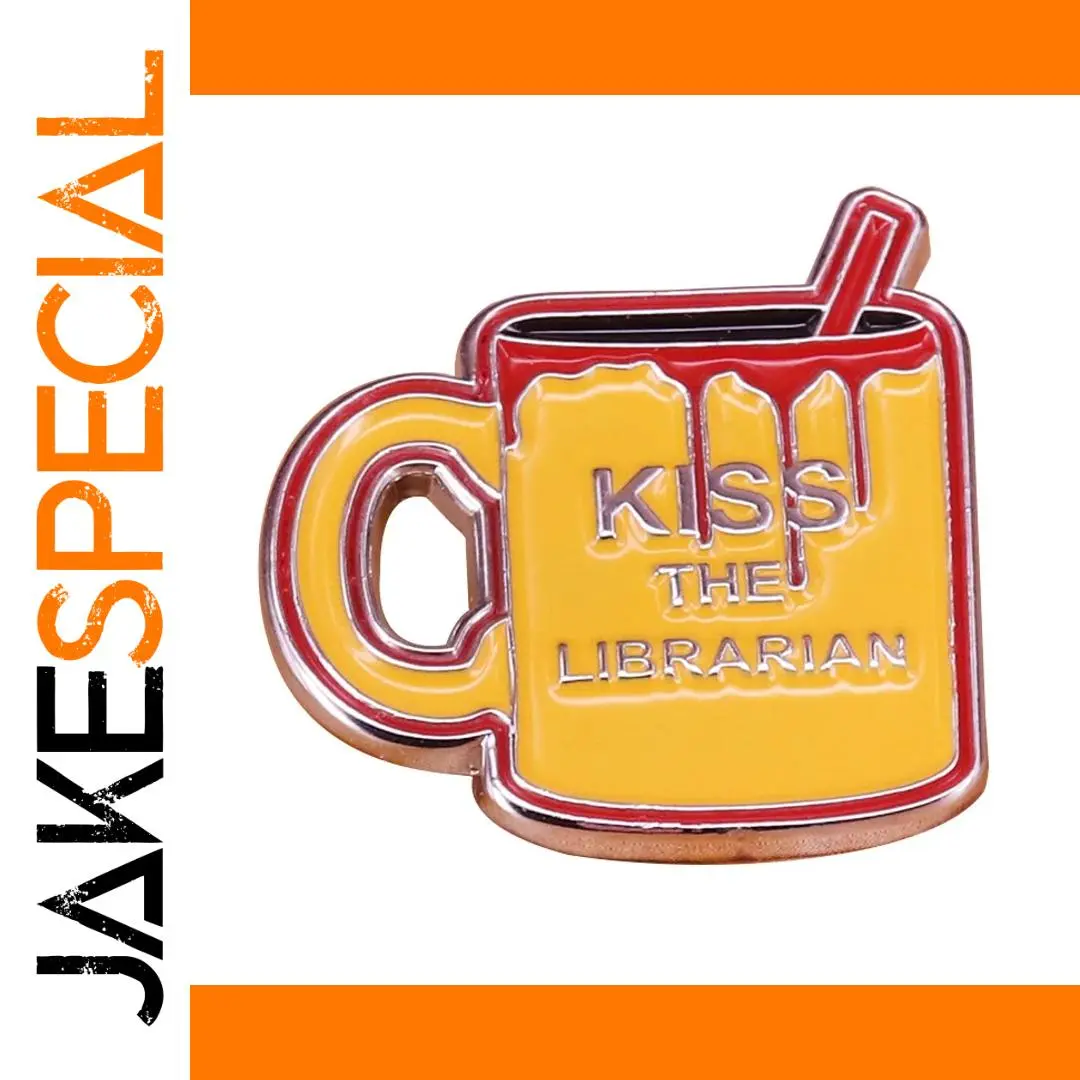 Add a bold, eye-catching accessory to your collection with this blood-themed enamel pin badge measuring approximately 30 mm. Crafted from durable copper and finished with a glossy enamel coating, it features a striking design with a vibrant red beverage inside a yellow coffee mug outlined in bold red, complemented by metallic silver “KISS THE LIBRARIAN” lettering. The badge’s playful style, retro aesthetic, and shiny surface make it perfect for everyday wear. Equipped with a secure metal butterfly clasp on the back, this unisex pin is ideal for fans of pop culture, librarians, or those who enjoy unique, colorful accents.